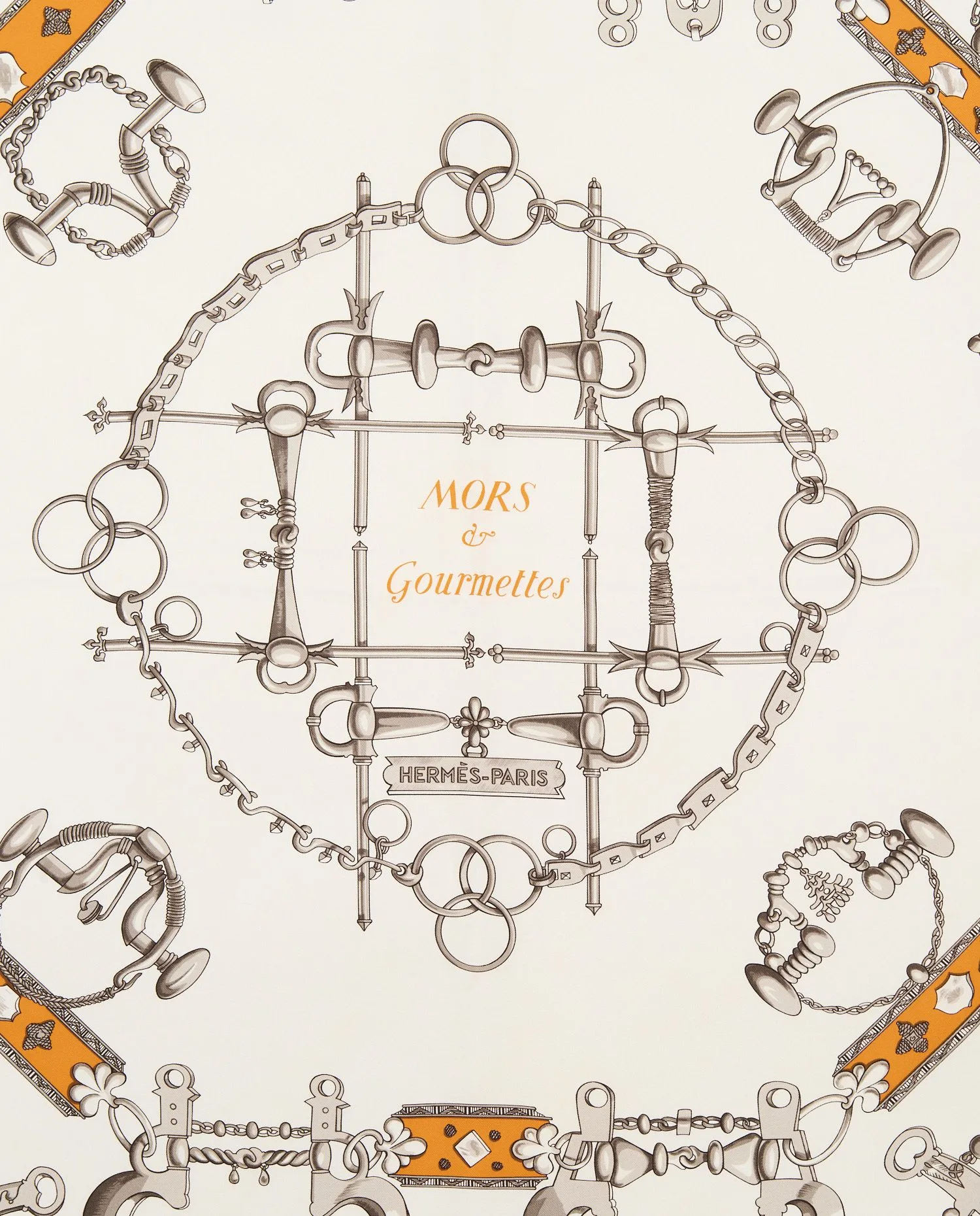 Réalisé en twill de soie, le tissu présente un tissage diagonal serré offrant résistance et fluidité. Le fond crème met en valeur des dessins brun sépia aux ombrages délicats, créant un effet de relief subtil sur les pièces métalliques représentées. Les touches d’orange Hermès, franches et lumineuses, rythment la composition et soulignent certaines gourmettes décoratives. Cet orange intense, signature chromatique de la maison, confère au carré une présence visuelle forte tout en restant facile à associer dans une garde-robe contemporaine. Les bordures sont roulottées à la main, avec un ourlet précis et régulier, caractéristique des carrés Hermès authentiques.