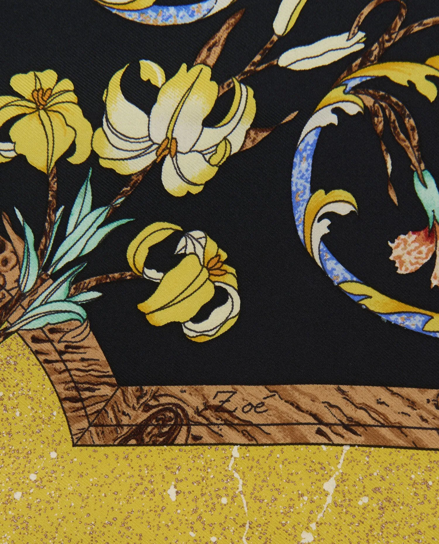 Le fond noir intensifie la luminosité des éléments floraux et aviaires. La bordure jaune, texturée et lumineuse, encadre la composition avec puissance et modernité. Les arabesques dorées structurent l’espace tandis que les oiseaux turquoise apportent mouvement et légèreté. Les détails des pétales, des fruits et des feuillages révèlent une impression fine et nuancée. Le roulotté main, signature du savoir-faire Hermès, est présent sur l’ensemble du carré ; une légère irrégularité est visible dans l’angle supérieur gauche, liée au passage du temps et à la vie naturelle d’une pièce vintage, sans incidence sur sa solidité ni sur son tombé.