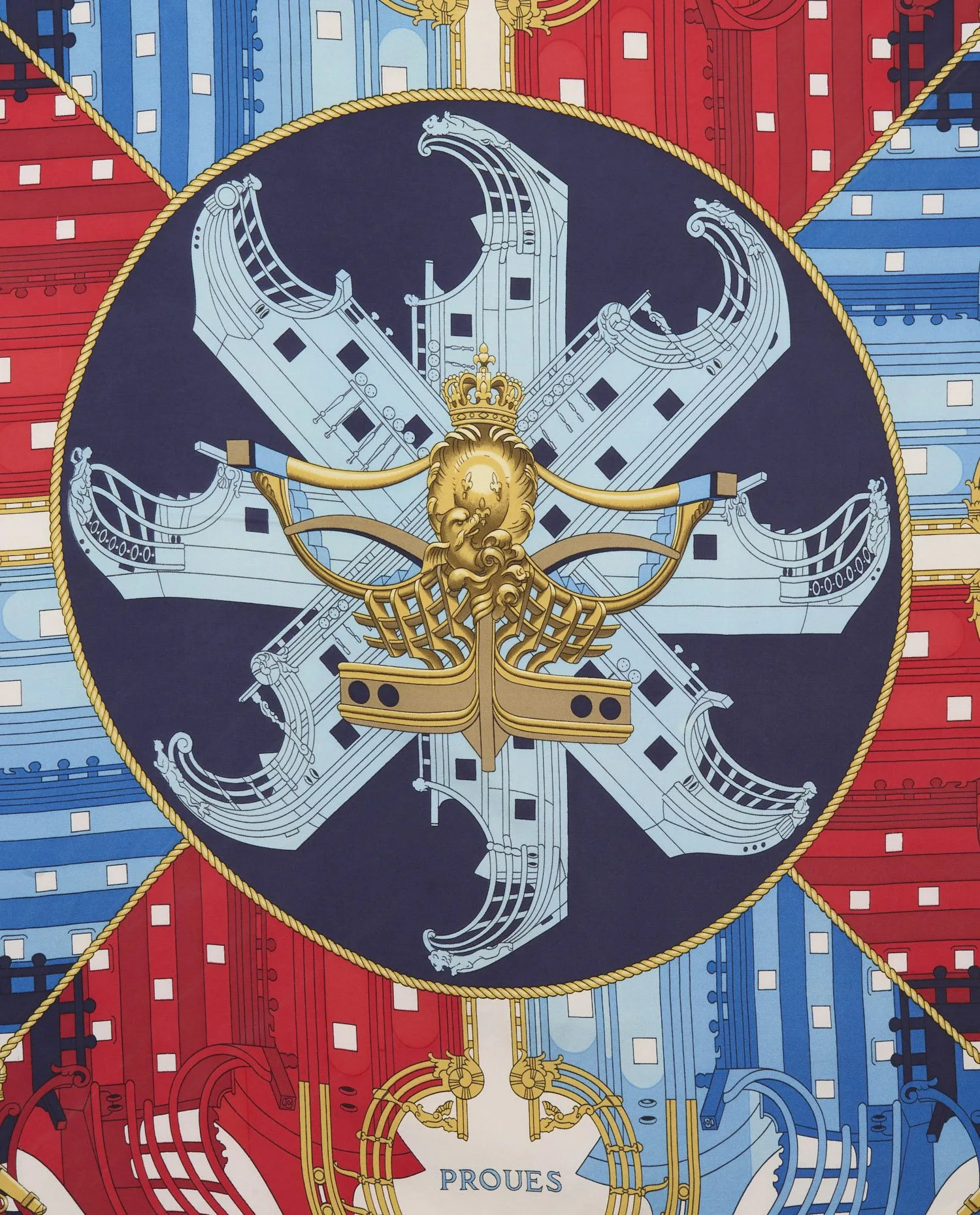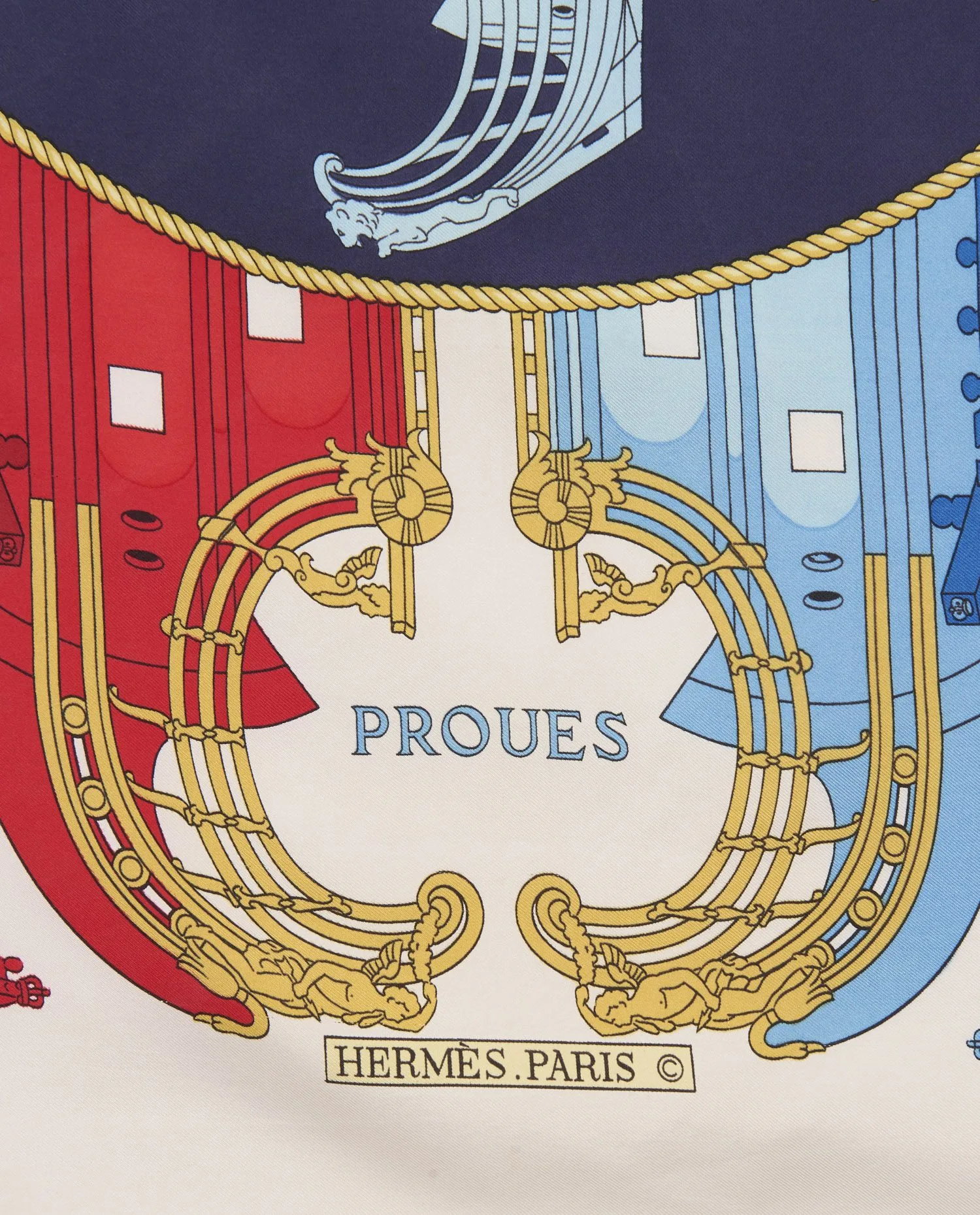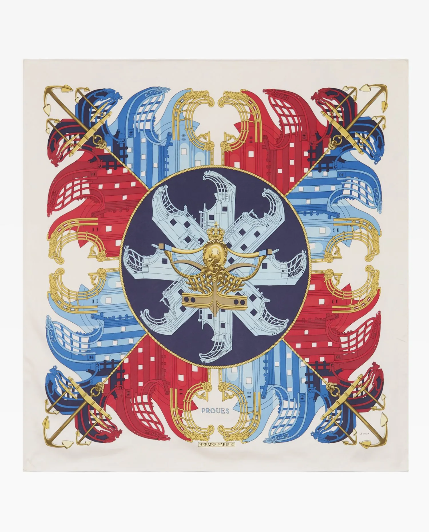 Créé par Philippe Ledoux, illustrateur emblématique d’Hermès à partir des années 1950, le carré Proues rend hommage à l’architecture navale, plus précisément aux ornements sculptés à la proue des galions et vaisseaux royaux des XVIIe et XVIIIe siècles. Le thème marin est une récurrence dans l’univers Hermès, en lien avec l’héritage du voyage et du monde équestre. Ce dessin, paru initialement en 1968, a connu plusieurs rééditions tant il incarne l’esthétique classique et symétrique chère à la maison.