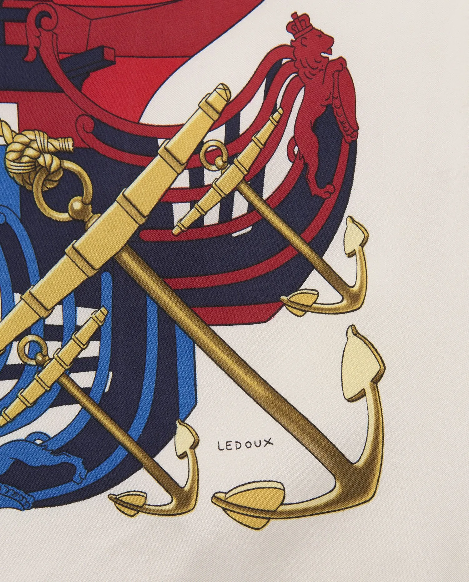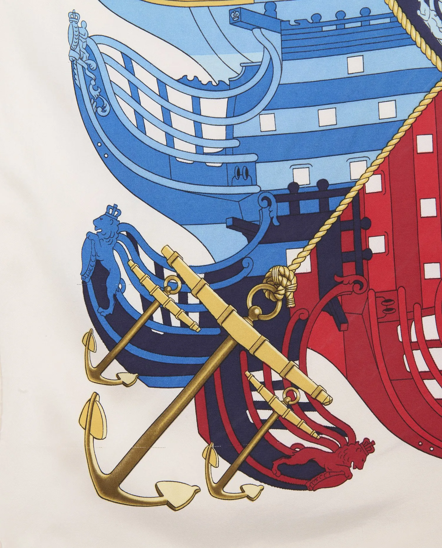 L’ensemble du carré est encadré par une corde dorée formant un cercle central et un contour décoratif. Chaque coin est orné d’ancres entrecroisées, soulignant le thème nautique. Les proues stylisées, minutieusement dessinées, alternent entre tons chauds (rouges et ors) et tons froids (bleus et blancs), créant un équilibre visuel saisissant. Le centre met en valeur un ornement royal doré sur fond marine, dominé par une figure de proue dorée et une couronne. Les bords sont roulottés à la main, selon la tradition Hermès. Le verso du carré révèle un envers plus mat avec un léger effet miroir du motif principal. La soie twill tissée présente une trame fine et régulière, garantissant une grande résistance tout en conservant sa légèreté et son tombé souple. Aucune doublure n’est nécessaire, la densité du tissu assurant une parfaite opacité au porté.