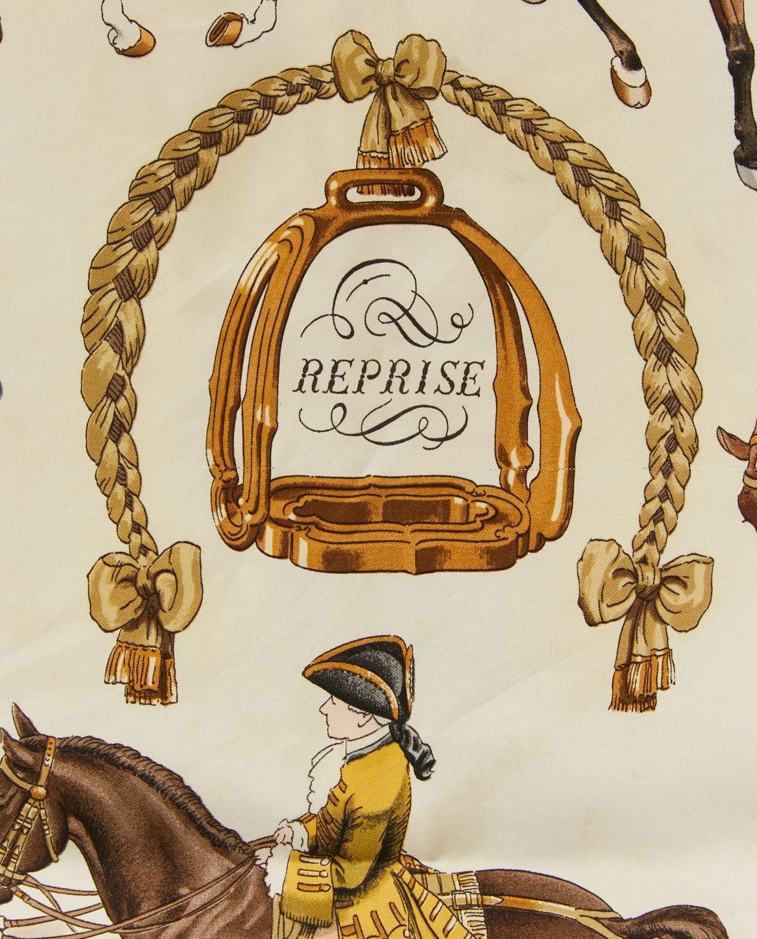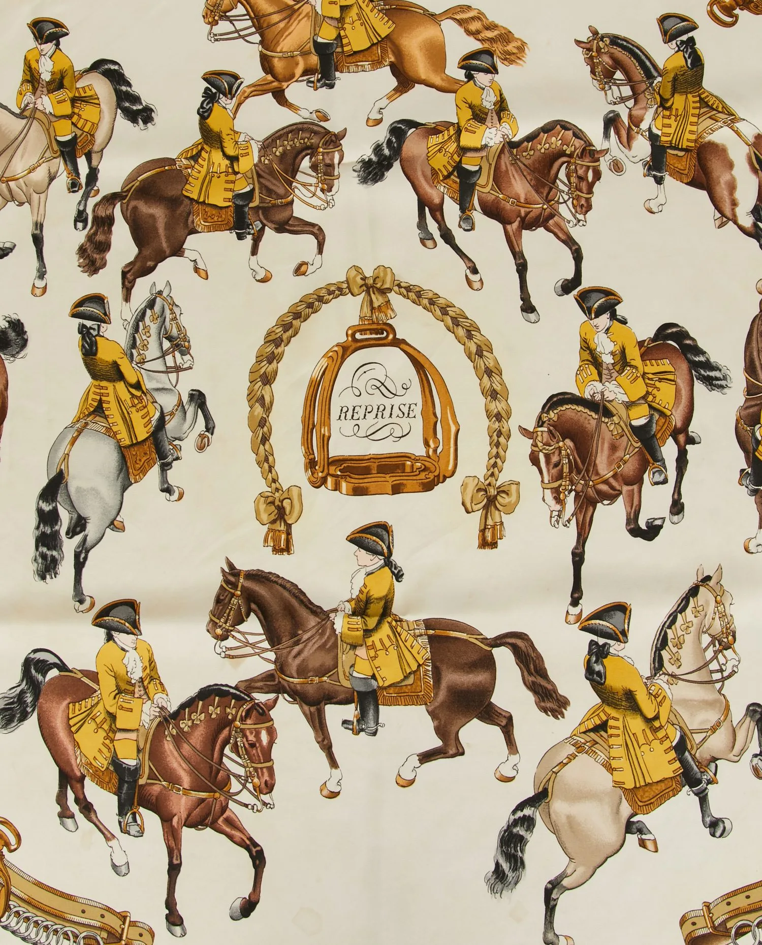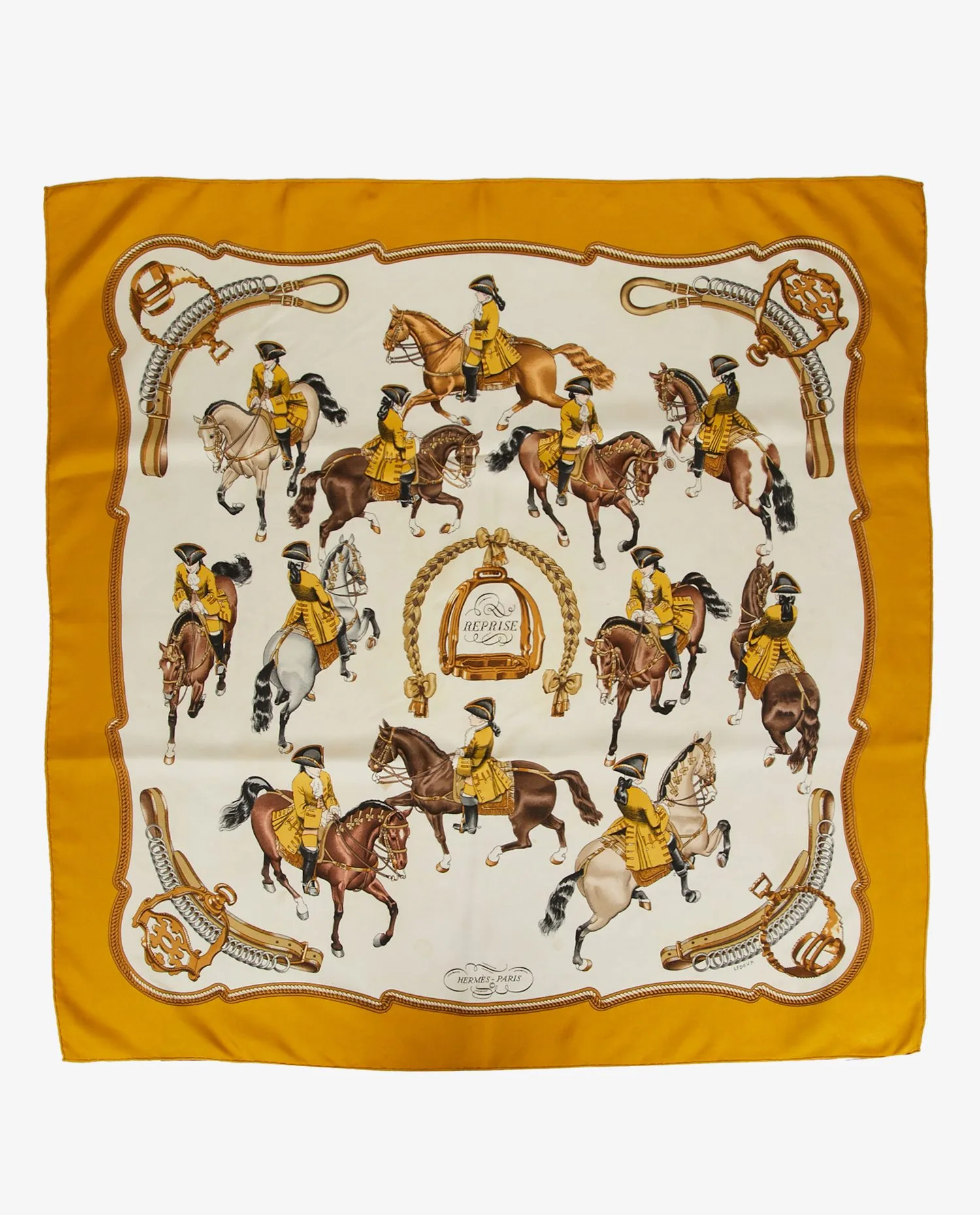Le foulard est réalisé en twill de soie, réputé pour son tombé fluide et son éclat subtil. Le motif central représente un étrier entouré d’une tresse ornée de nœuds, avec l’inscription « Reprise ». Autour, une scène dynamique de cavaliers et de chevaux exécutant des reprises équestres se déploie. La palette de couleurs mêle des tons chauds : marron, ocre, doré et crème, apportant profondeur et raffinement au dessin. La bordure jaune doré encadre harmonieusement l’ensemble.