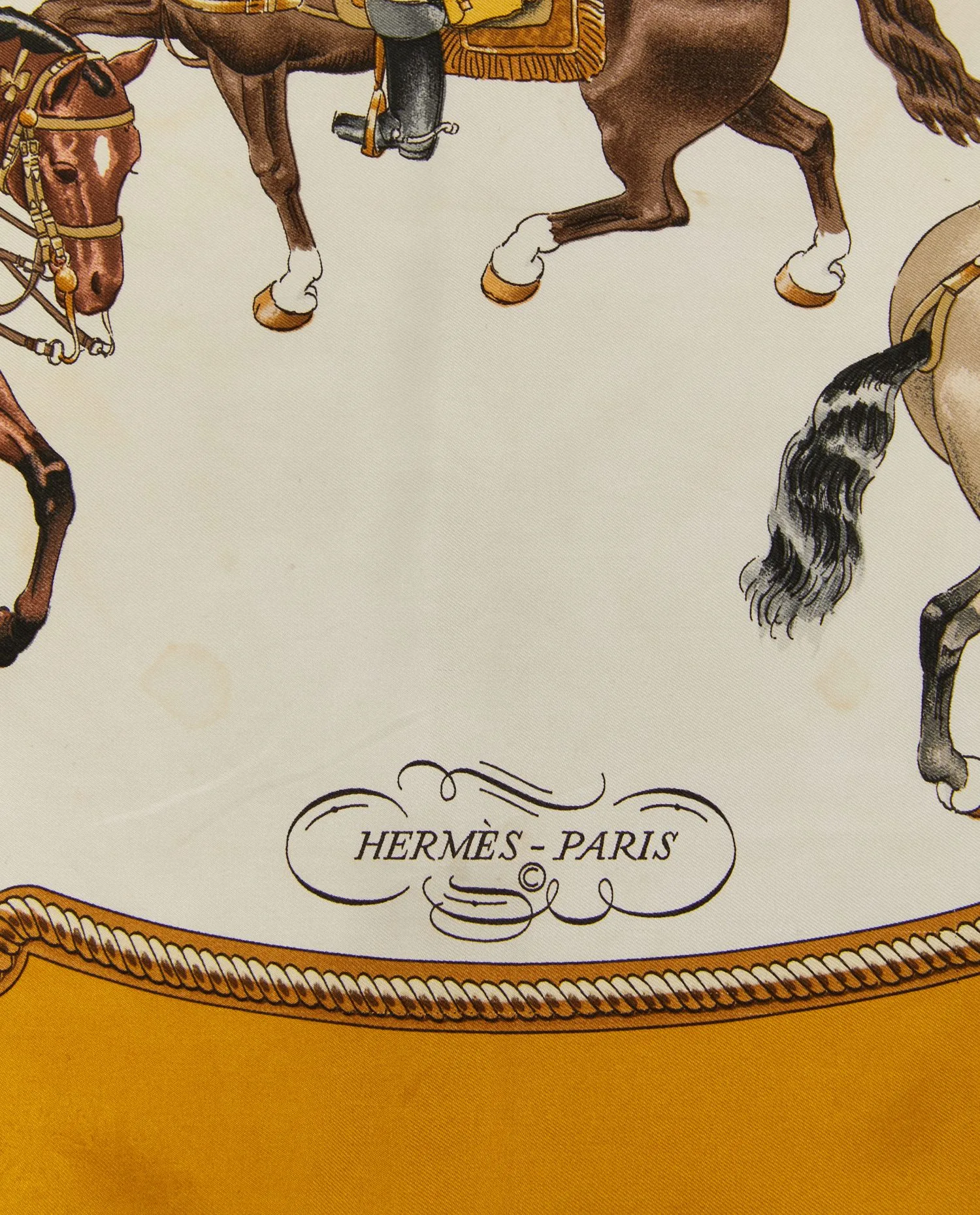L’intérieur du carré est sans doublure, comme il est d’usage pour les foulards Hermès. Les ourlets roulottés à la main témoignent du savoir-faire artisanal de la maison. Le twill de soie confère au foulard un toucher doux et une brillance caractéristique des carrés Hermès vintage.