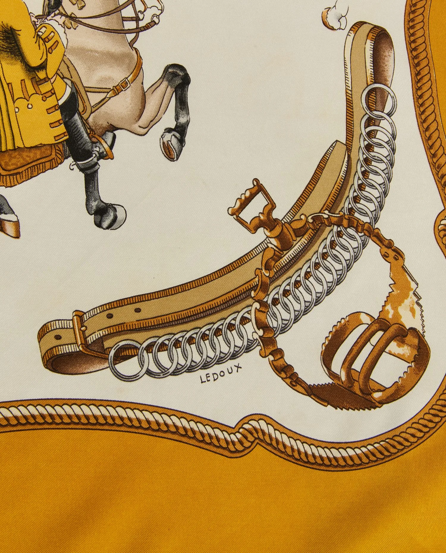 Ce modèle présente un état correct : des petites taches sont perceptibles sur certaines zones claires, notamment vers le centre et la bordure inférieure. L’étiquette Hermès d’origine a disparu, mais la signature Hermès – Paris et celle de l’artiste Ledoux sont bien présentes, attestant de l’authenticité du carré.