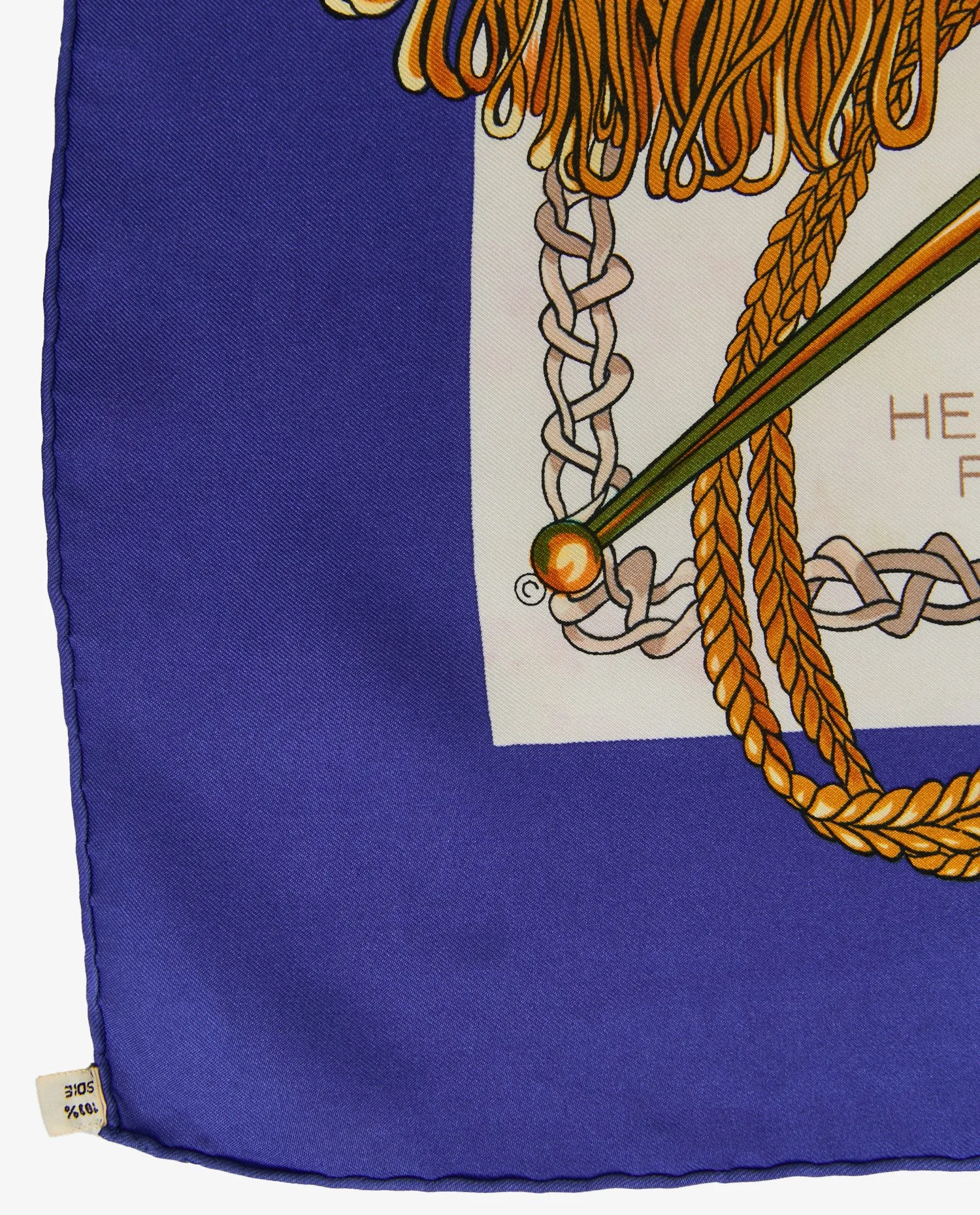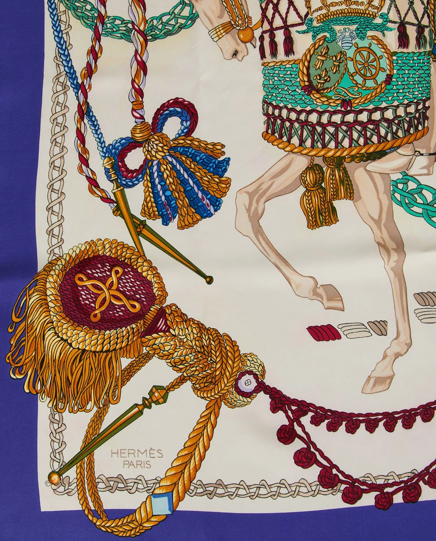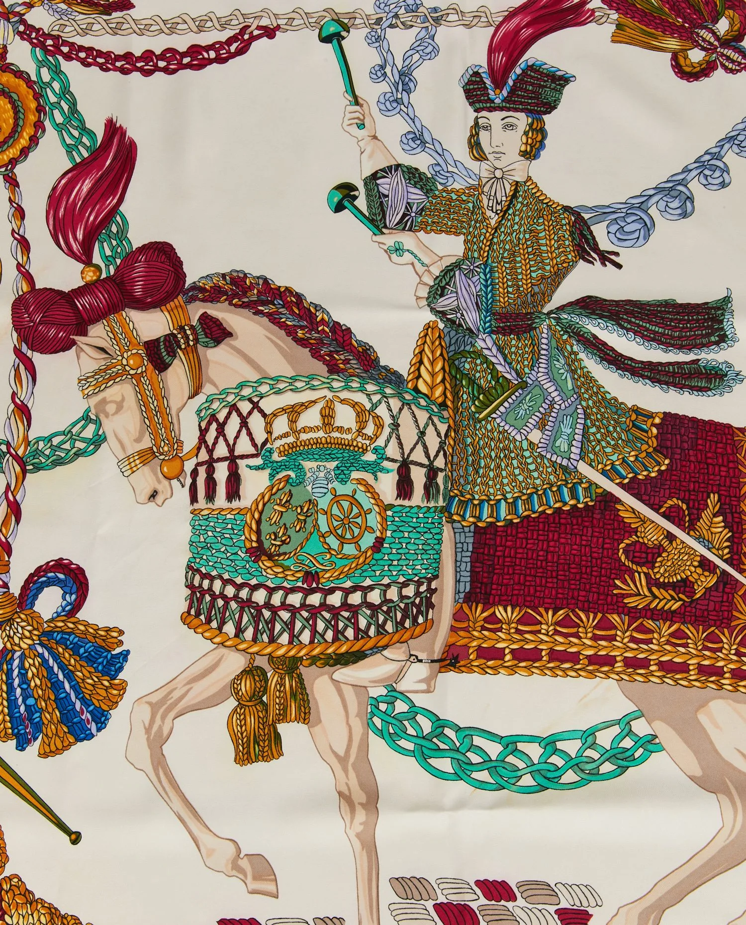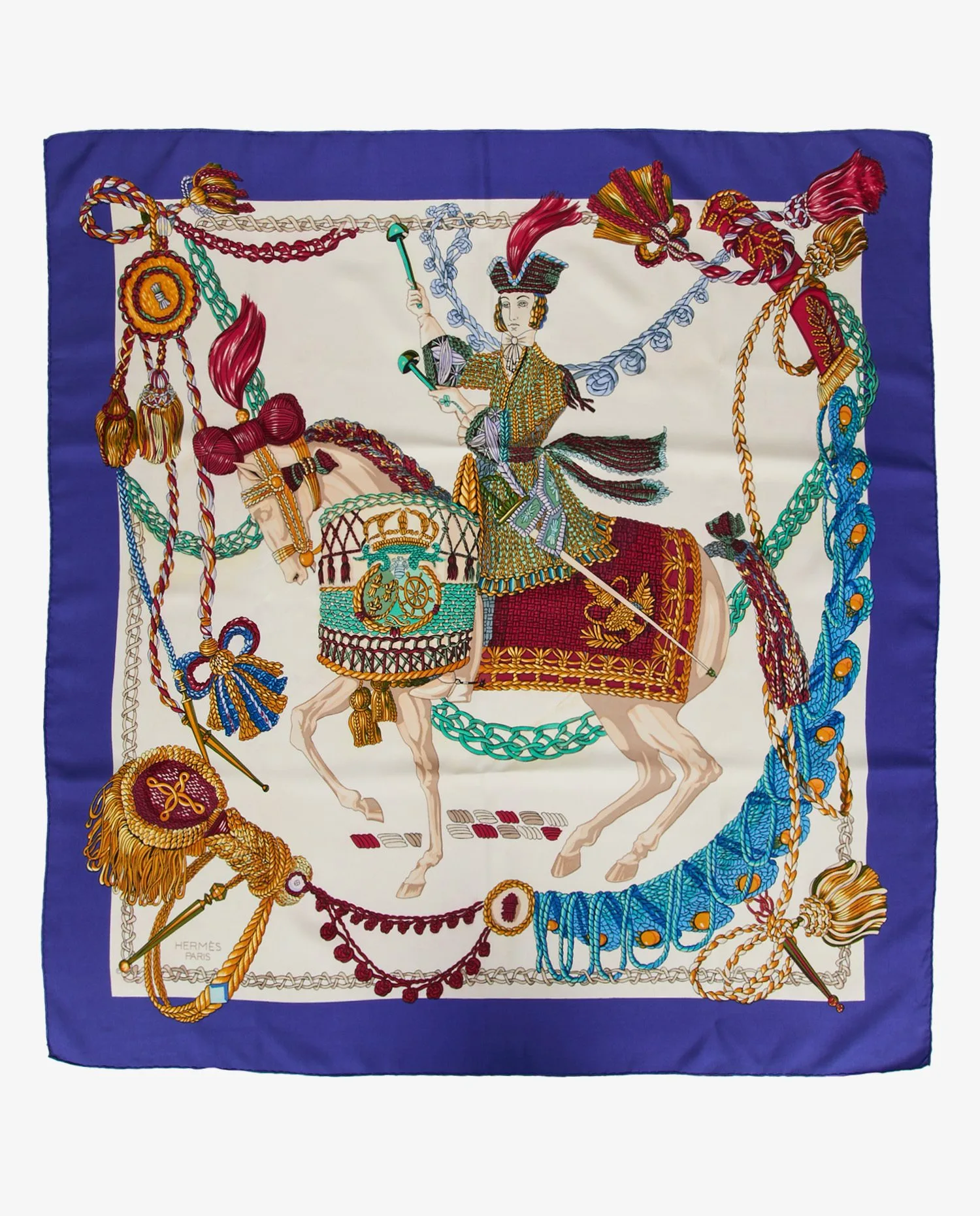 Le twill de soie, dense (environ 65 g), présente un tissage sergé qui capte la lumière. Le motif central montre le cavalier en habit brodé, plume au tricorne, monté sur un cheval caparaçonné ; des rubans et cordons s’enroulent jusqu’aux coins, créant une composition symétrique. La bordure bleu roi encadre le dessin et souligne la précision des traits.