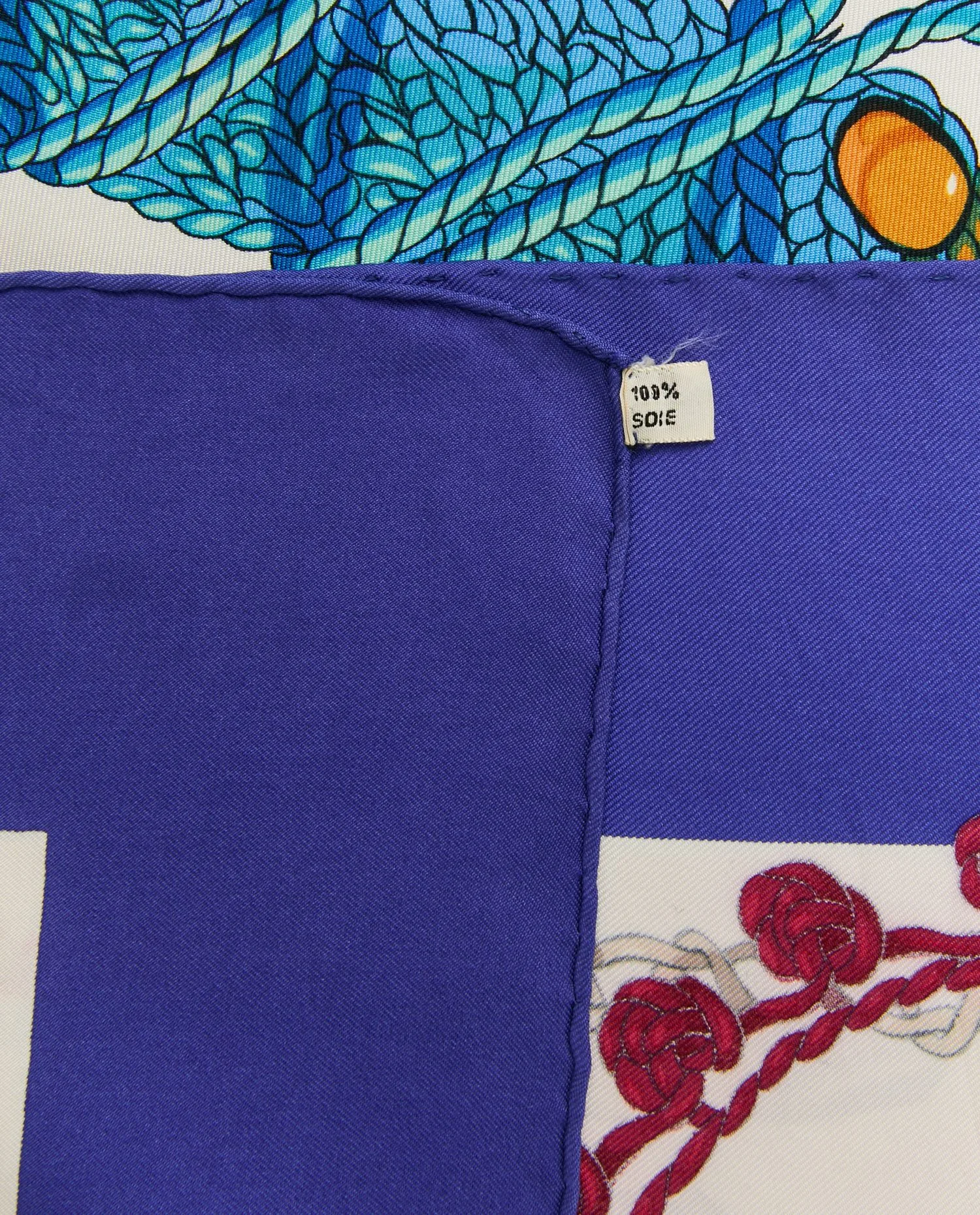 Revers propre, ourlets roulottés vers l’intérieur et cousus ton sur ton, signature “Hermès Paris” imprimée en coin inférieur gauche. La face interne révèle l’envers du motif sans perte de vivacité, indice d’une excellente pénétration de la teinture.