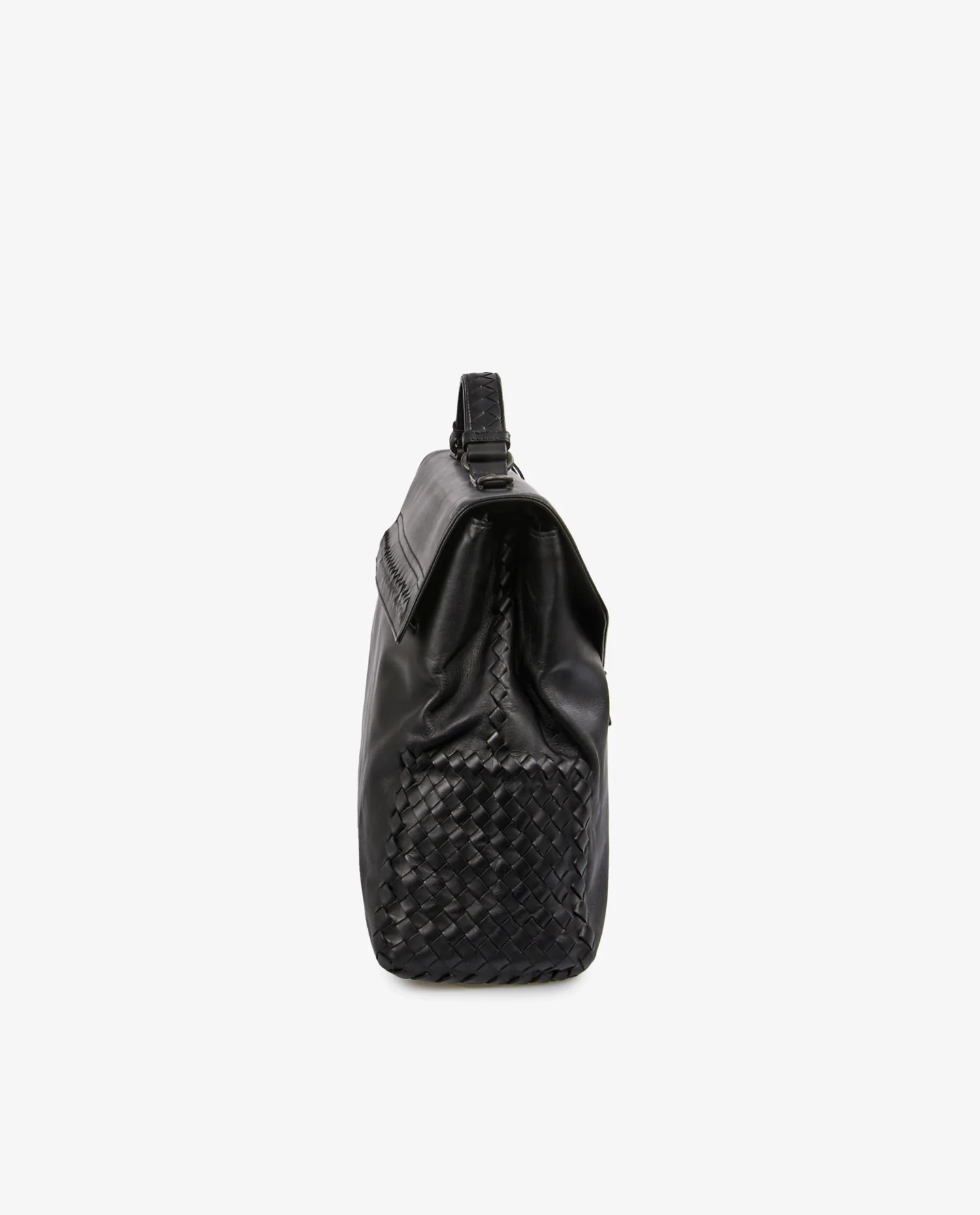 Cartable Bottega Veneta en cuir lisse noir et finitions sur le côté en cuir tressé. Porté à la main ou à l’épaule à l’aide d’une bandoulière amovible. Voir photos. En très état mais quelques griffures d’usure d’usage visible à l’avant. Livré dans son dustbag d’origine.