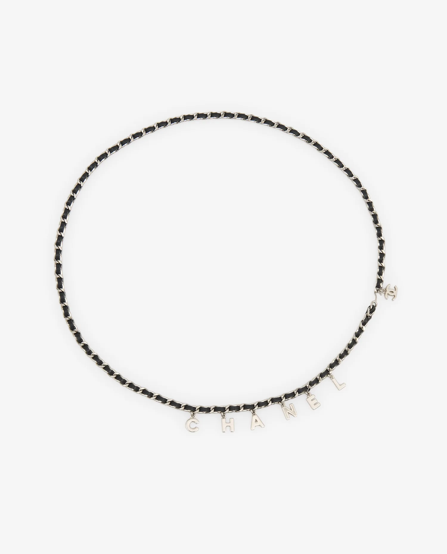 La chaîne est constituée de maillons argentés ovales réguliers, dans lesquels est tressé un ruban de cuir noir souple. Six lettres métalliques argentées pendent au centre, formant le mot “CHANEL”, chacune dotée d’un anneau mobile permettant un léger mouvement. Le fermoir se compose d’un crochet métallique classique, facile à positionner à la longueur désirée. Un charm siglé double C pend à l’extrémité, apportant une touche de finition reconnaissable.
