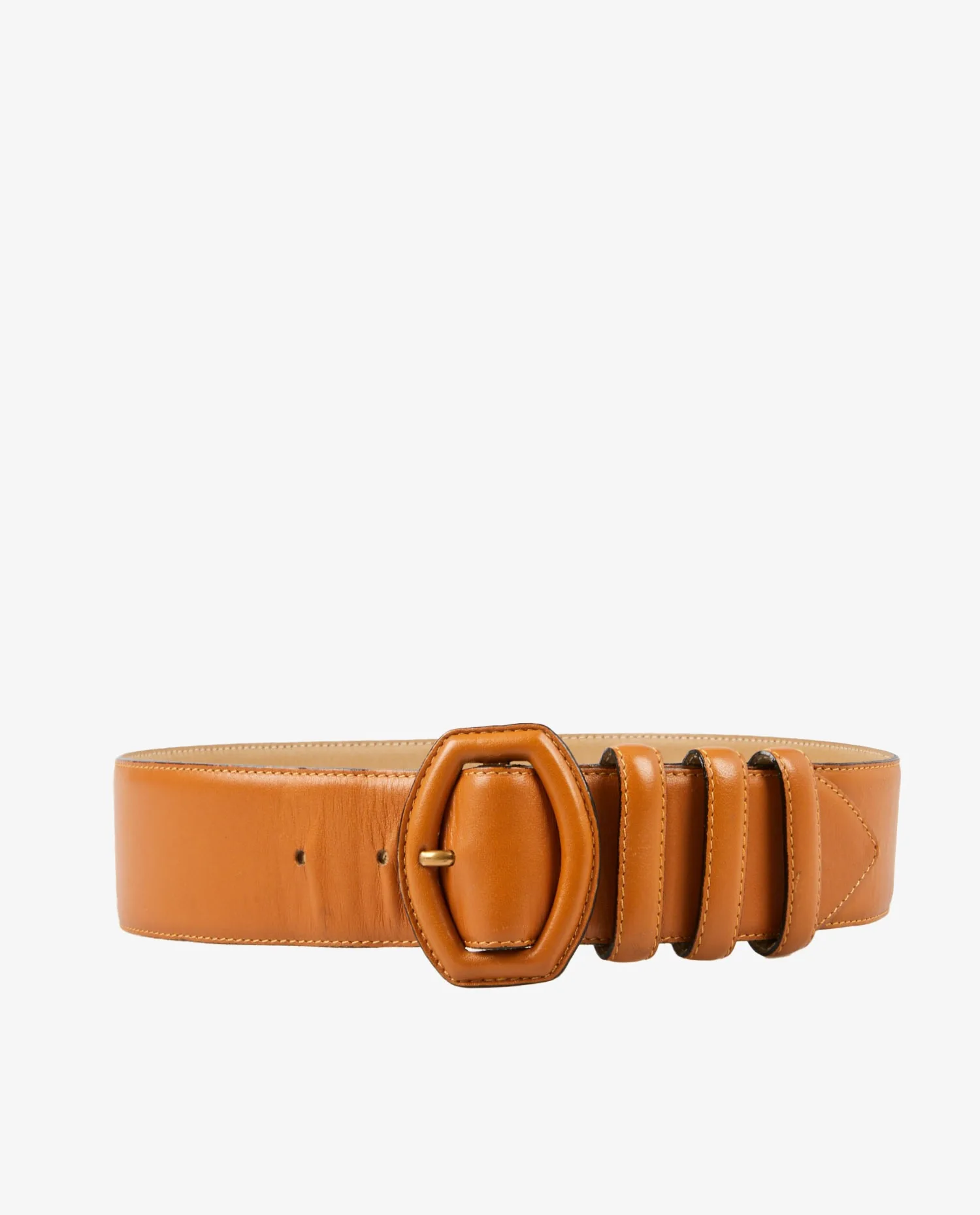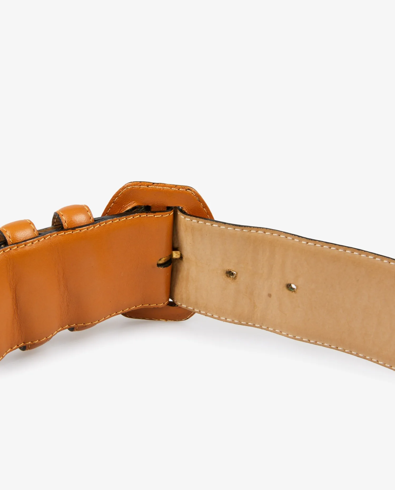 Le cuir gold, légèrement satiné, présente un grain lisse et une belle souplesse, tout en conservant une tenue rigide idéale pour les ceintures structurantes. Les coutures contrastées blanches longent les bords de manière nette et régulière. La boucle, gainée du même cuir, adopte une forme ovale renforcée, apportant une touche graphique. Trois passants larges viennent stabiliser la sangle une fois portée, créant un effet visuel équilibré et élégant.