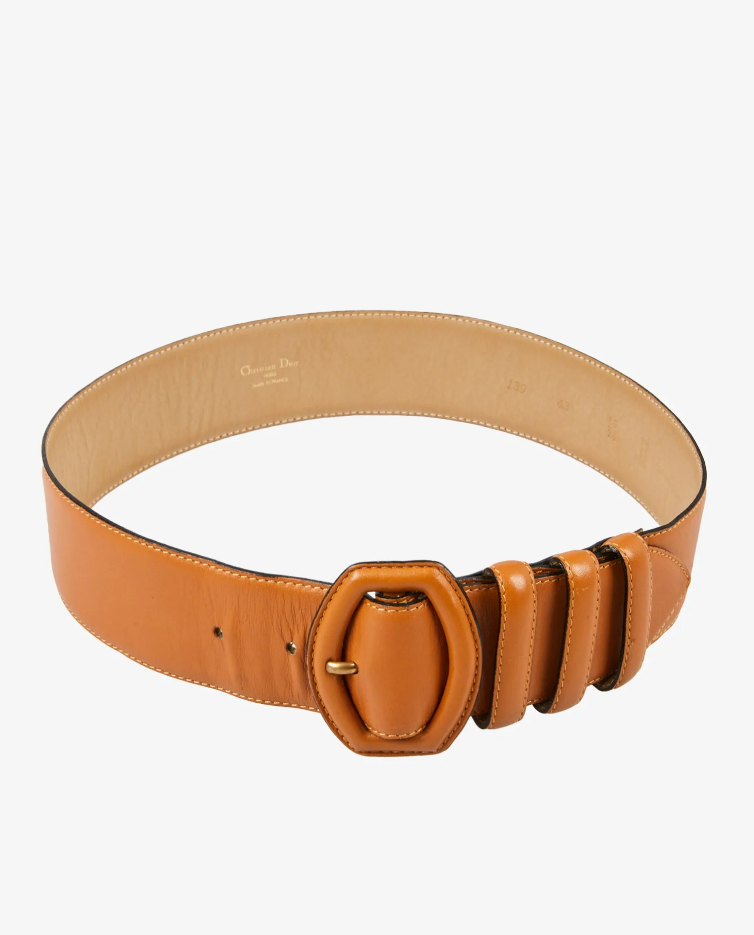 Cette ceinture est en très bon état vintage. On observe quelques plis et légères marques d’usage sur le cuir extérieur, notamment à proximité des trous d’ajustement. La boucle est intacte, les passants sont bien fixés, et les coutures demeurent solides. Le cuir conserve sa brillance et sa souplesse, avec une patine naturelle qui valorise son authenticité.