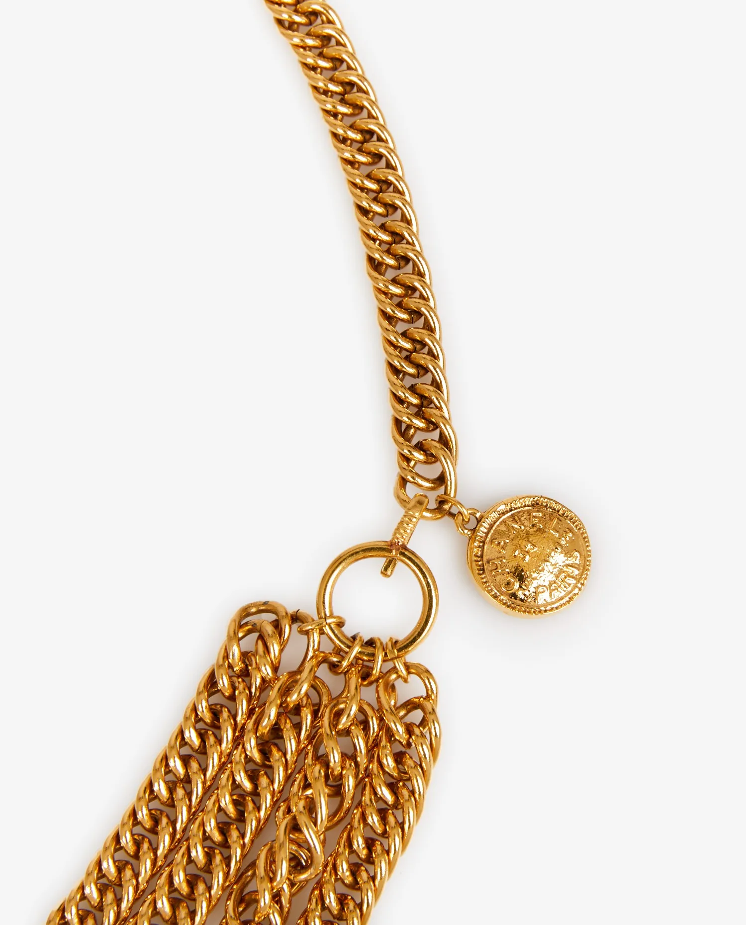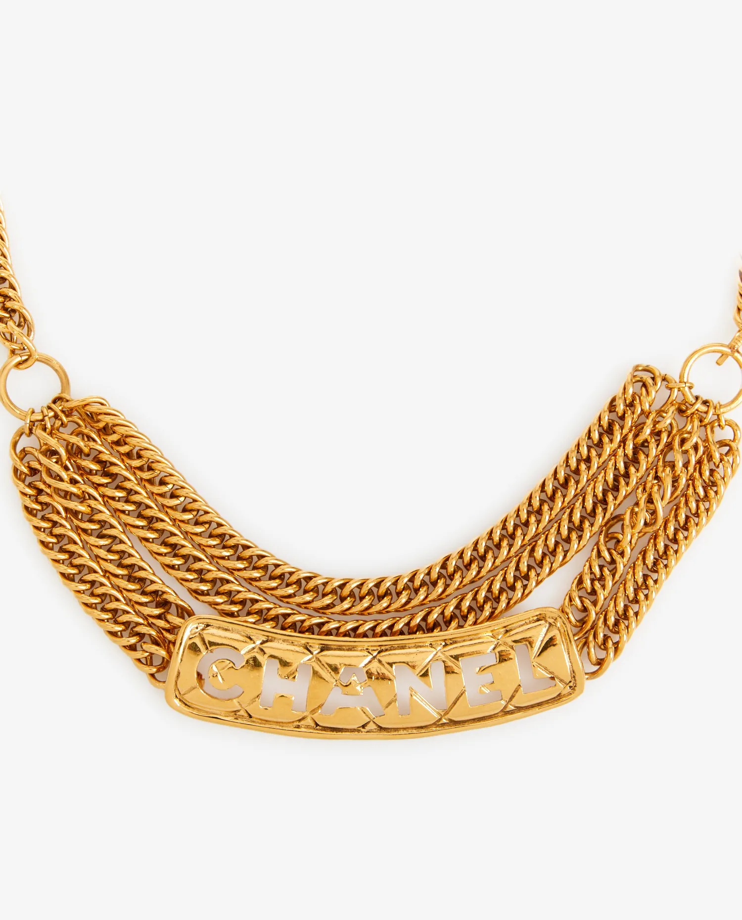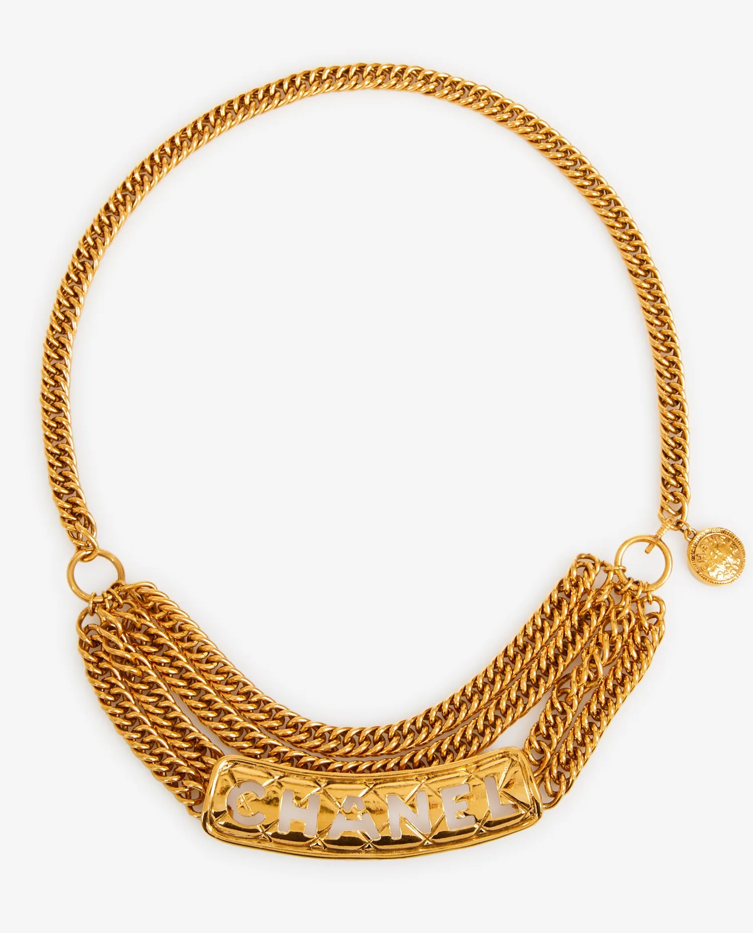 La chaîne principale est formée de maillons dorés à la finition brillante, denses et réguliers. Au centre, six chaînes tombantes s’attachent à une plaque rigide en métal doré perforée du nom “CHANEL”, avec un décor en losanges matelassés en arrière-plan. Cette plaque imposante structure visuellement la pièce lorsqu’elle est portée. Un charm rond doré gravé du logo et de l’inscription “Chanel Paris” termine la chaîne avec raffinement.