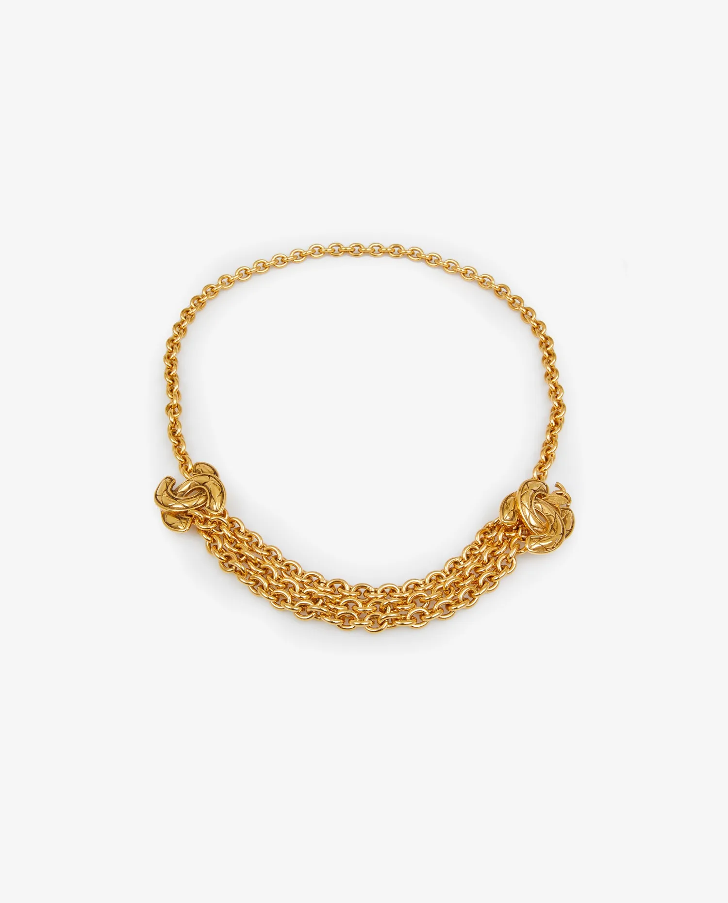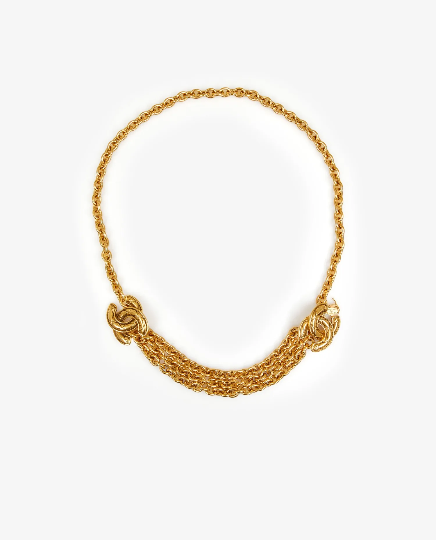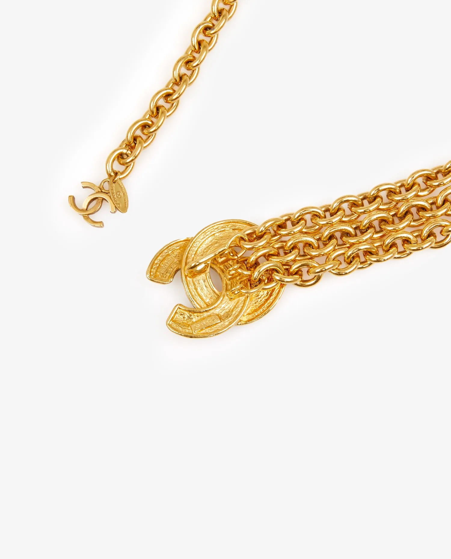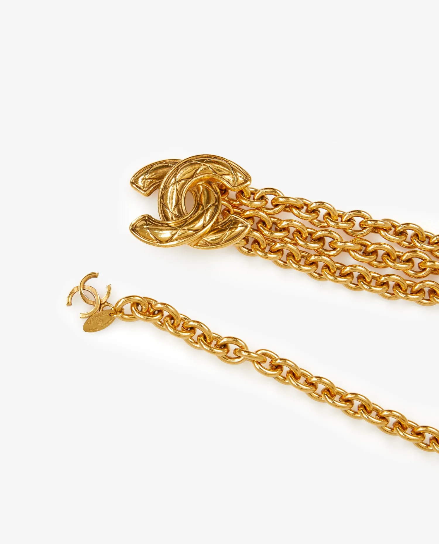 Ceinture vintage Chanel triple rangs en chaine dorée. Deux CC matelassés de chaque côté. En très bon état.