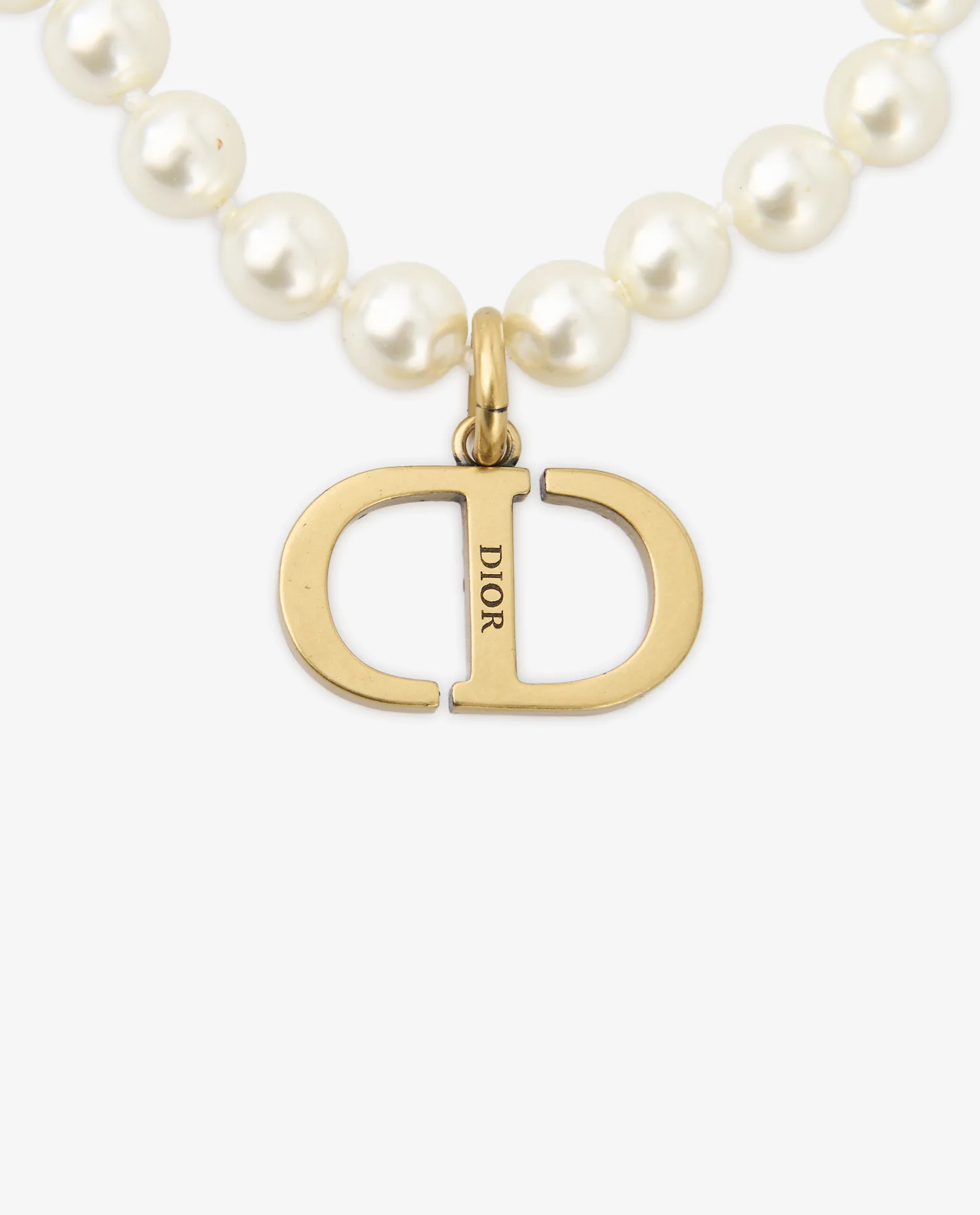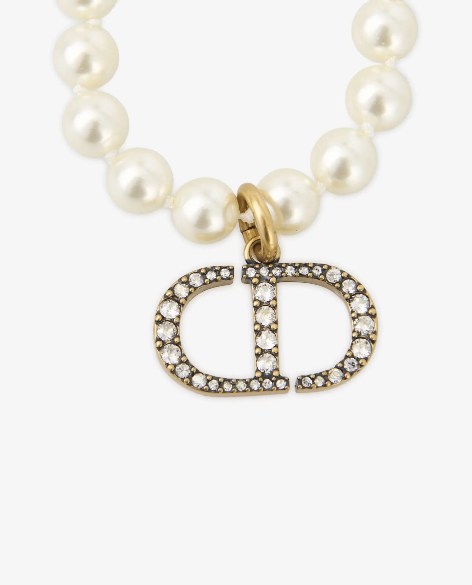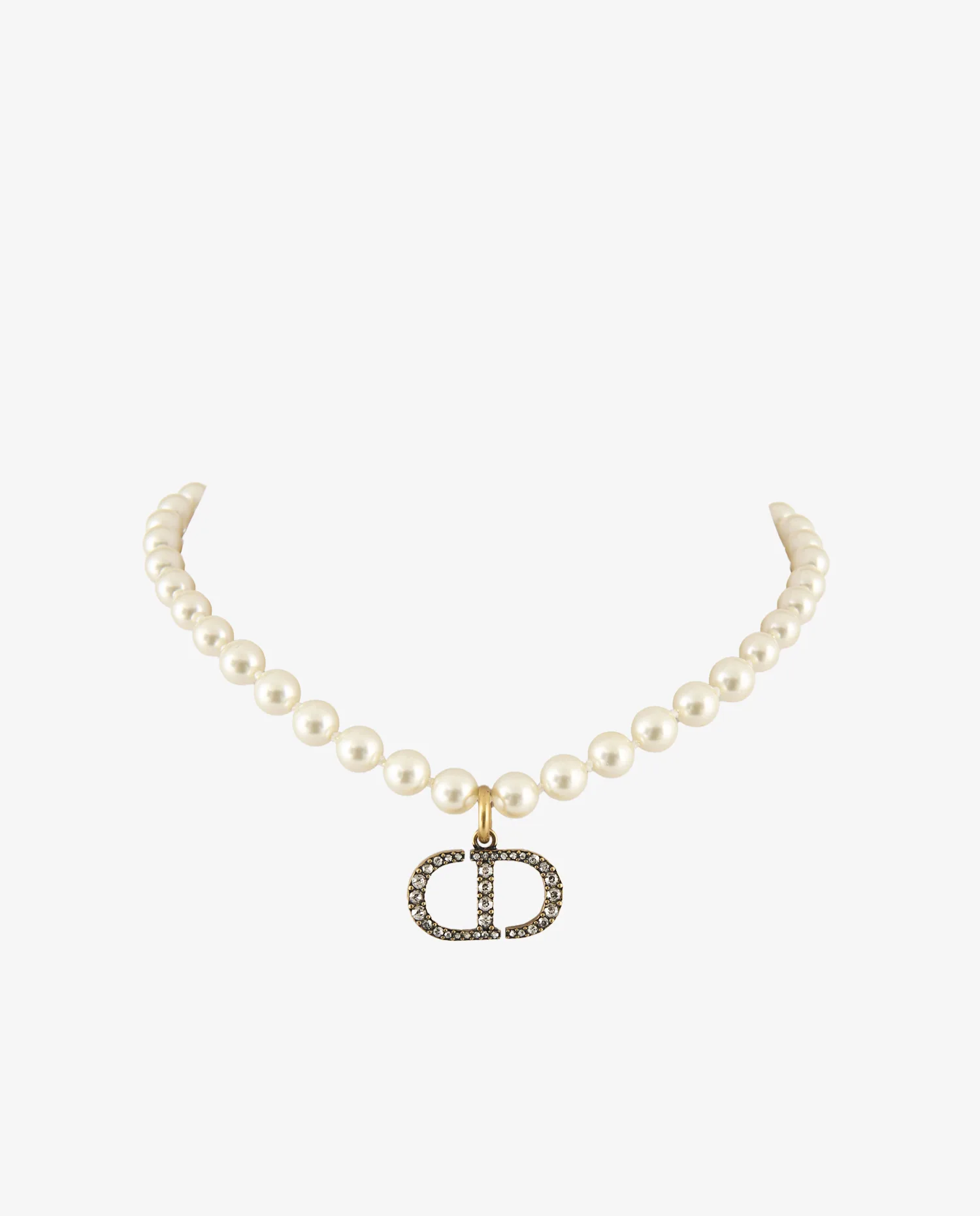 Le collier est composé de perles synthétiques blanches, uniformes et brillantes, disposées de manière régulière sur toute la longueur. Leur surface lisse et leur teinte homogène apportent un rendu net et structuré. Le pendentif central reprend le logo CD, réalisé en métal doré à la finition polie. Les lettres sont serties de strass transparents, apportant un contraste lumineux et une présence visuelle marquée sans excès. L’anneau de fixation, également doré, assure une jonction fluide entre le collier et le pendentif.