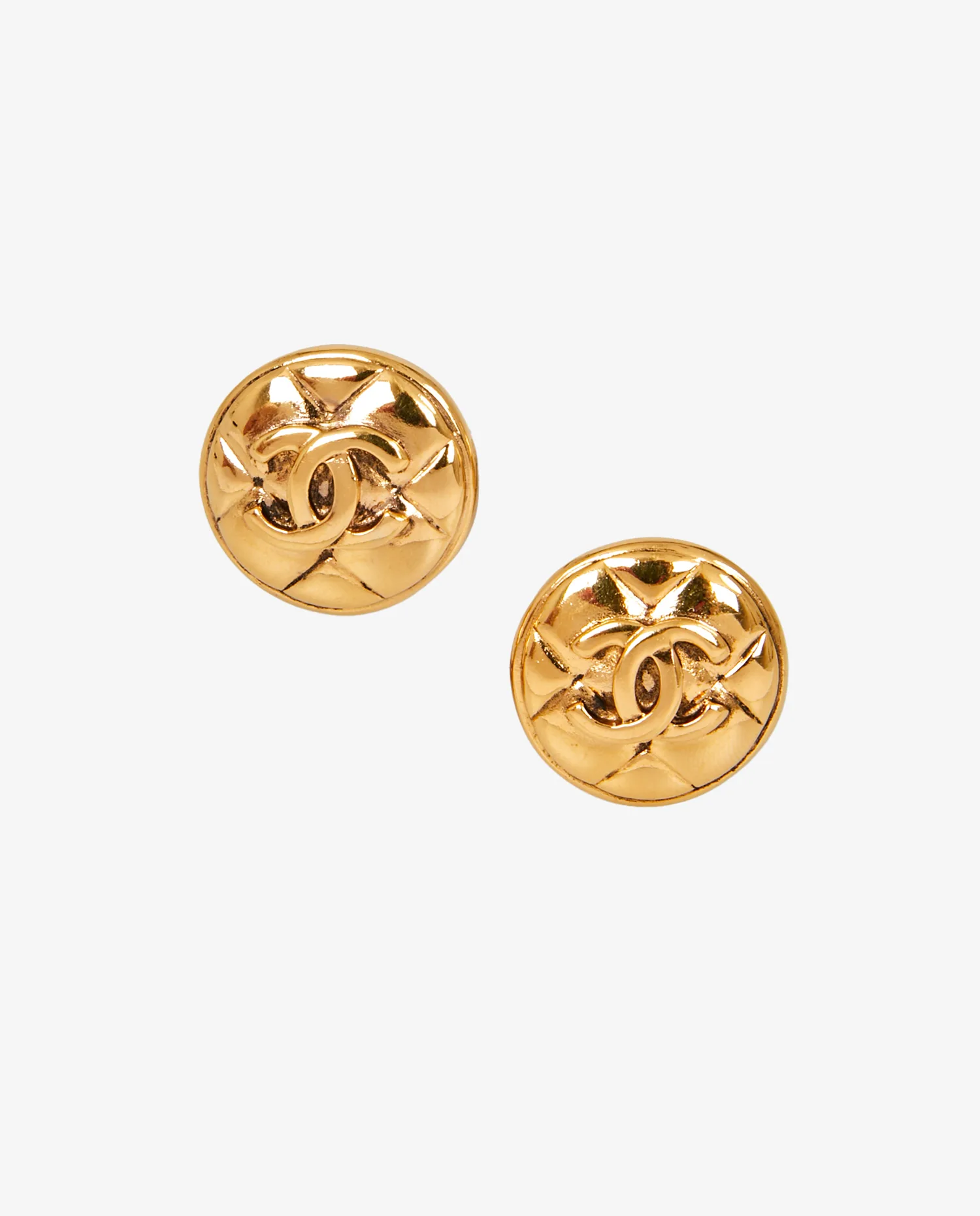 Le métal doré présente une finition brillante et uniforme. Le diamètre des boucles d’oreilles est d’environ 2,5 cm, offrant un format discret mais visible. Le motif matelassé, finement travaillé, encadre le logo CC central. Le revers des boucles porte la signature gravée de la maison Chanel, attestant de l’authenticité de ces bijoux vintage. Les clips sont équipés de patins en résine pour un confort accru.