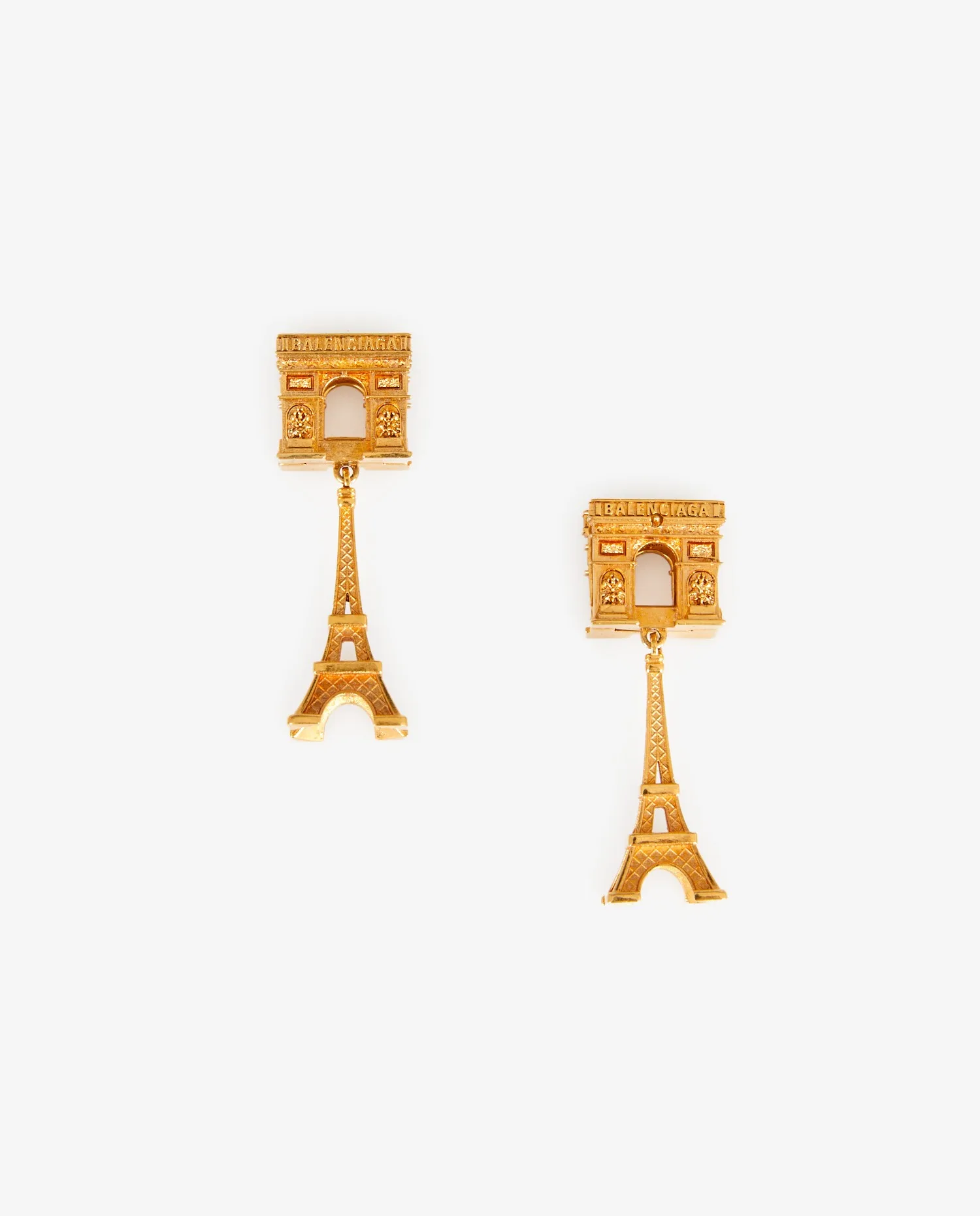 Boucles d’oreilles Balenciaga en forme de Tour Eiffel et Arc de Triomphe. En très bon état.