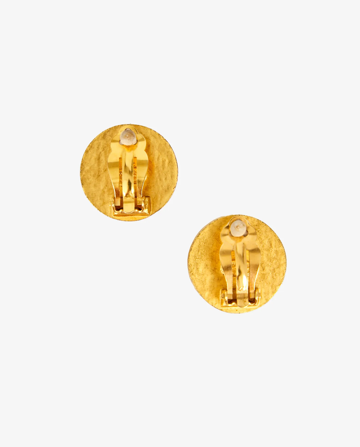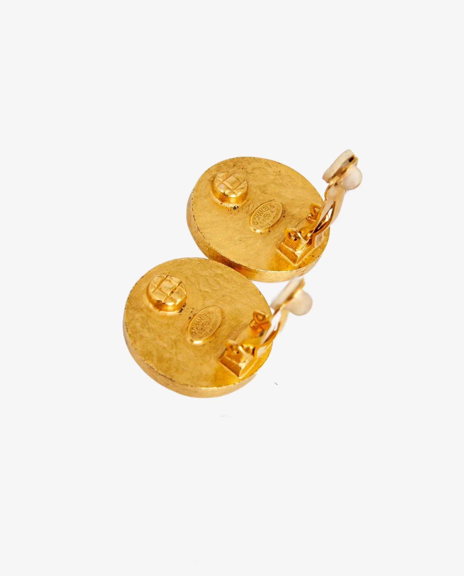 Clips ronds vintage Chanel en métal doré plaqué or 24K et nacre. Collection Automne/Hiver 1995. En très bon état.