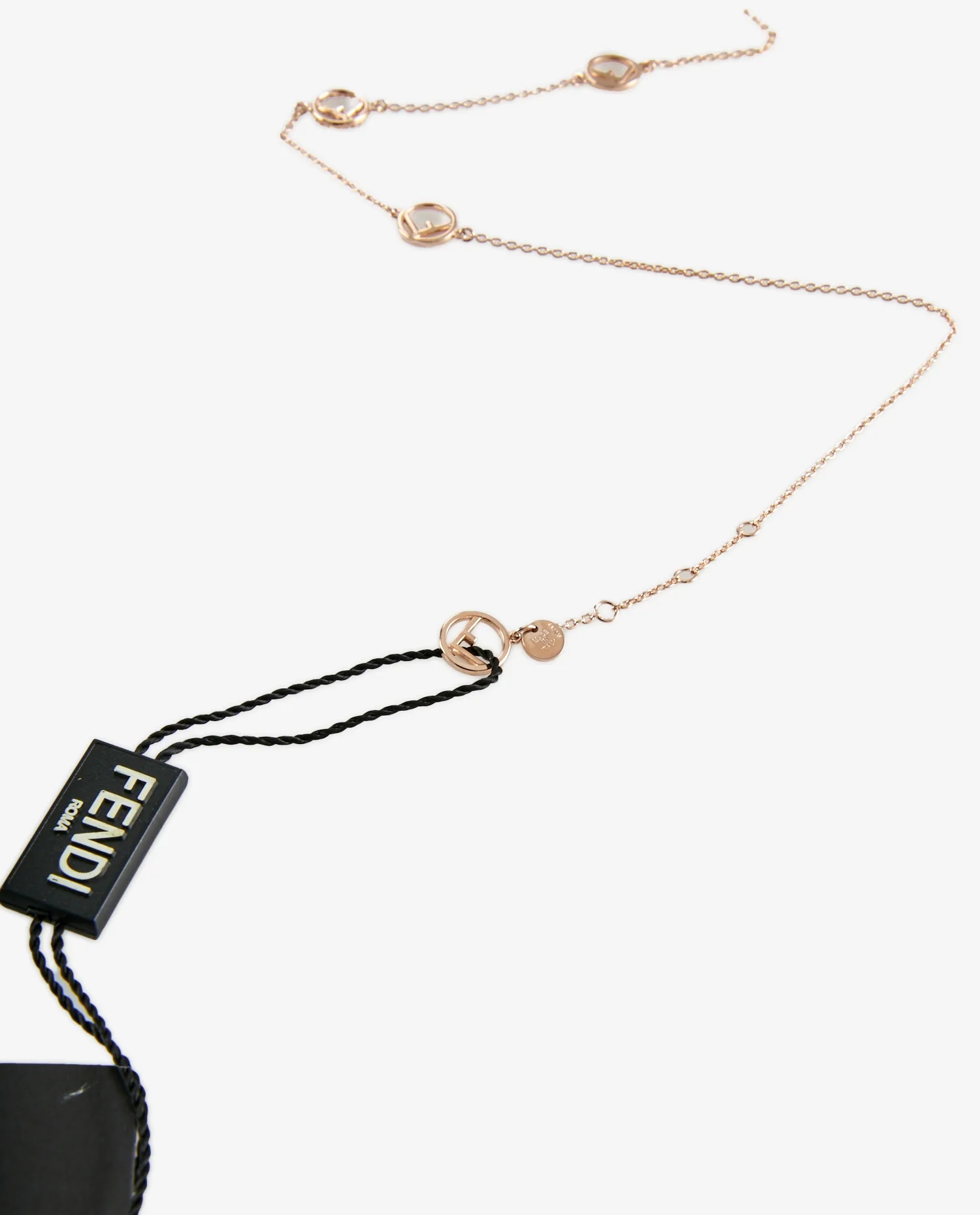 Collier F is Fendi en métal de couleur or rose. Sur l’un des F on peut voir des strass. Etat neuf. Livré dans sa boite d’origine.