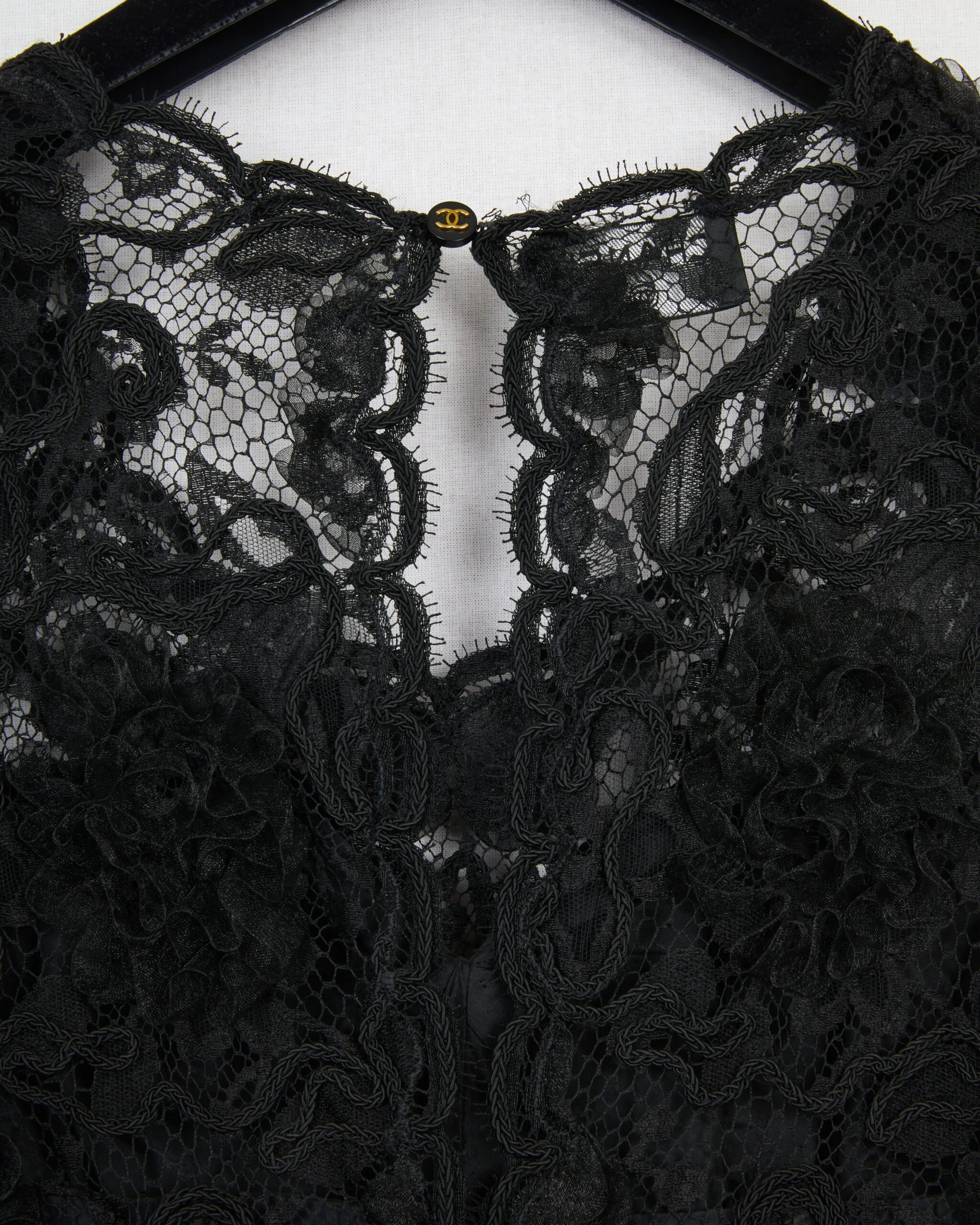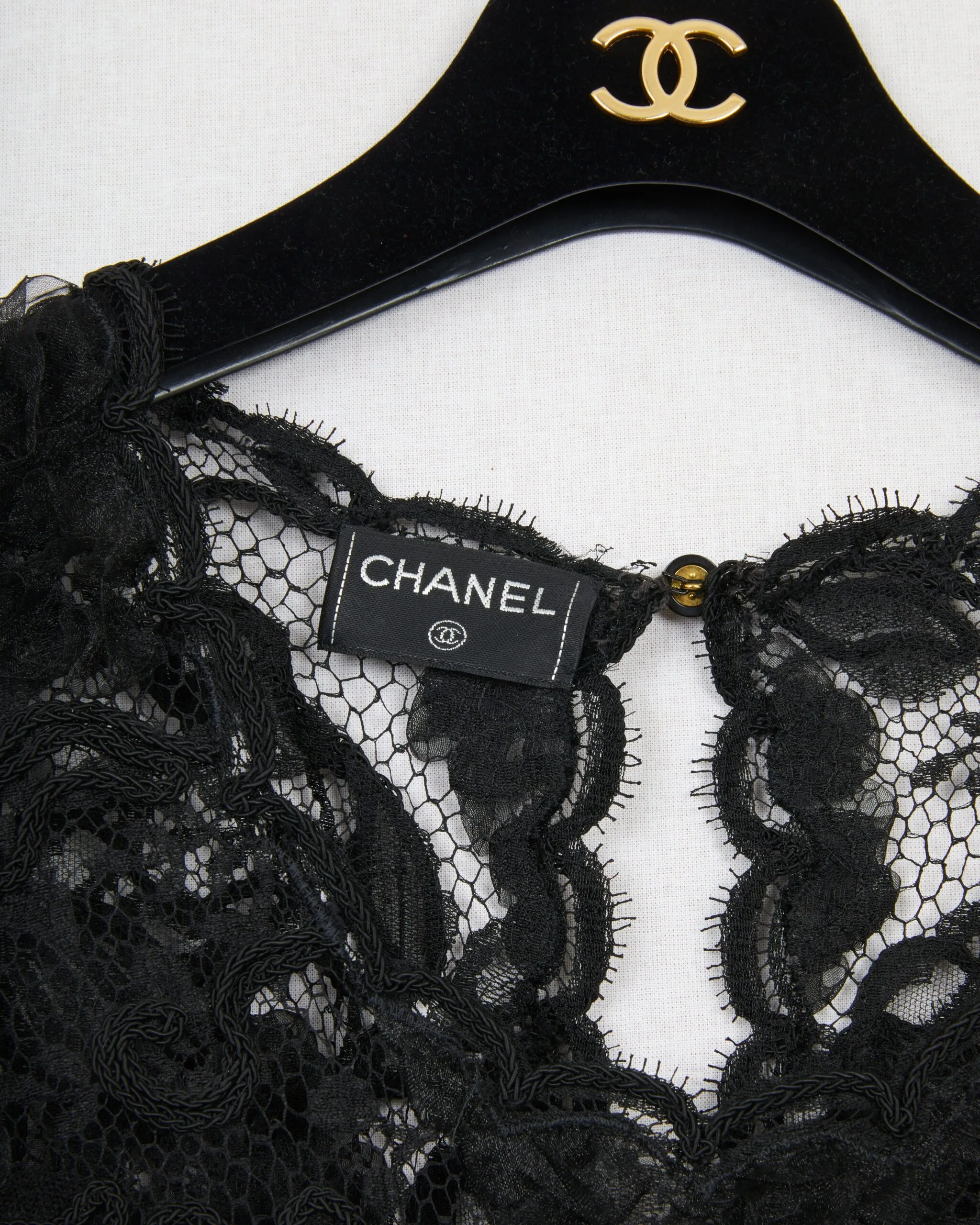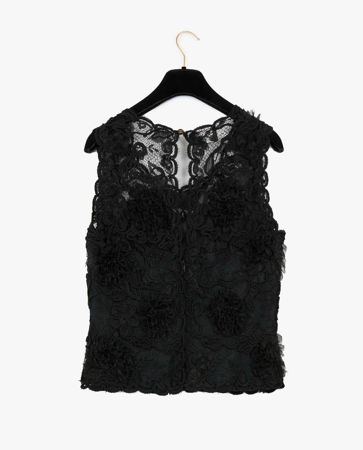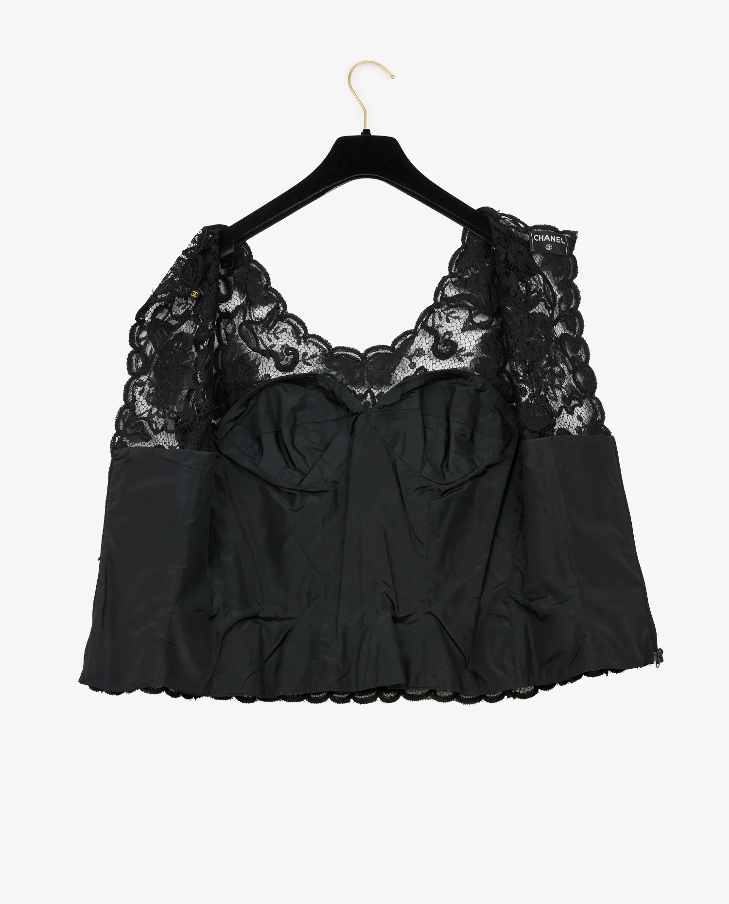 Top Chanel en dentelle noire. Bustier à l’intérieur. Fermeture zippée dans le dos. En très bon état.