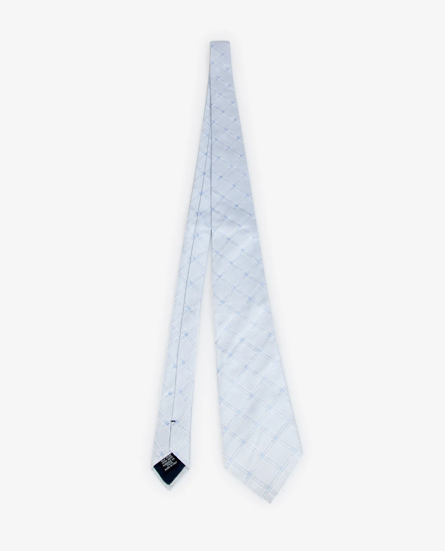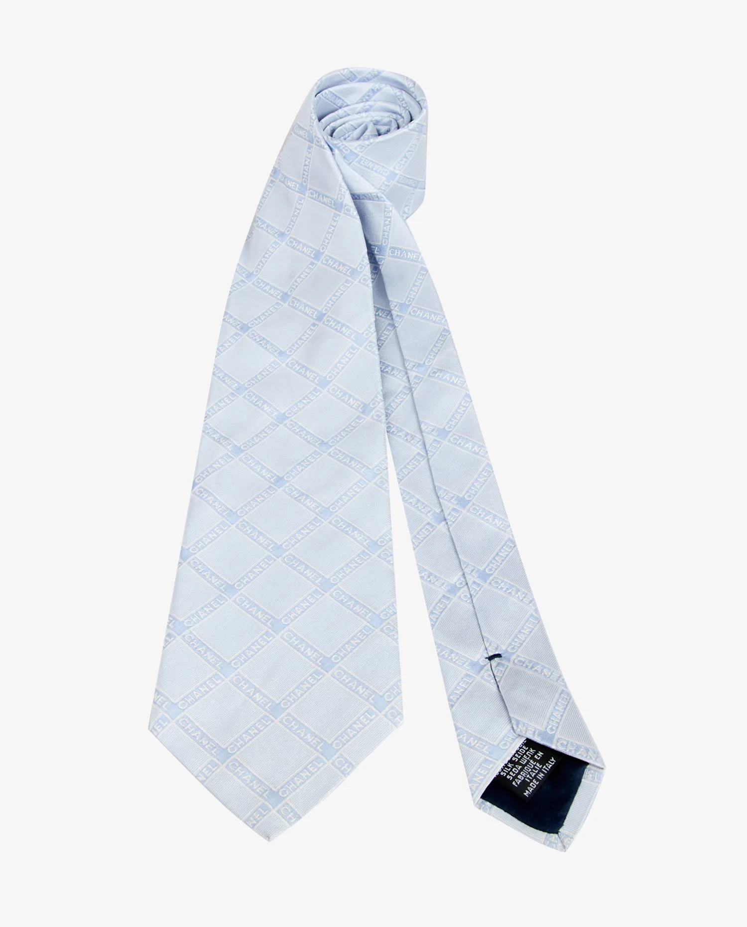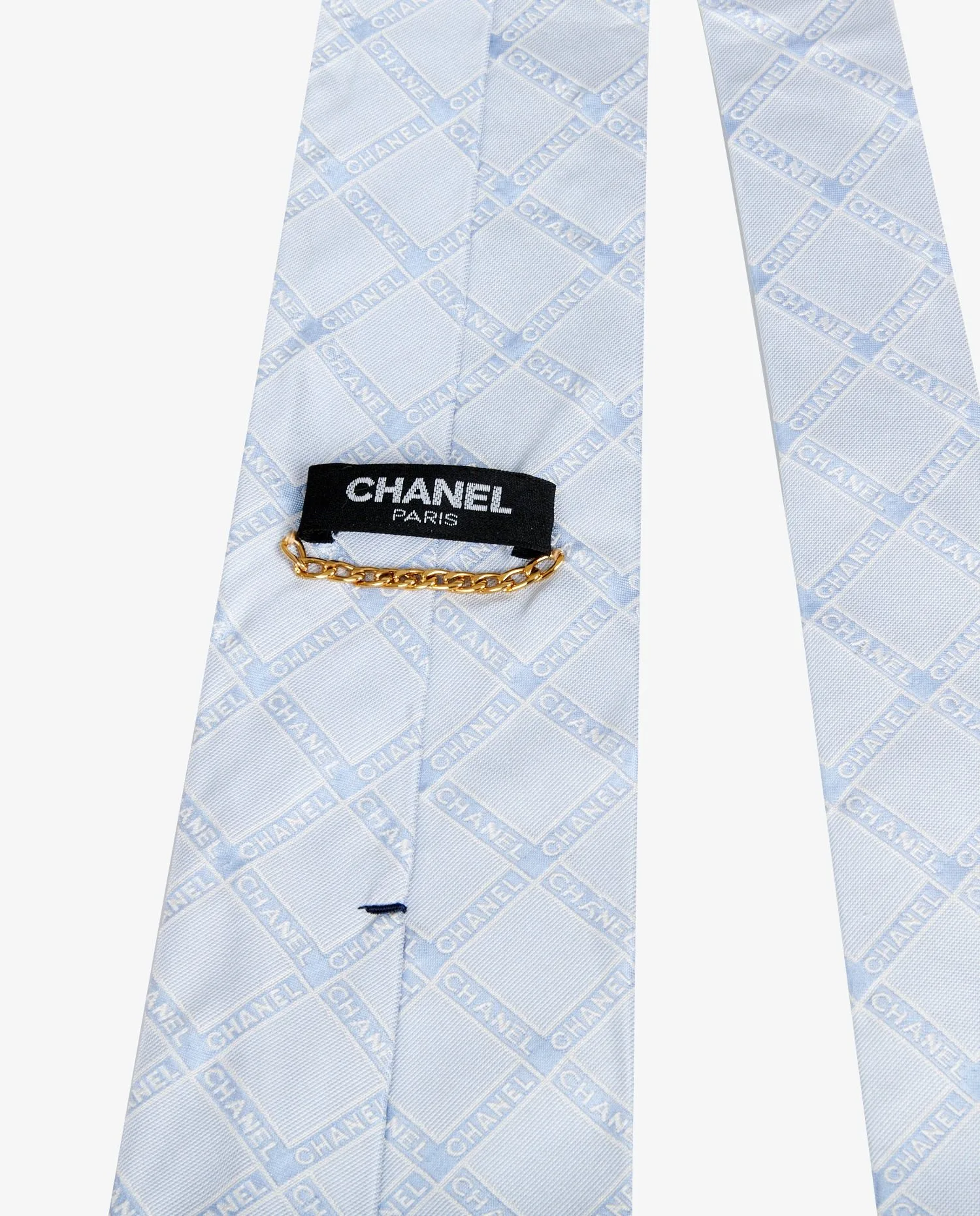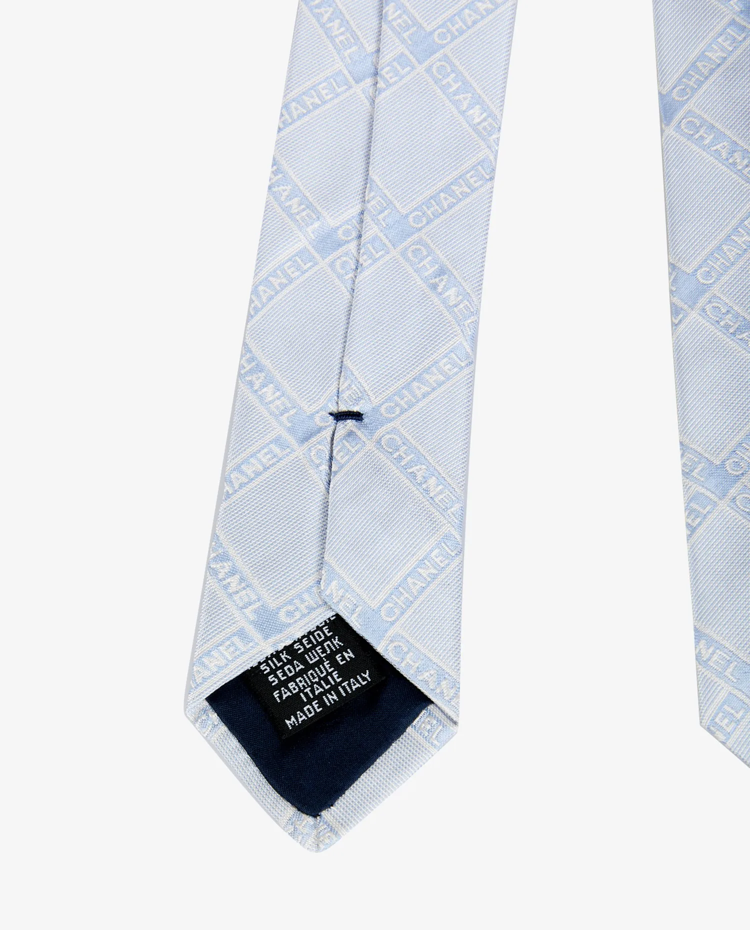 Cravate Chanel en soie bleu ciel siglée. Jamais porté.