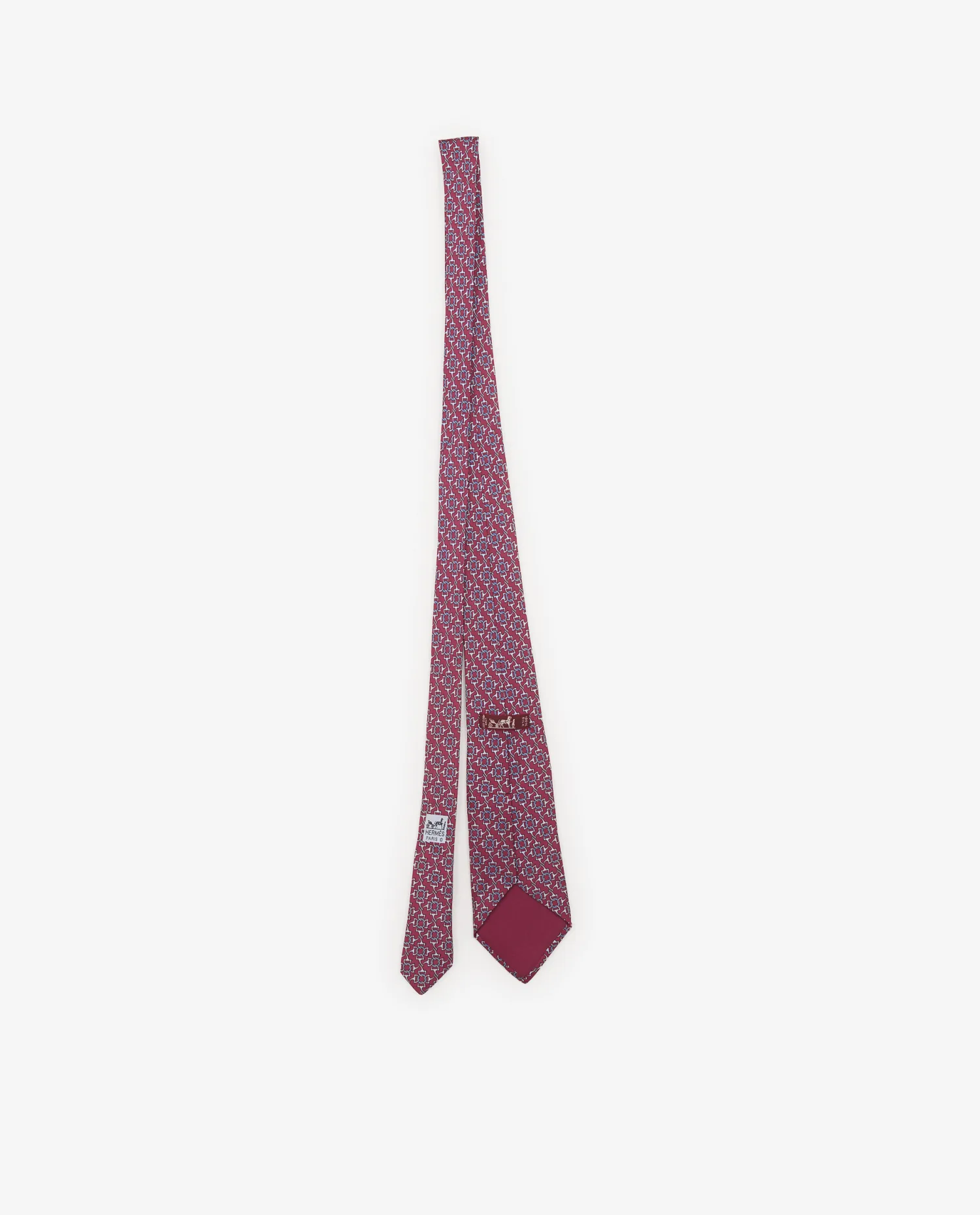 Le motif all-over reprend des étriers miniatures entrelacés, imprimés avec précision sur un twill de soie rouge à légère brillance. Les bleus utilisés – bleu ciel et bleu foncé – apportent un contraste équilibré et une profondeur visuelle élégante. La pointe arrière est renforcée d’un insert en soie unie rouge assortie. Le tissu offre un tombé fluide et structuré, caractéristique des cravates Hermès.