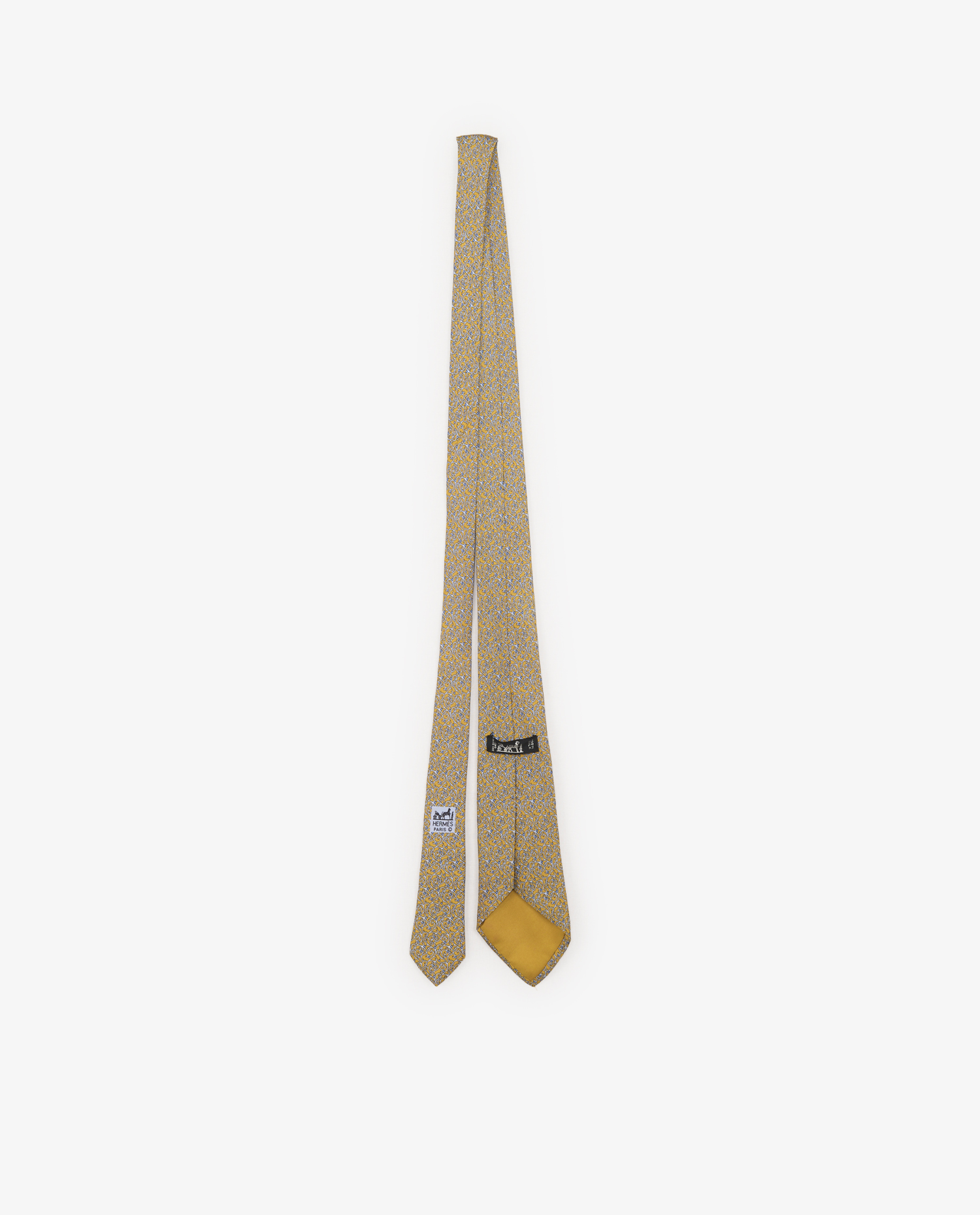 La cravate est dotée de ses étiquettes d’origine : “Hermès Paris” avec le logo cavalière, et étiquette de fabrication “Made in France”. Le passant intérieur est réalisé dans le même tissu imprimé. La couture centrale est effectuée à la main, assurant souplesse, durabilité et tenue dans le temps. L’entoilage intérieur garantit un bon maintien du nœud.