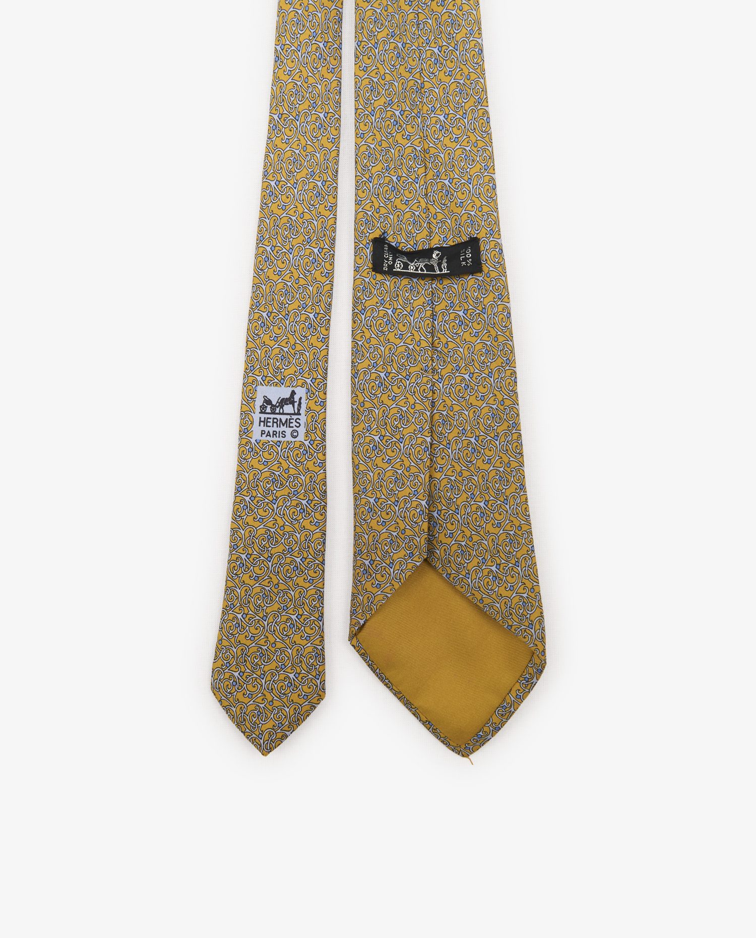 Le fond jaune safran met en valeur un motif all-over d’arabesques fines, dessinées en bleu ciel et bleu moyen, rehaussées par des contours noirs qui en soulignent la structure sans l’alourdir. L’ensemble forme un réseau fluide, évoquant les entrelacs des arts décoratifs revisités dans une écriture graphique contemporaine. Le twill de soie apporte une légère brillance et une texture raffinée. La pointe arrière est doublée d’un satin de soie unie dans la même tonalité.