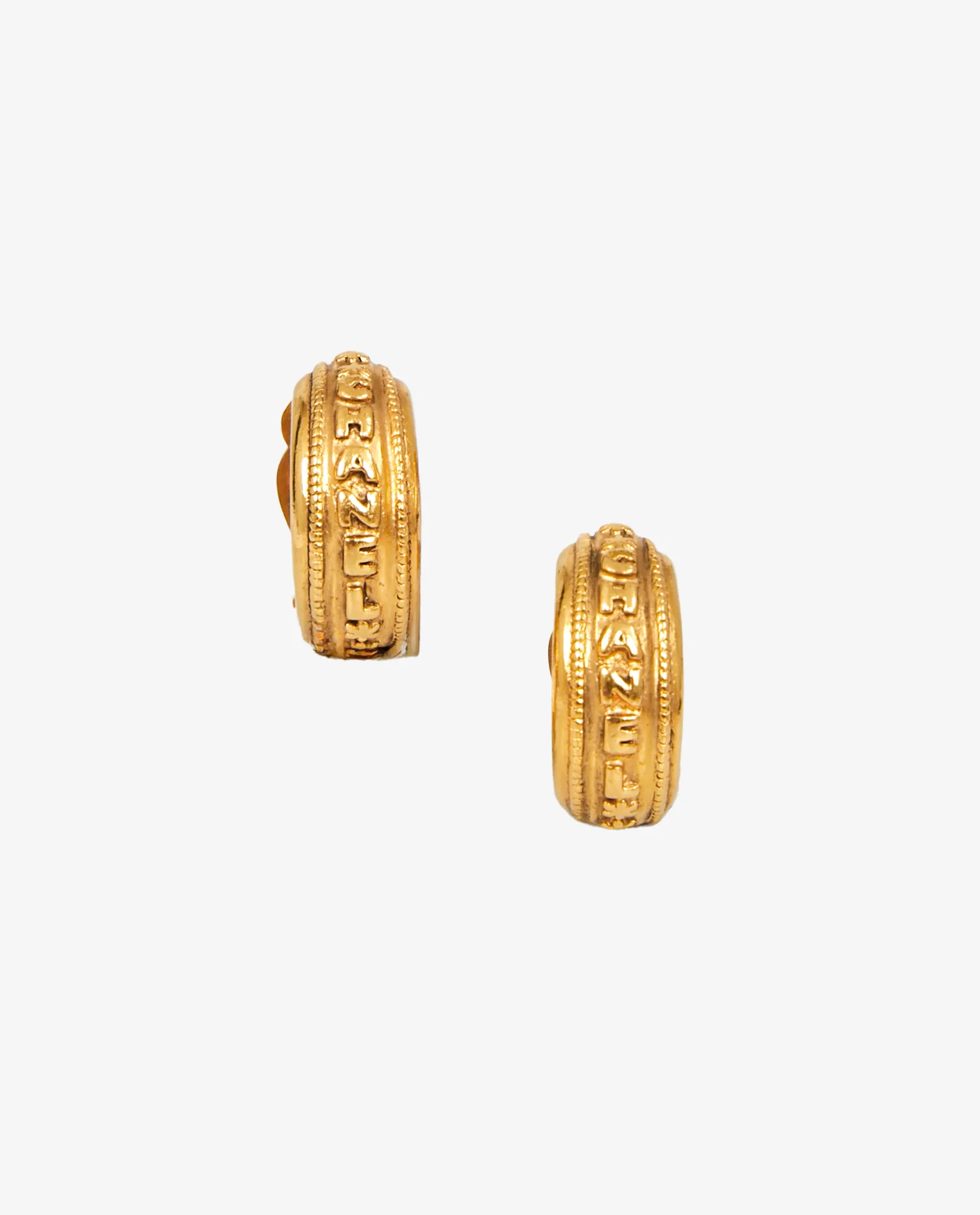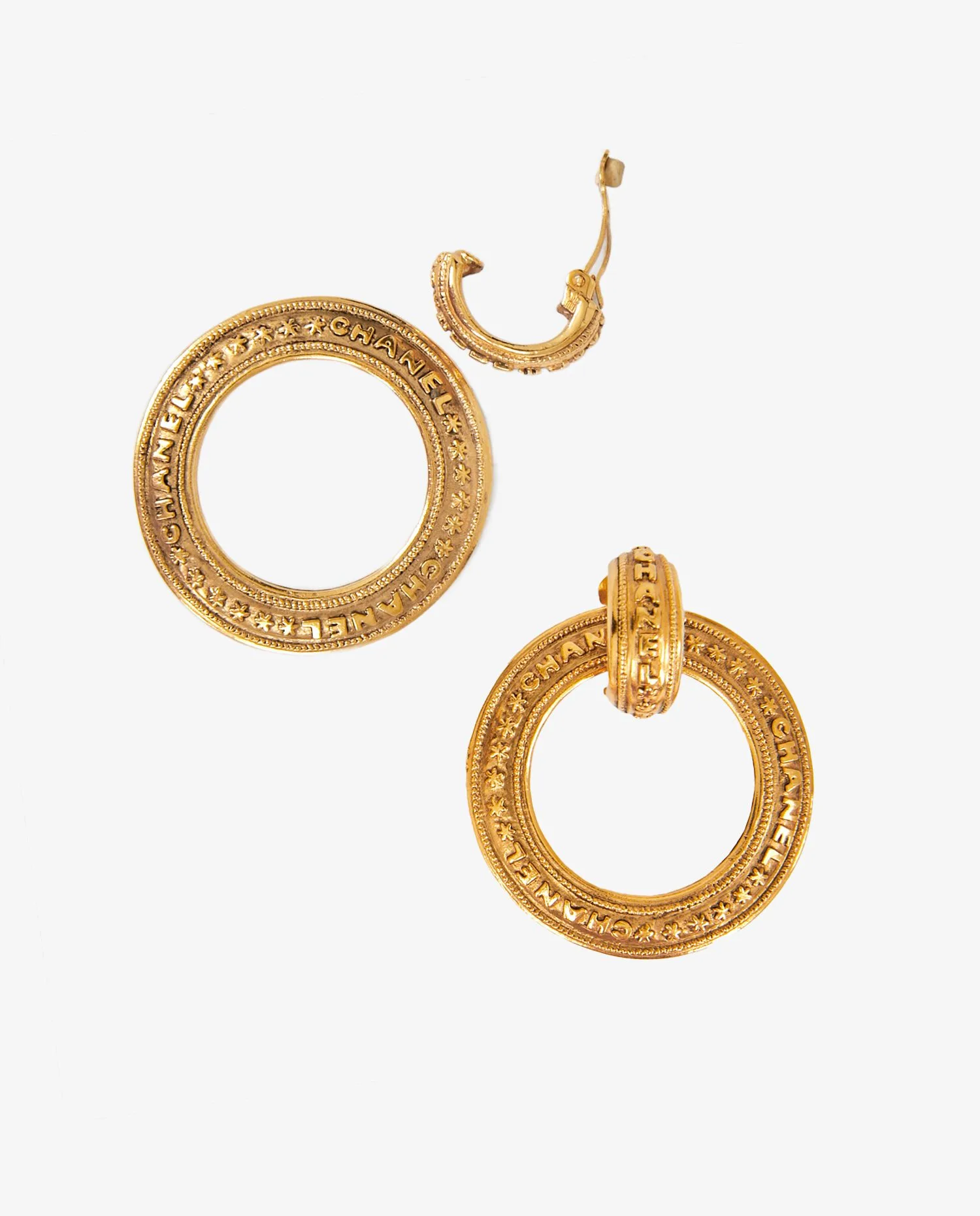 Créoles Chanel vintage en métal doré plaqué or 24K. La subtilité de ses boucles d’oreilles c’est qu’elles peuvent se porter séparément (Voir photos). En relief, l’inscription CHANEL avec des étoiles. Une très belle pièce! En très bon état.