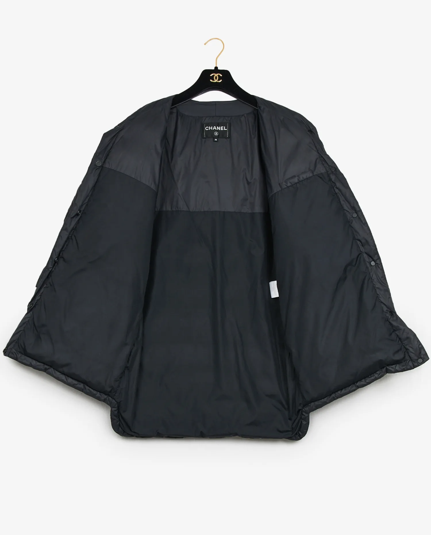 Doudoune Chanel noire imperméable. Taille 38. Fermeture par bouton pression. En très bon état.