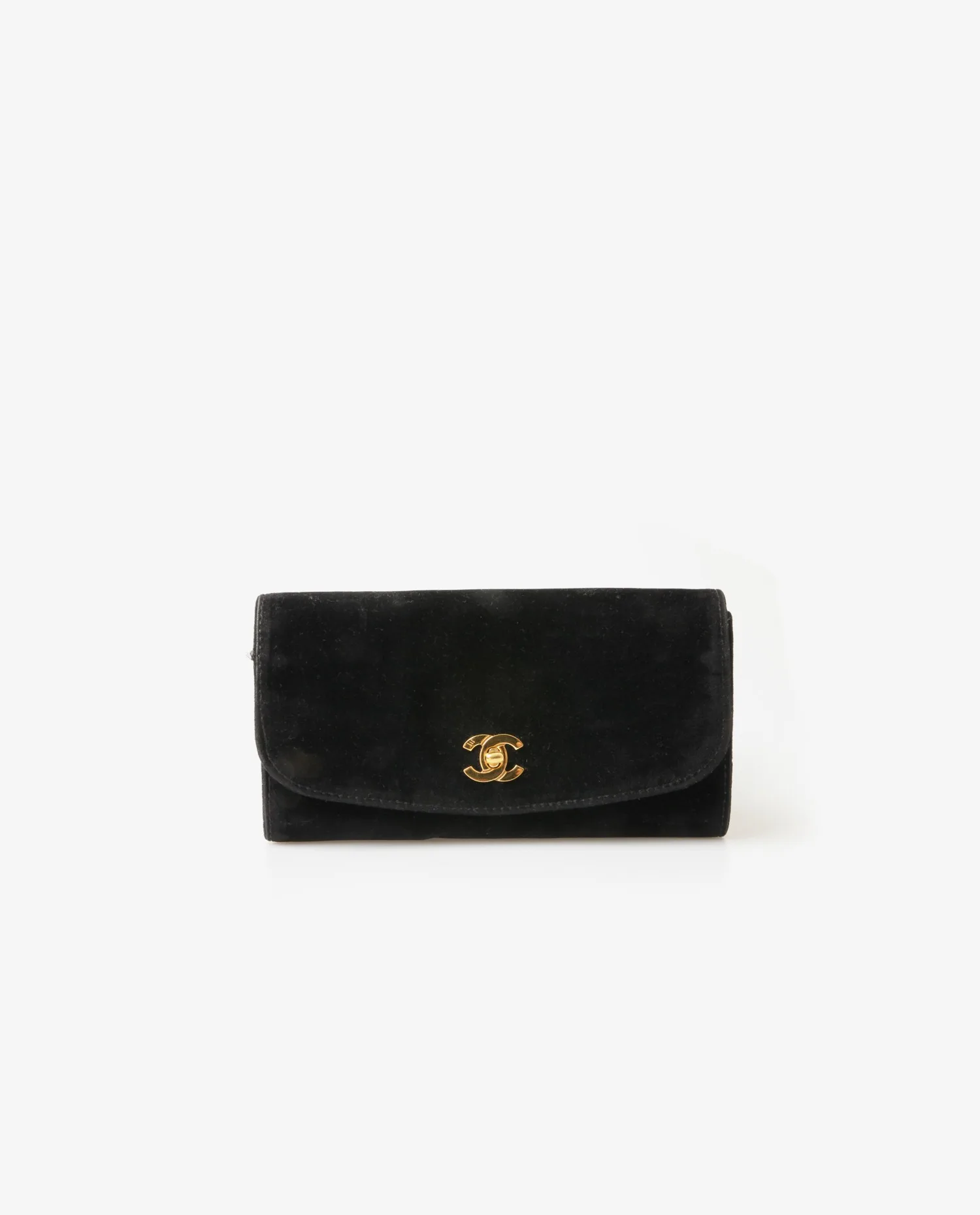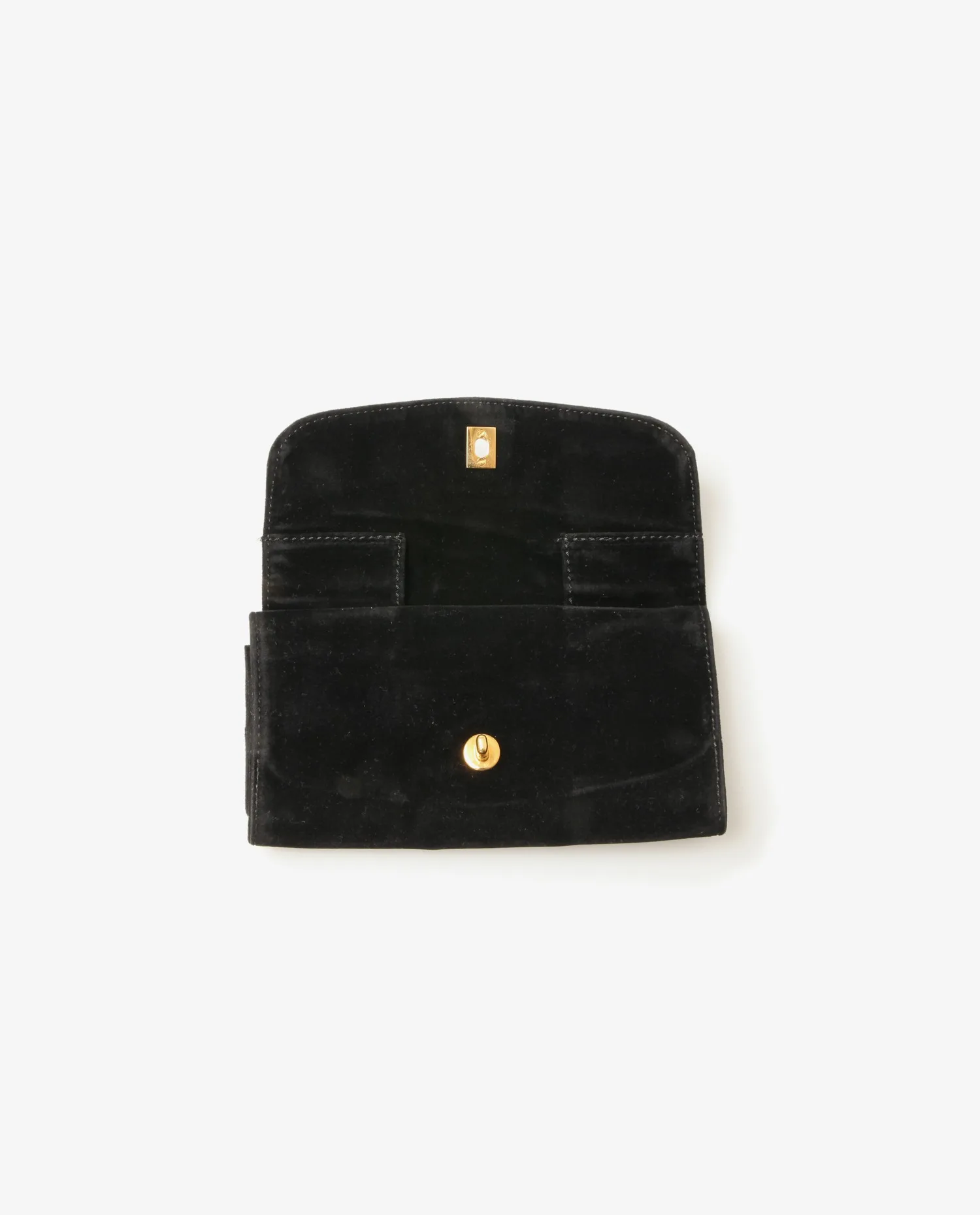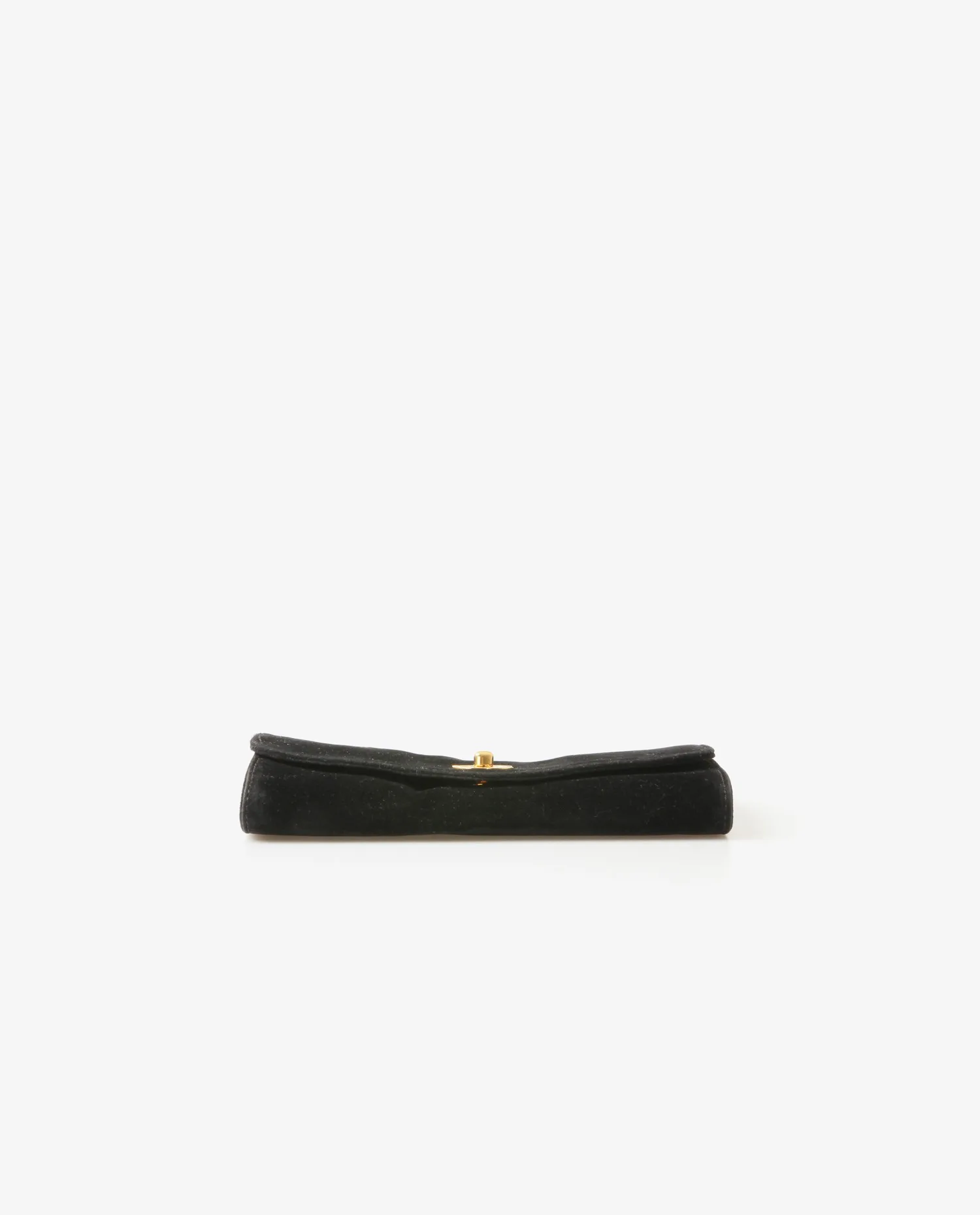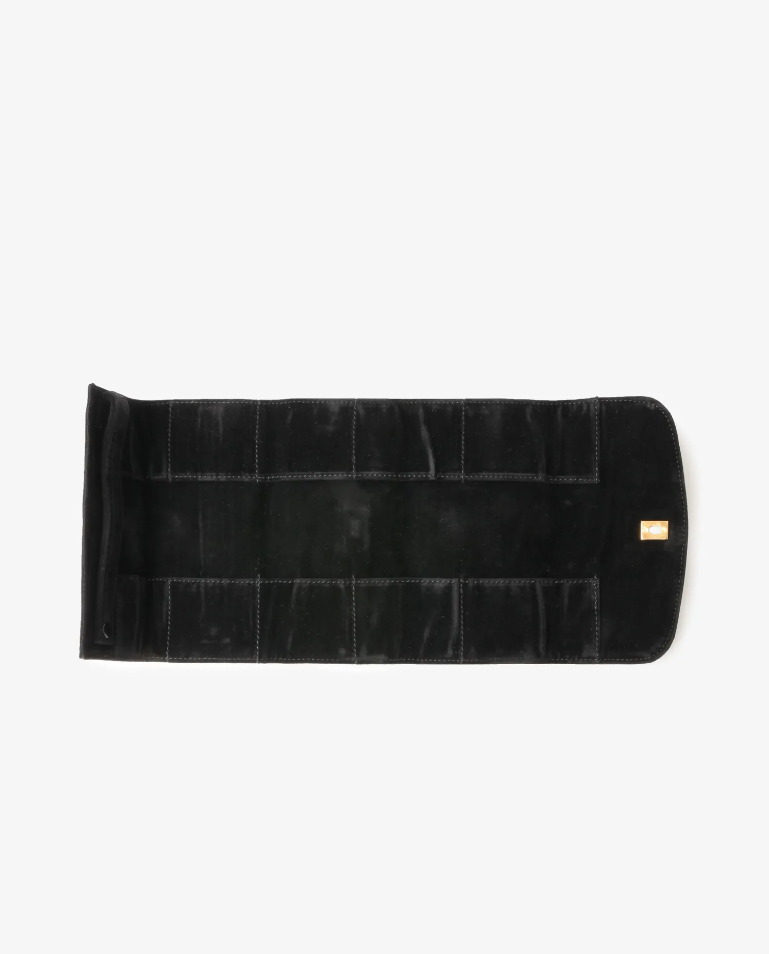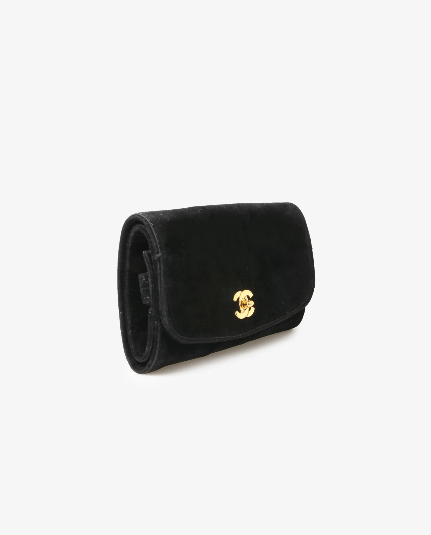 Ecrin à bijoux Chanel en veau velours noir. Fermoir “CC” doré. Il se déplie en 3 volets. Idéal pour le voyage. Quelques marques d’usure d’usage.