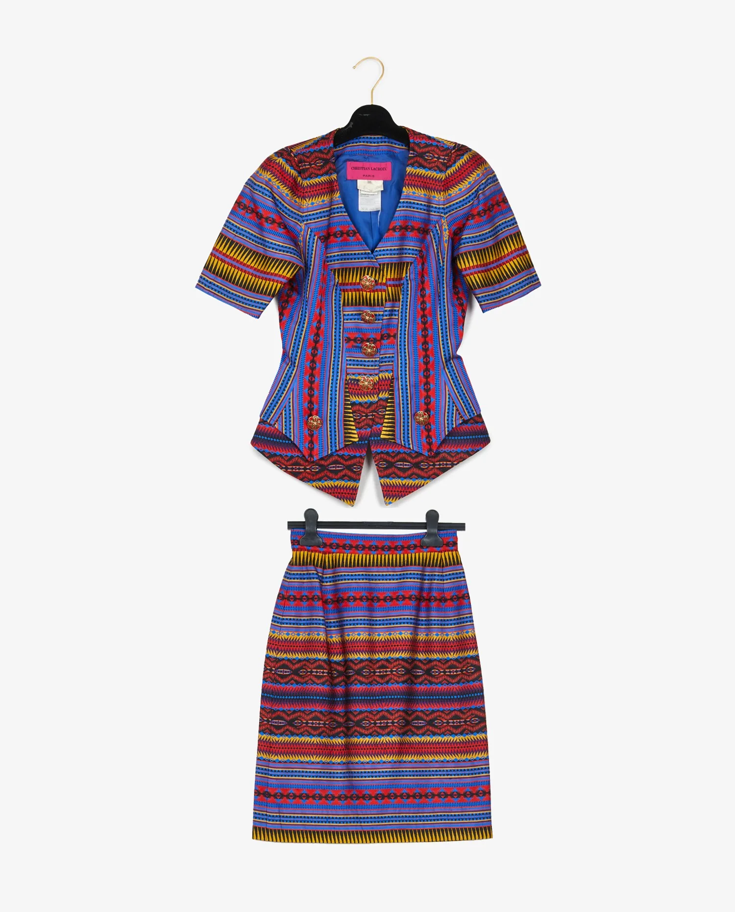 Le tissu en soie imprimée présente un motif géométrique complexe mêlant des bandes de rouge, bleu, noir, jaune et violet dans un agencement symétrique. La veste, longue de 67 cm, affiche une carrure de 36 cm et une poitrine de 42 cm. Elle se distingue par son col cranté, ses découpes princesse cintrantes et une fermeture par cinq boutons bijoux dorés en relief, en forme de fleurs stylisées. Les manches courtes de 26 cm sont légèrement structurées et les bas de manches nets, sans revers. La taille de la veste est marquée à 34 cm, pour un bas de 45 cm. La jupe assortie, droite et non fendue, mesure 57 cm de long, avec une taille haute de 31 cm et des hanches de 44 cm, pour un bas symétrique de 45 cm. Elle épouse naturellement les formes sans excès de volume.