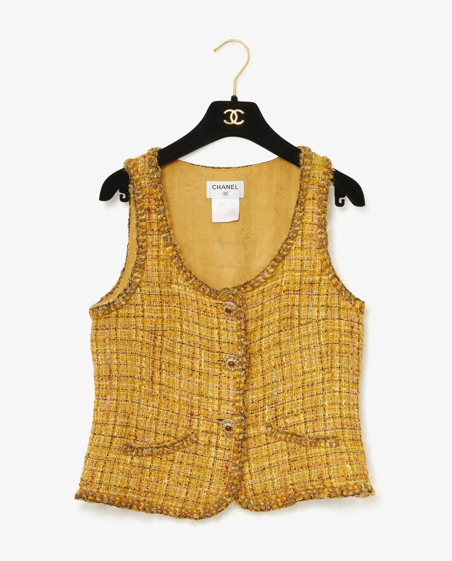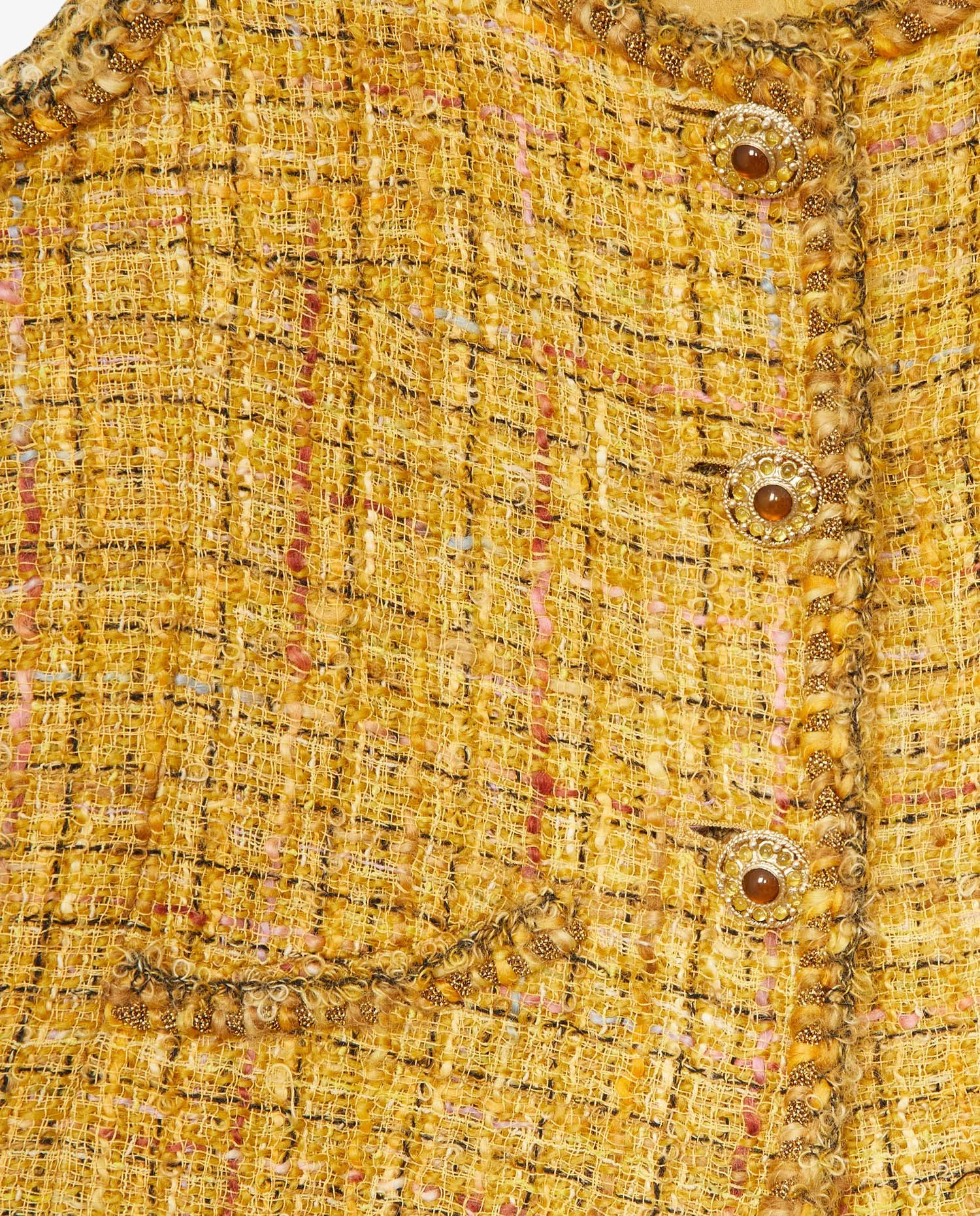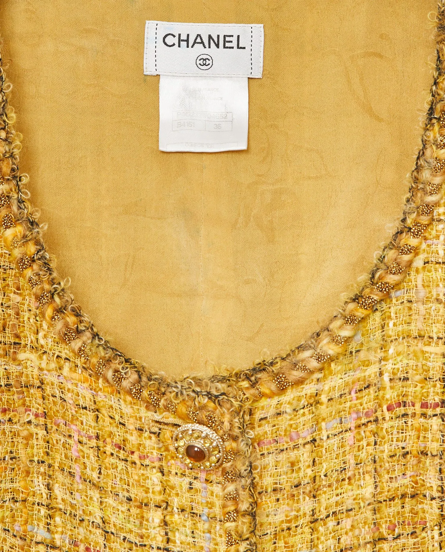 Ensemble Chanel en tweed jaune et strass. Boutons bijoux. Doublure en soie. En très bon état.