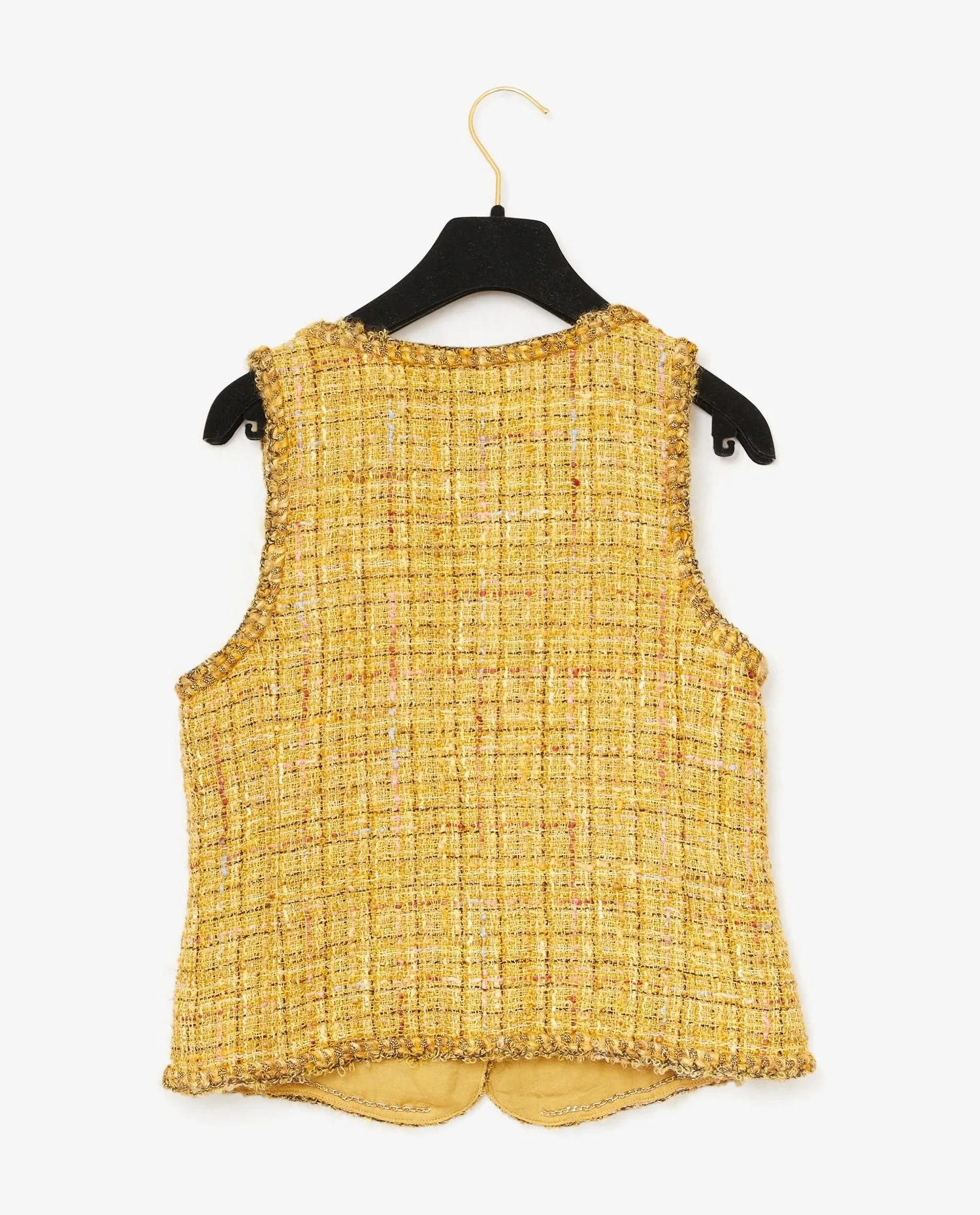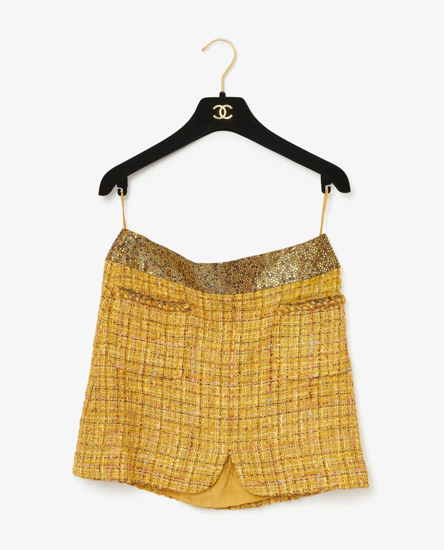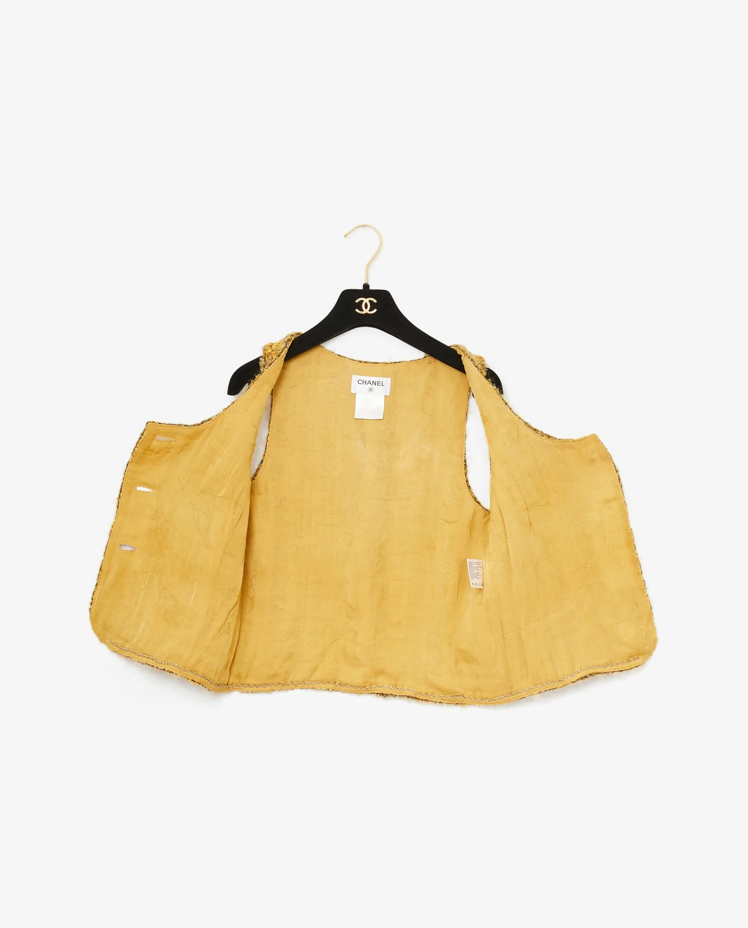 Ensemble Chanel en tweed jaune et strass. Boutons bijoux. Doublure en soie. En très bon état.