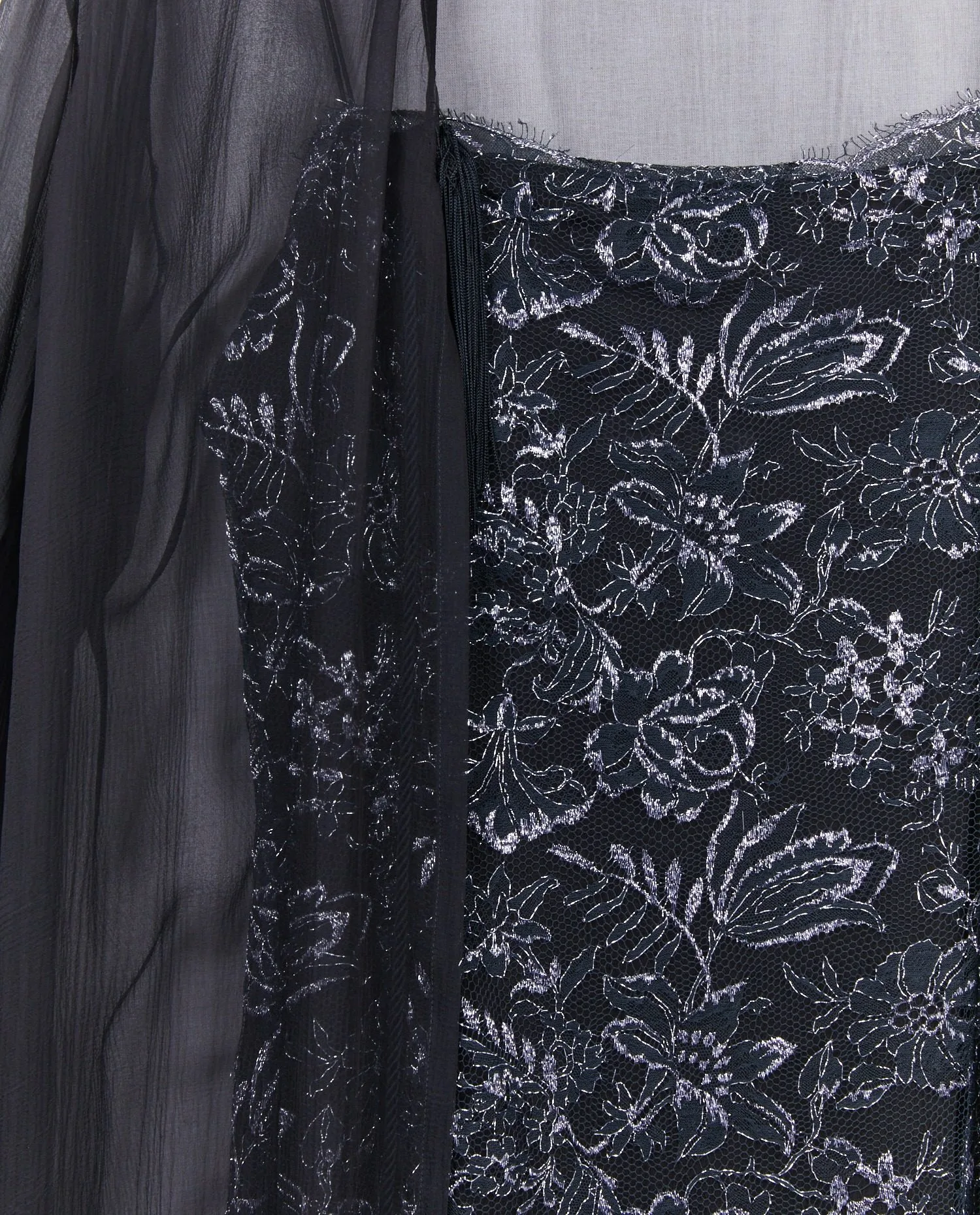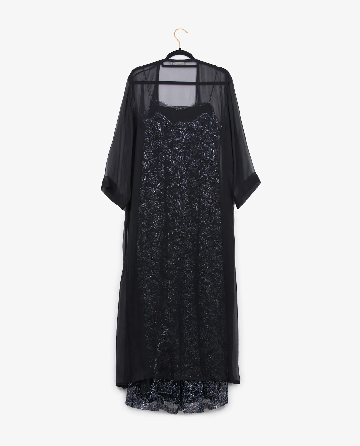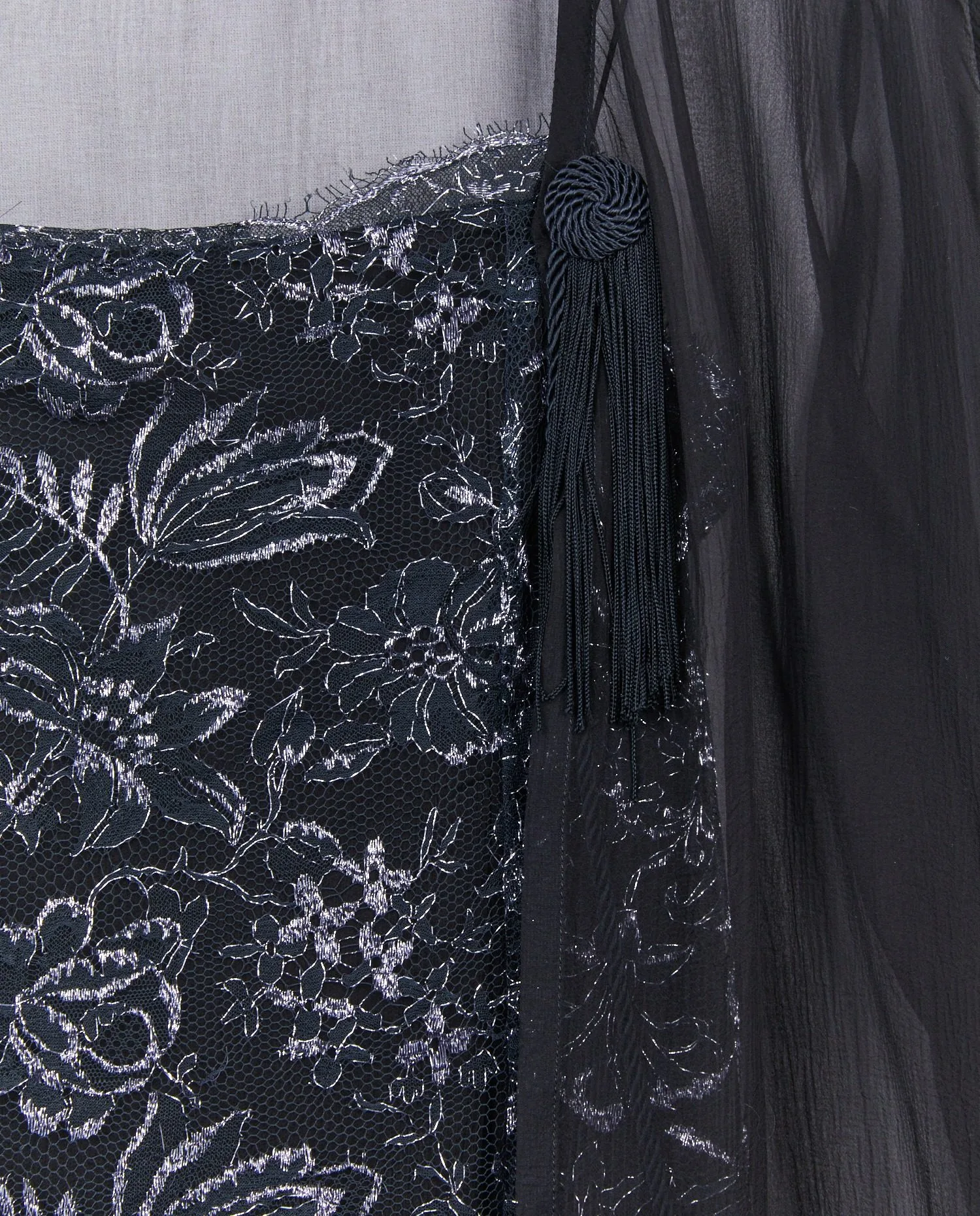 La robe est confectionnée en tulle noir délicat, entièrement brodé de motifs floraux argentés qui créent un effet de texture et de lumière subtil. Les bretelles fines dévoilent les épaules, tandis que la coupe longue légèrement évasée permet un mouvement fluide du tissu. L’encolure est bordée d’une fine dentelle effilée qui renforce l’aspect romantique du modèle. Le kimono, réalisé dans une mousseline de soie noire transparente, est ample et long, avec des manches larges et souples. Il se noue à l’avant grâce à des cordons terminés par des pampilles torsadées, ajoutant une touche décorative discrète et raffinée.