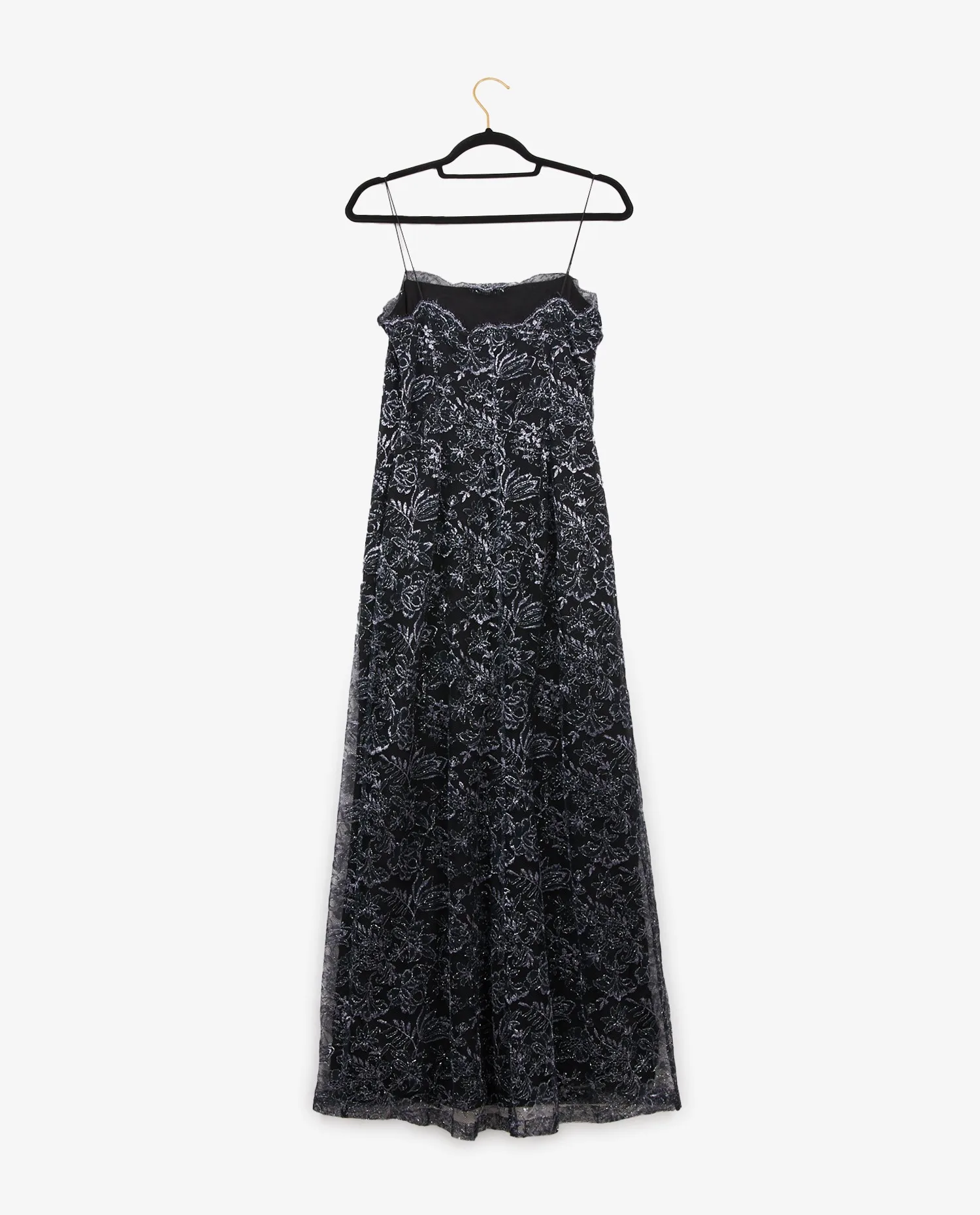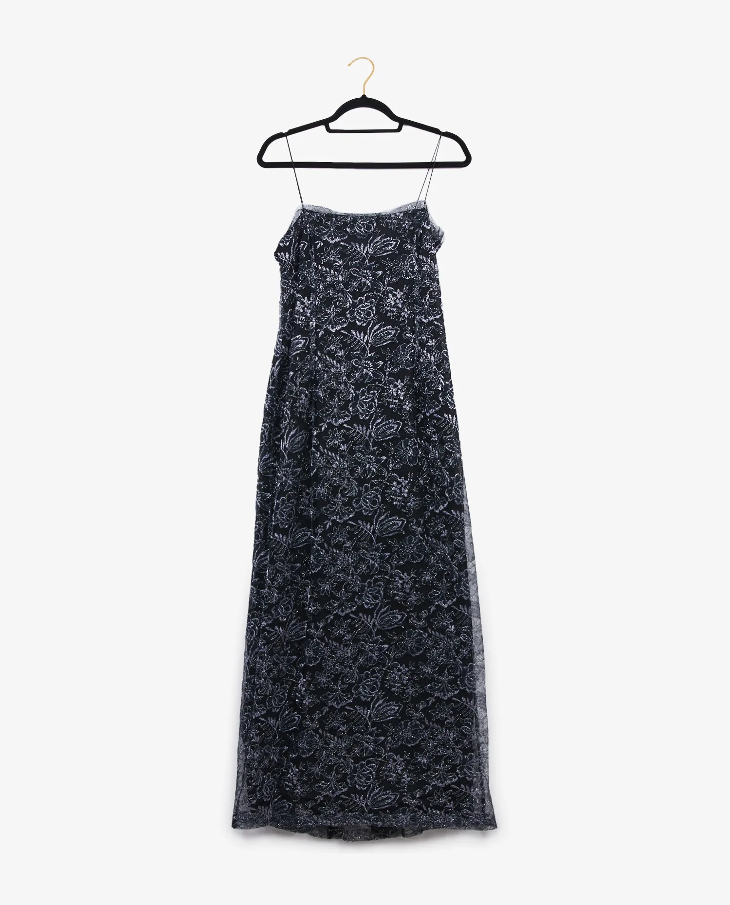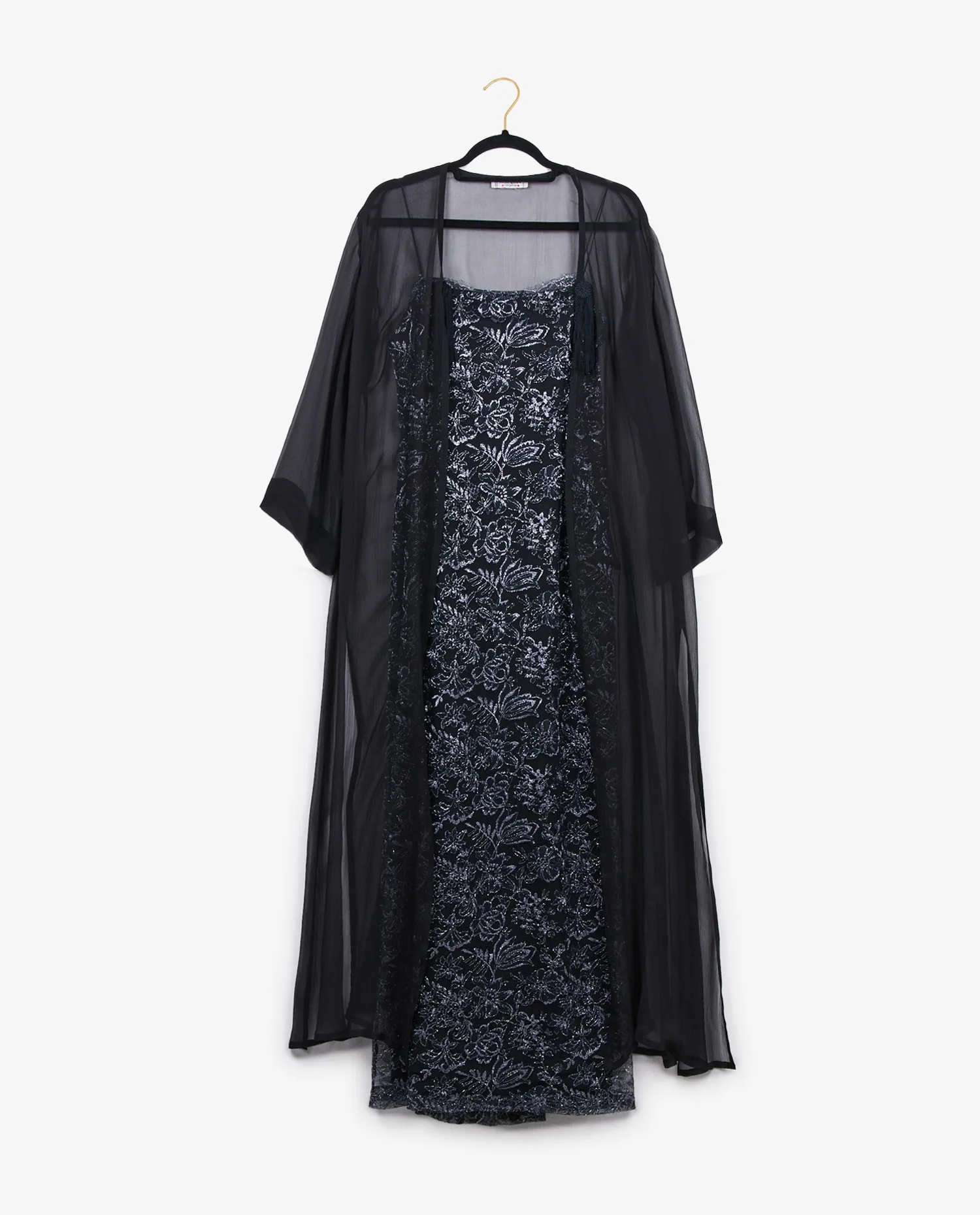 La robe est confectionnée en tulle noir délicat, entièrement brodé de motifs floraux argentés qui créent un effet de texture et de lumière subtil. Les bretelles fines dévoilent les épaules, tandis que la coupe longue légèrement évasée permet un mouvement fluide du tissu. L’encolure est bordée d’une fine dentelle effilée qui renforce l’aspect romantique du modèle. Le kimono, réalisé dans une mousseline de soie noire transparente, est ample et long, avec des manches larges et souples. Il se noue à l’avant grâce à des cordons terminés par des pampilles torsadées, ajoutant une touche décorative discrète et raffinée.