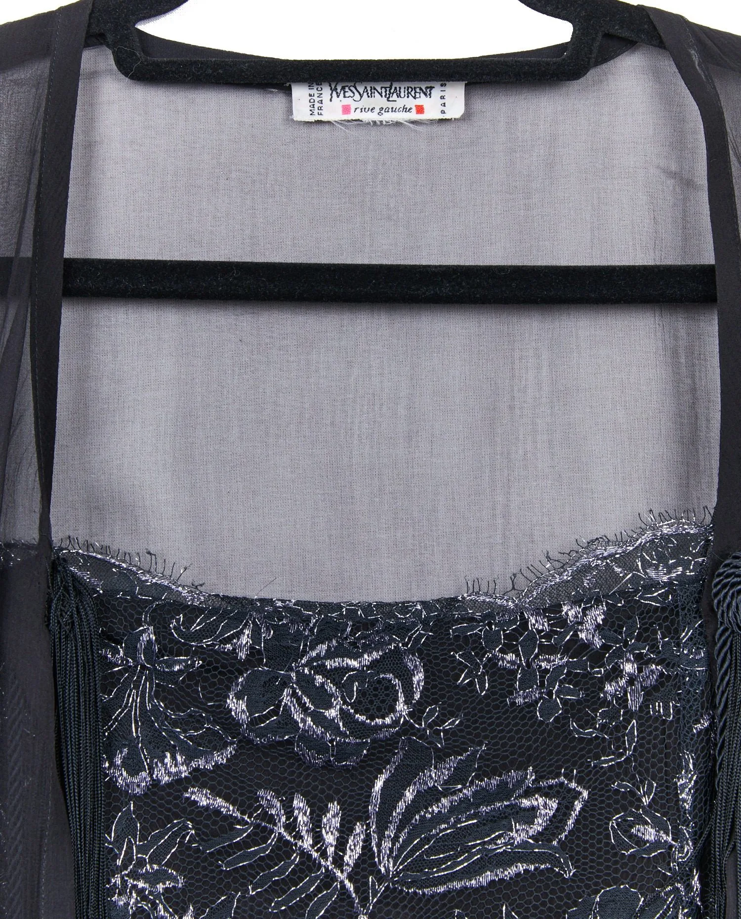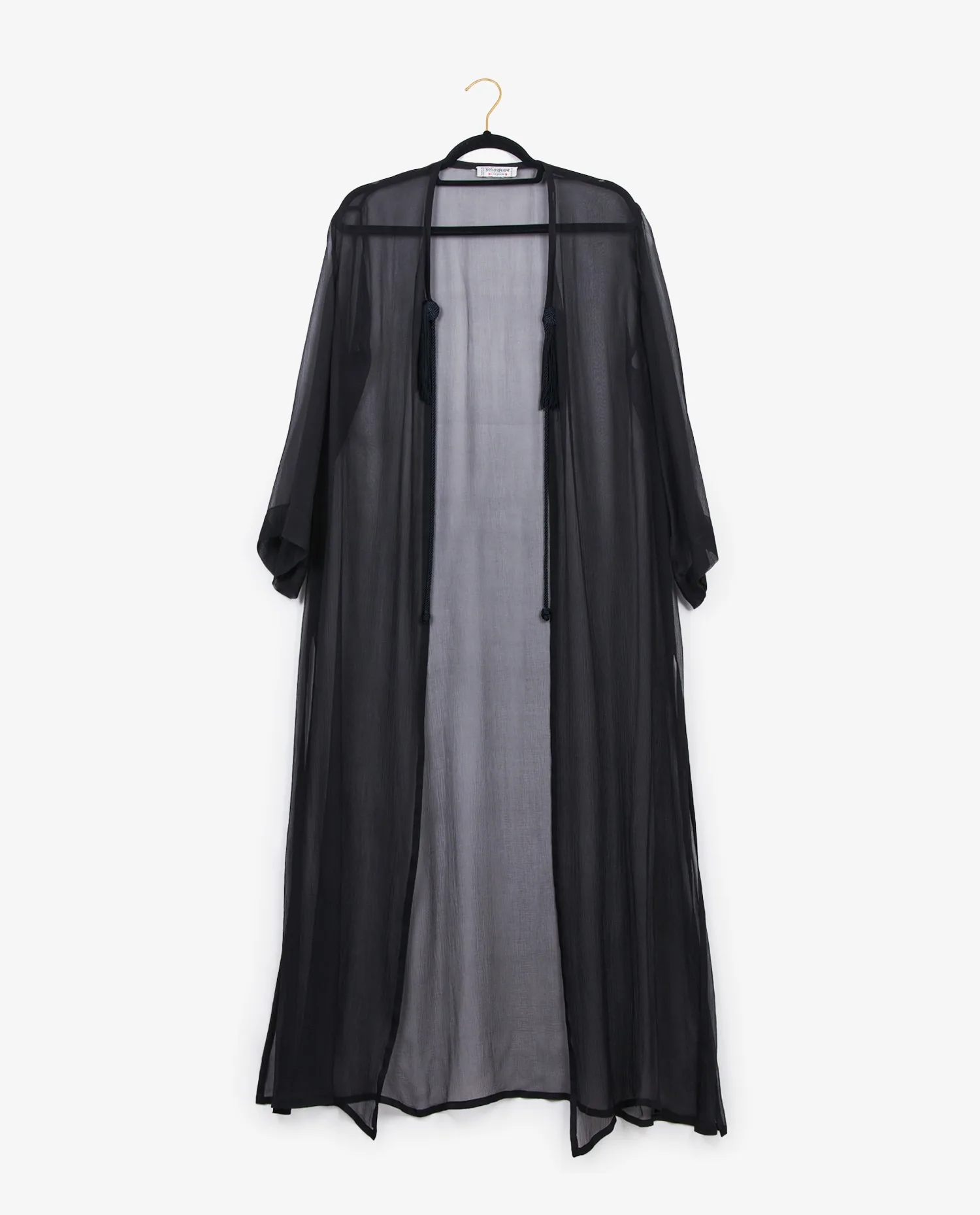 L’intérieur de la robe est doublé d’un voile noir léger qui assure à la fois confort et opacité, tout en respectant la fluidité de l’ensemble. Les finitions sont propres, avec des coutures invisibles et une fermeture latérale discrète. Le kimono, non doublé, met en valeur la transparence de la mousseline et le contraste de matières avec la robe. L’étiquette intérieure « Yves Saint Laurent Rive Gauche – Made in France » atteste de l’authenticité de la pièce.