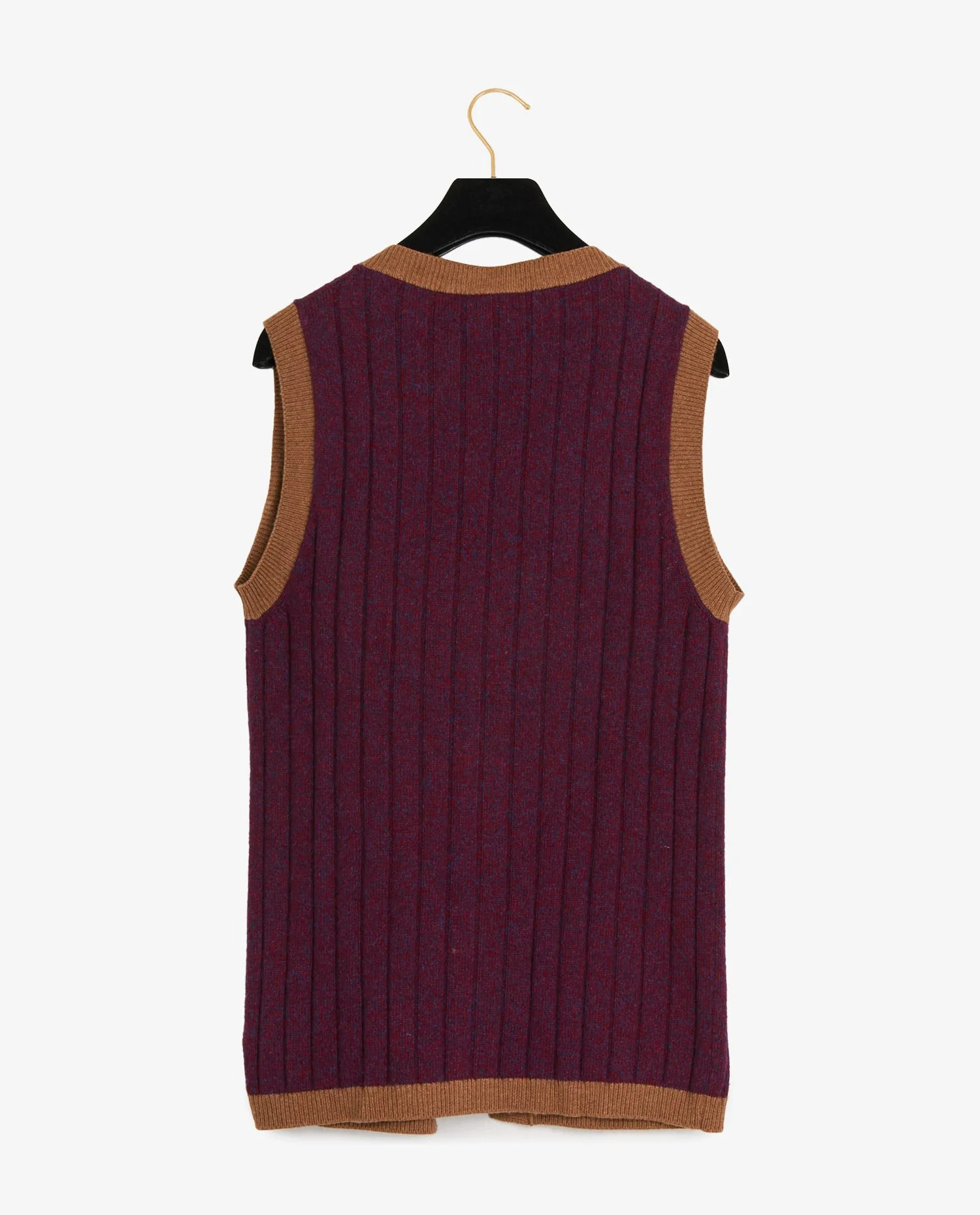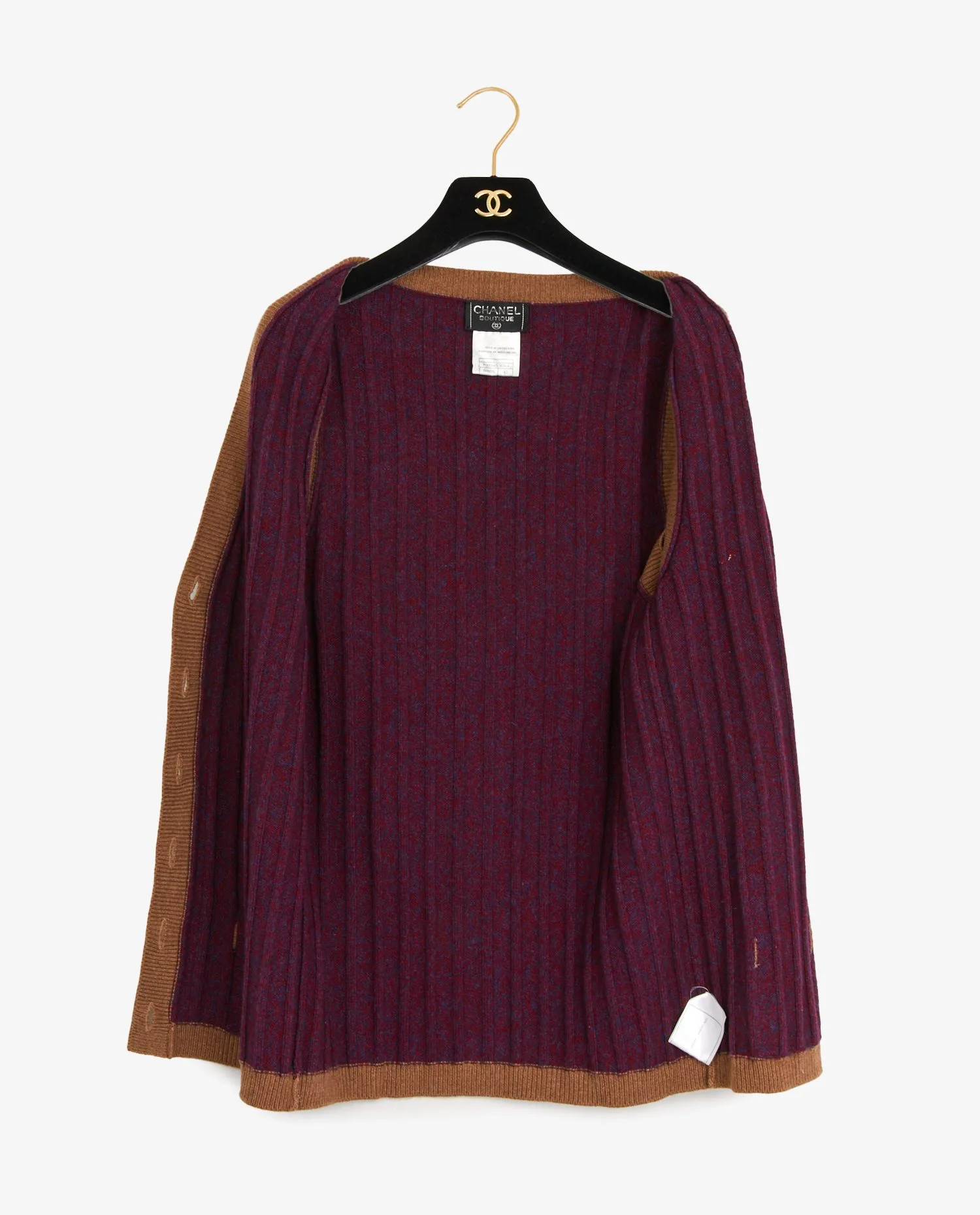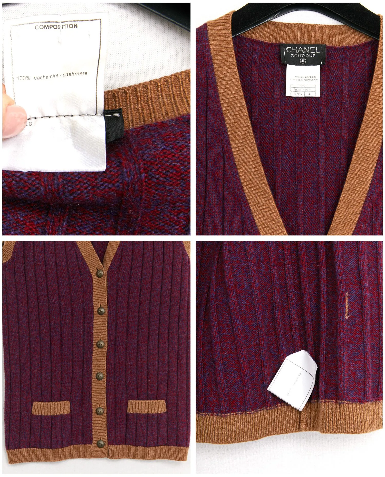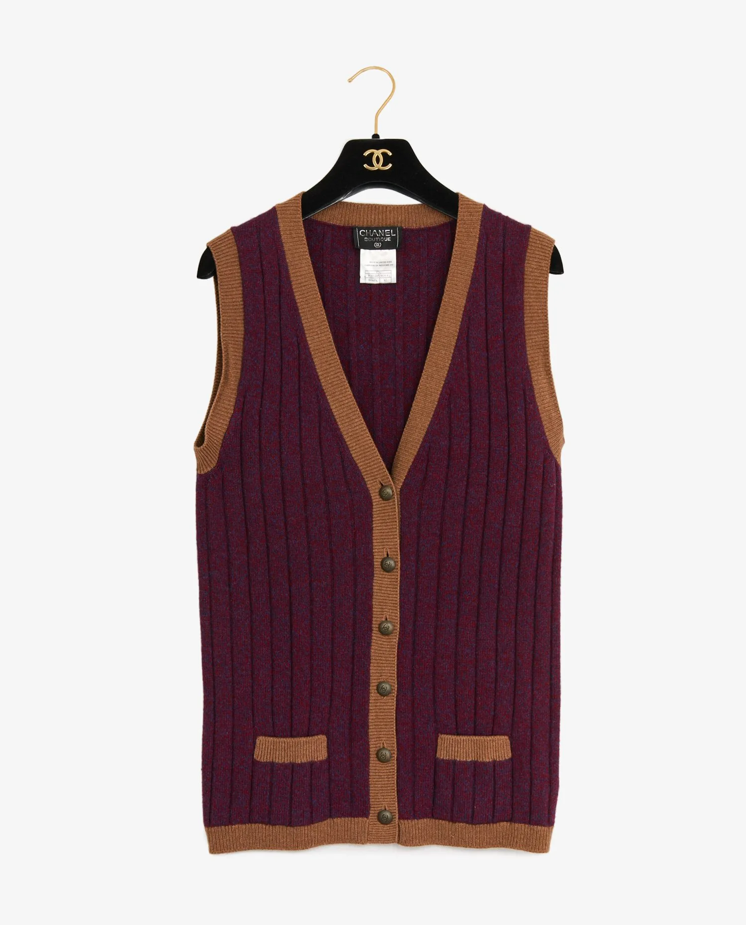 Gilet sans manches Chanel en cachemire bicolore bordeaux et marron. Collection Automne 1997. Taille 42. Les boutons sont en métal doré vieilli siglés CC. Col V. En très bon état.