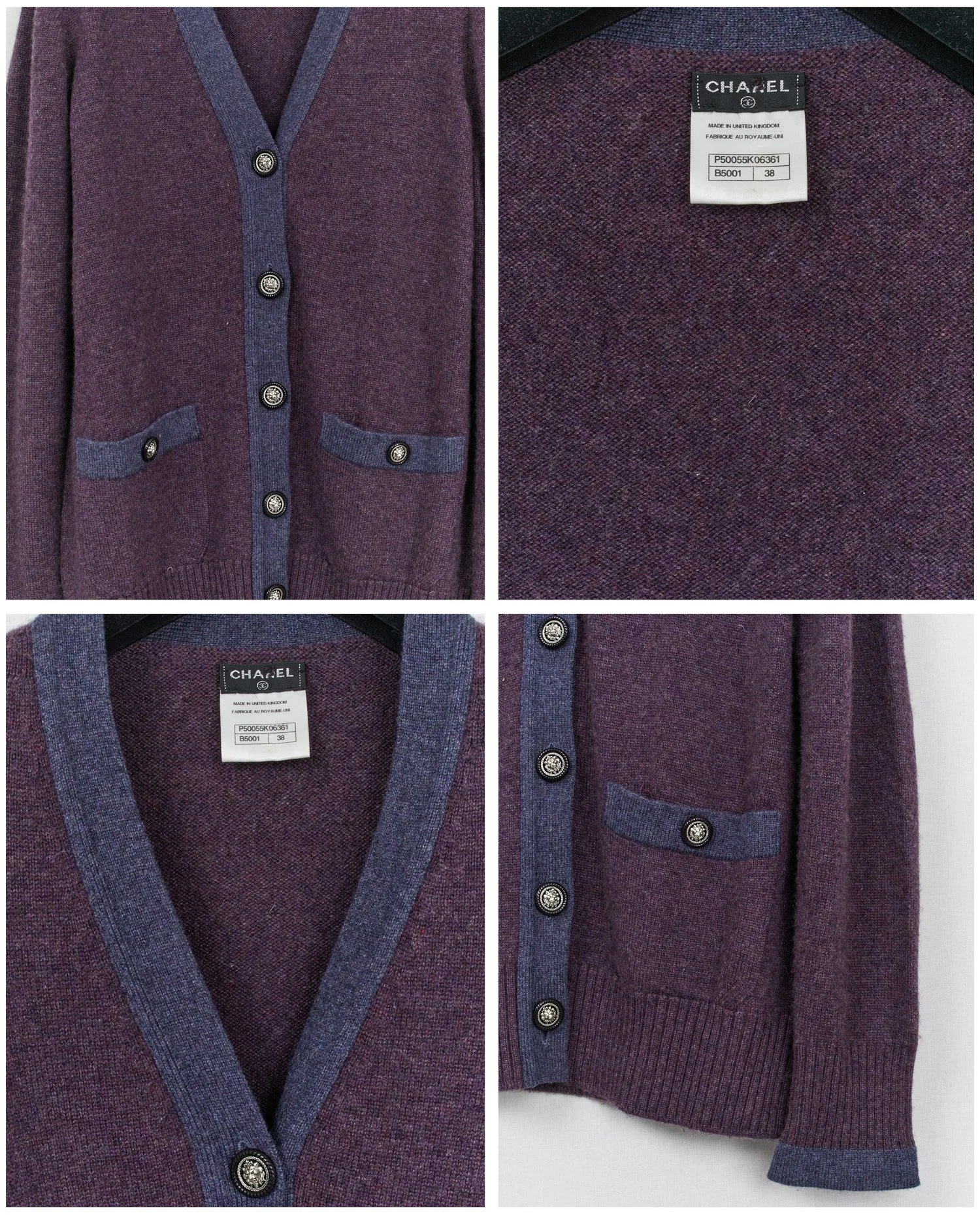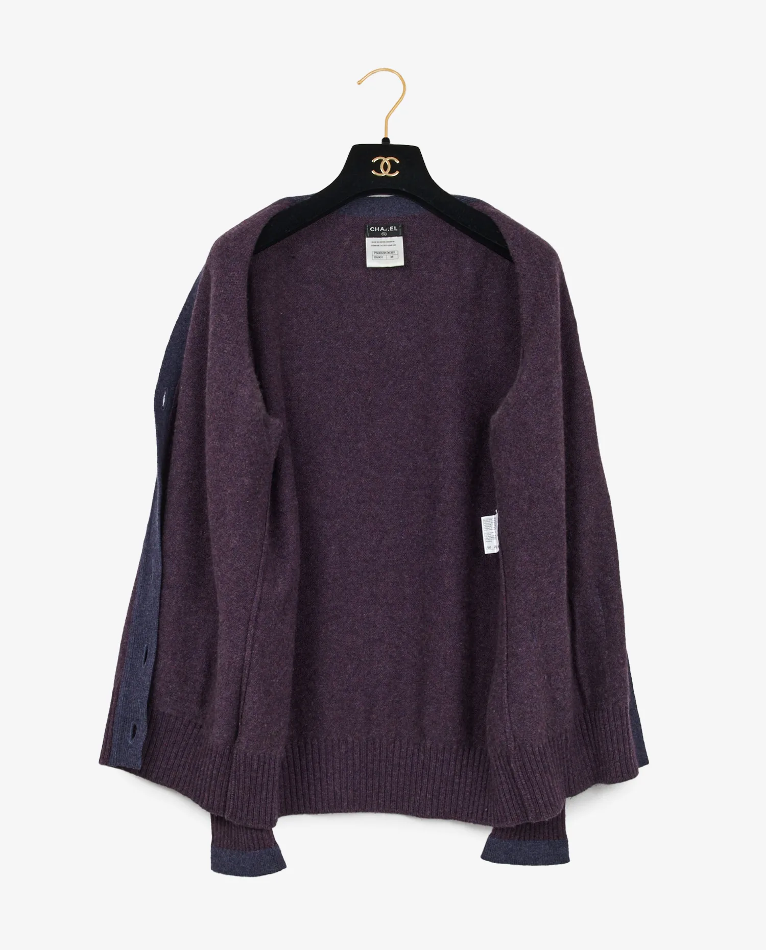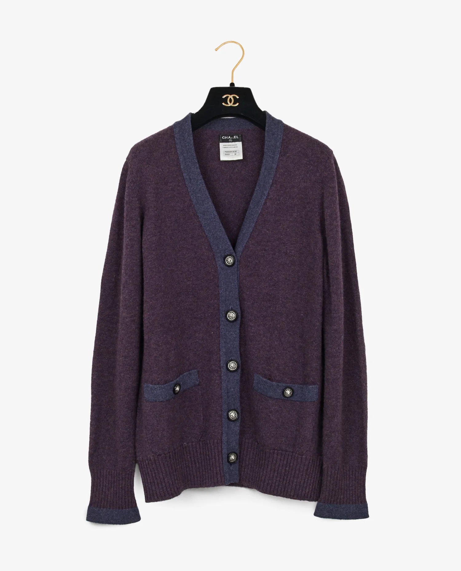 Gilet Chanel cachemire bicolore violet. Col V. Taille 38. En très bon état.