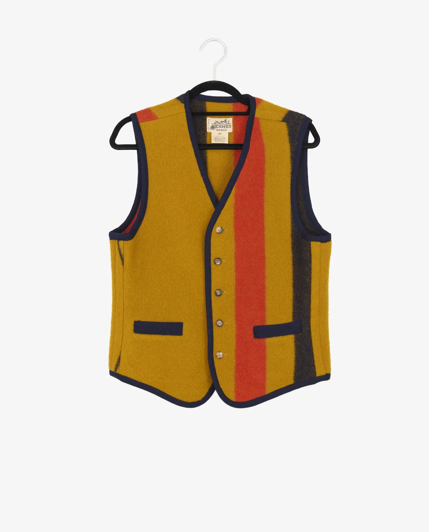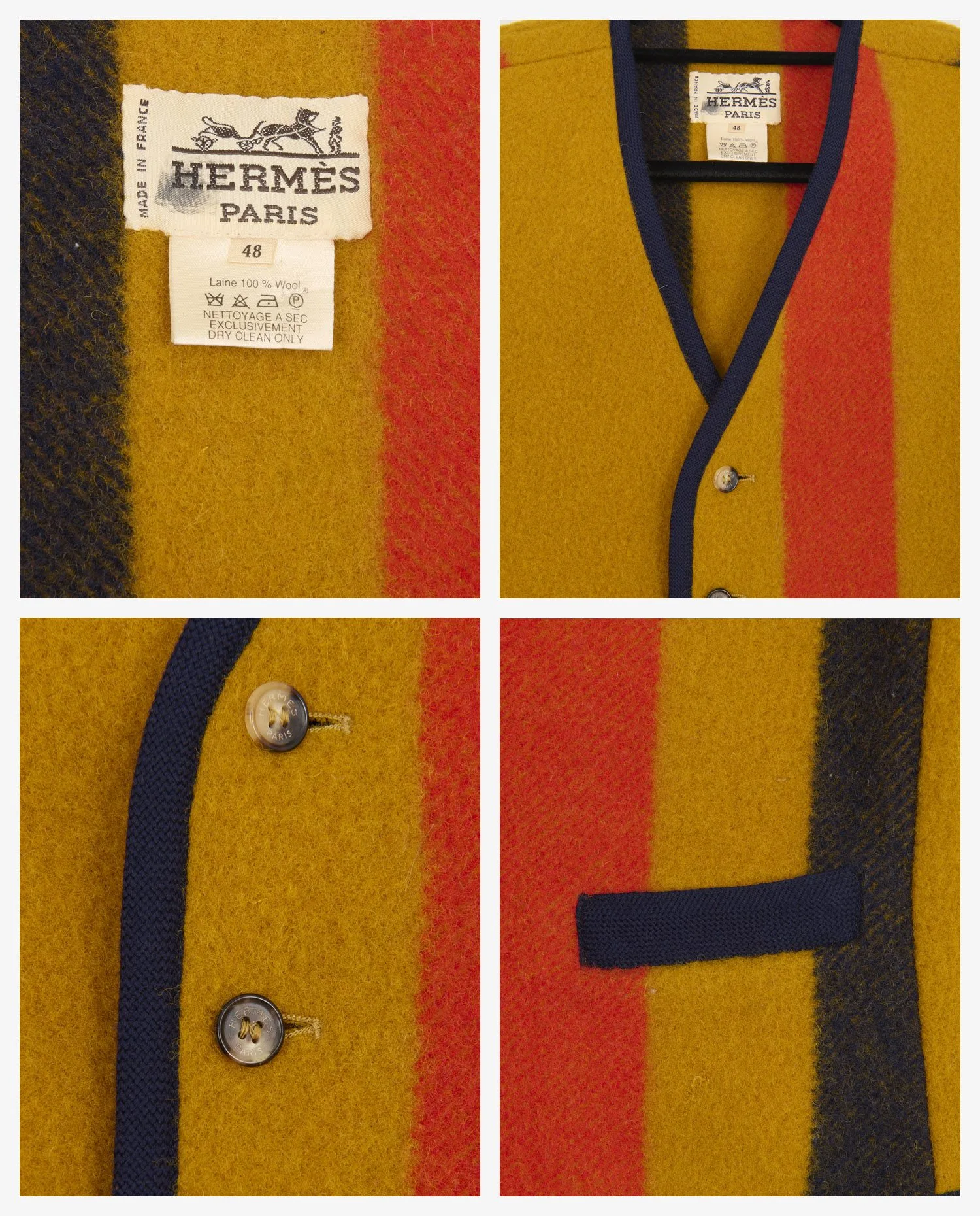 Les vêtements en laine rayée ont connu un succès particulier dans les années 1970 et 1980, période durant laquelle Hermès a développé une série de pièces casual chic influencées par l’univers équestre et le style workwear européen. Ce gilet s’inscrit dans cette tradition, avec une construction simple mais précise et des couleurs évoquant les couvertures de selle anciennes, chères à l’héritage de la maison. Ce type de pièce fonctionnelle et décorative faisait partie des collections masculines Hermès destinées aux saisons froides.