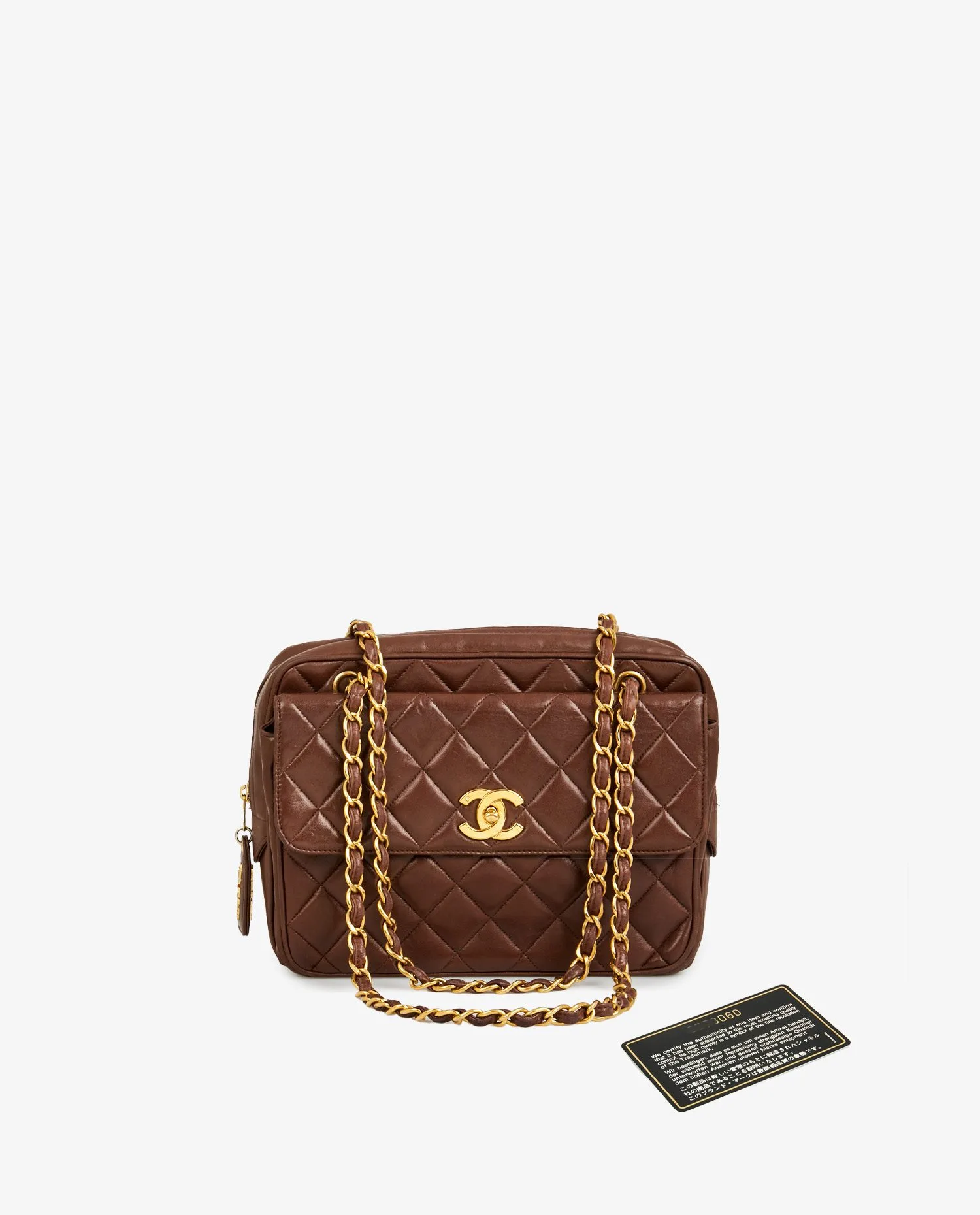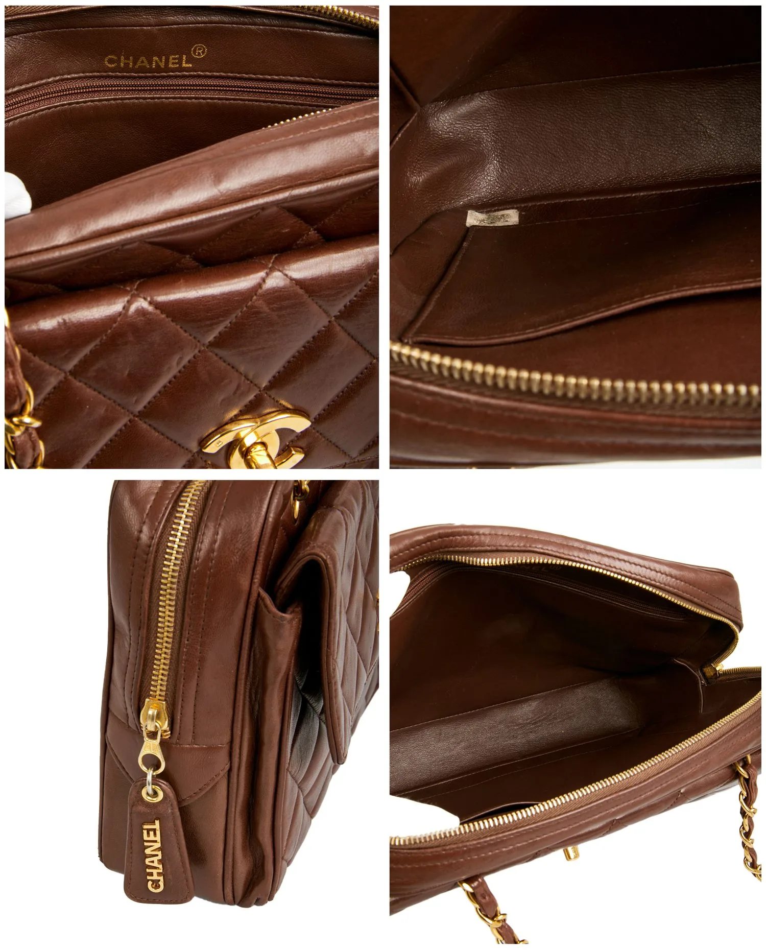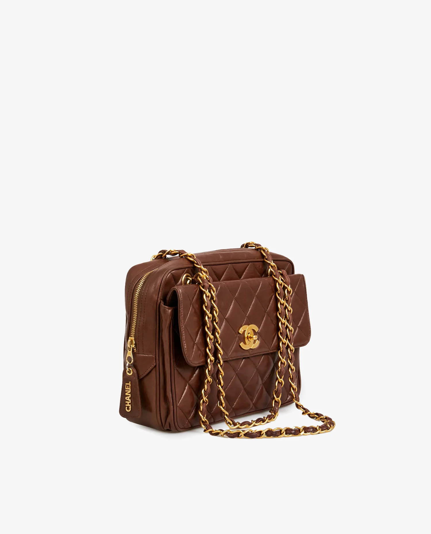 Grand sac Caméra Chanel vintage en cuir d’agneau matelassé marron. La bijouterie est en métal doré plaqué or 24K. Fermeture zippée. Il dispose également d’une grande poche à l’avant fermée par un rabat et un fermoir CC doré. En très bon état.