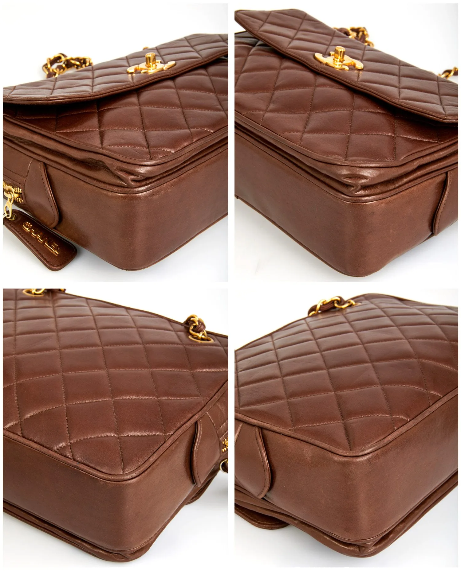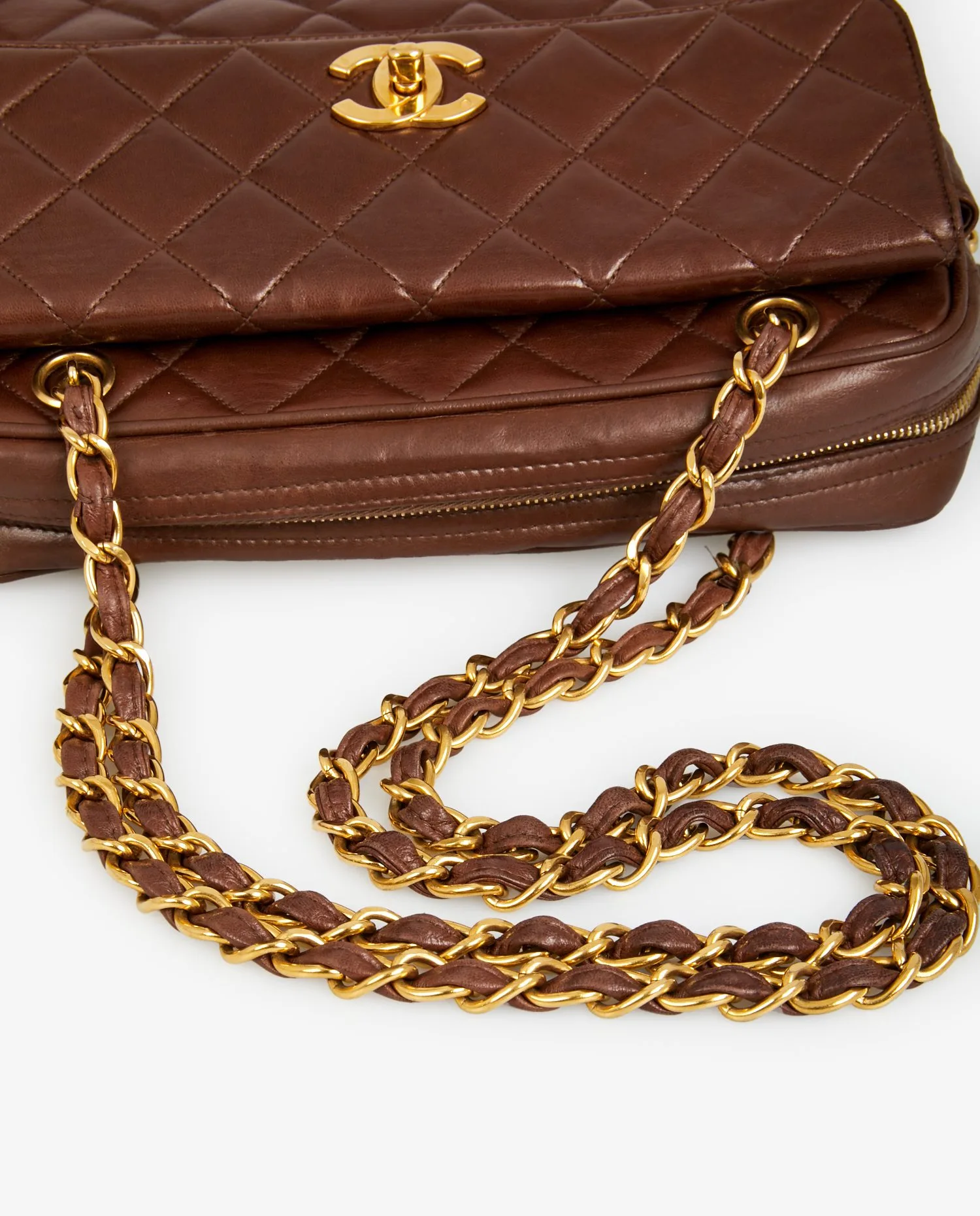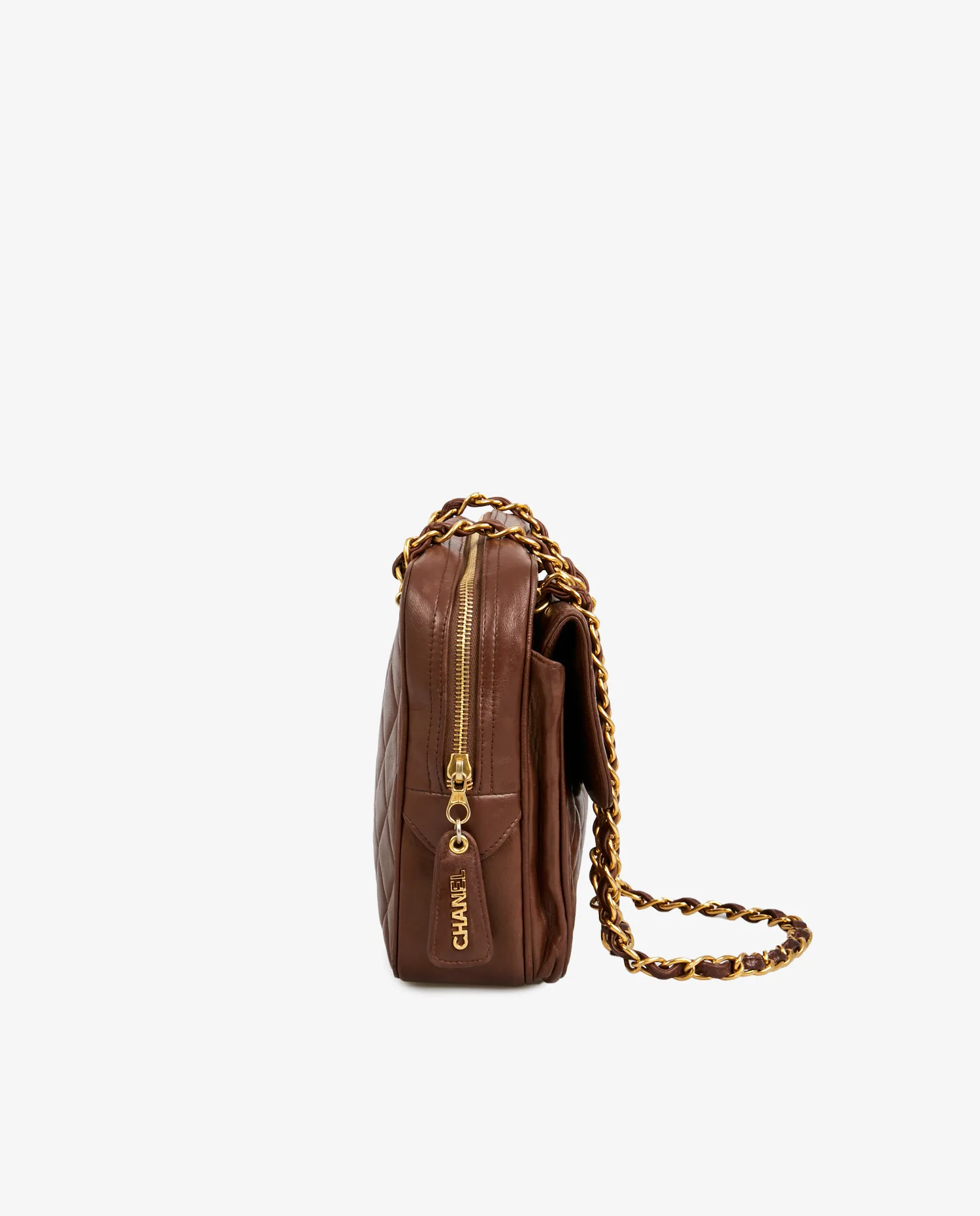 Grand sac Caméra Chanel vintage en cuir d’agneau matelassé marron. La bijouterie est en métal doré plaqué or 24K. Fermeture zippée. Il dispose également d’une grande poche à l’avant fermée par un rabat et un fermoir CC doré. En très bon état.