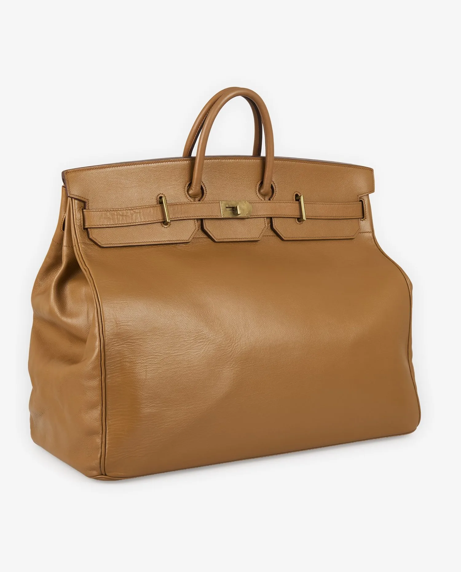 Le Haut à Courroies (ou “HAC”) est le tout premier sac de voyage conçu par Hermès à la fin du XIXe siècle pour transporter des bottes d’équitation et autres objets volumineux. C’est ce modèle qui a inspiré la création du Birkin dans les années 1980. La version présentée ici, datée de 1982 (lettre “L” dans un rond), illustre parfaitement la transition entre tradition équestre et luxe moderne. Le cuir Epsom, introduit plus tardivement, confère à cette version un aspect rigide et élégant, tout en restant léger et facile à entretenir.