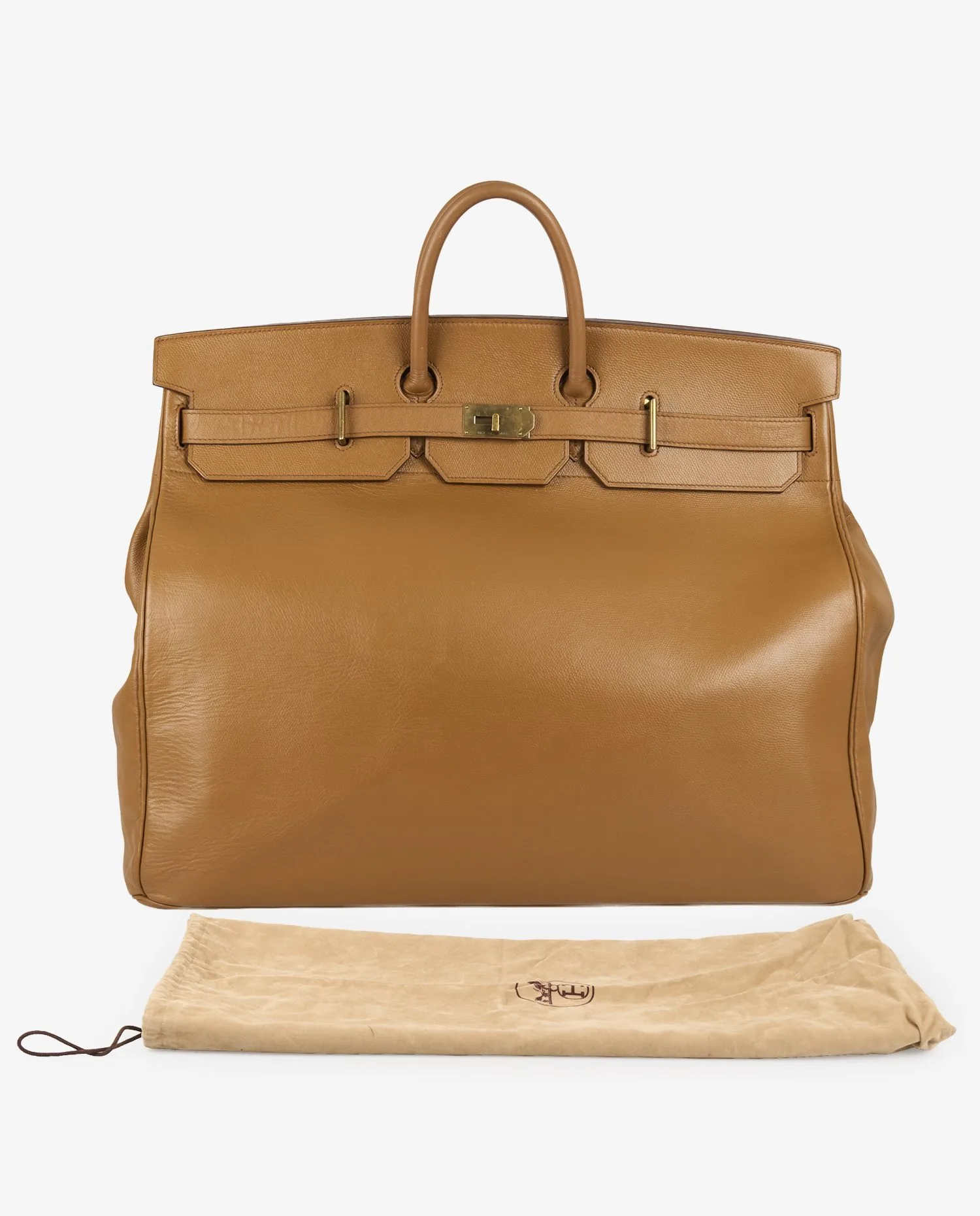 Le cuir Epsom gold présente un grain léger et régulier, caractéristique de ce cuir embossé résistant aux rayures. La finition est soulignée par des surpiqûres ton sur ton et un ensemble de pièces métalliques dorées, comprenant le fermoir tourniquet signé “Hermès Paris”, les plaques de courroies et le cadenas. Le sac repose sur un fond rigide renforcé par des bandes de cuir cloutées. Les poignées sont robustes et confortables à la main, adaptées à une utilisation en bagage à main ou sac de week-end.