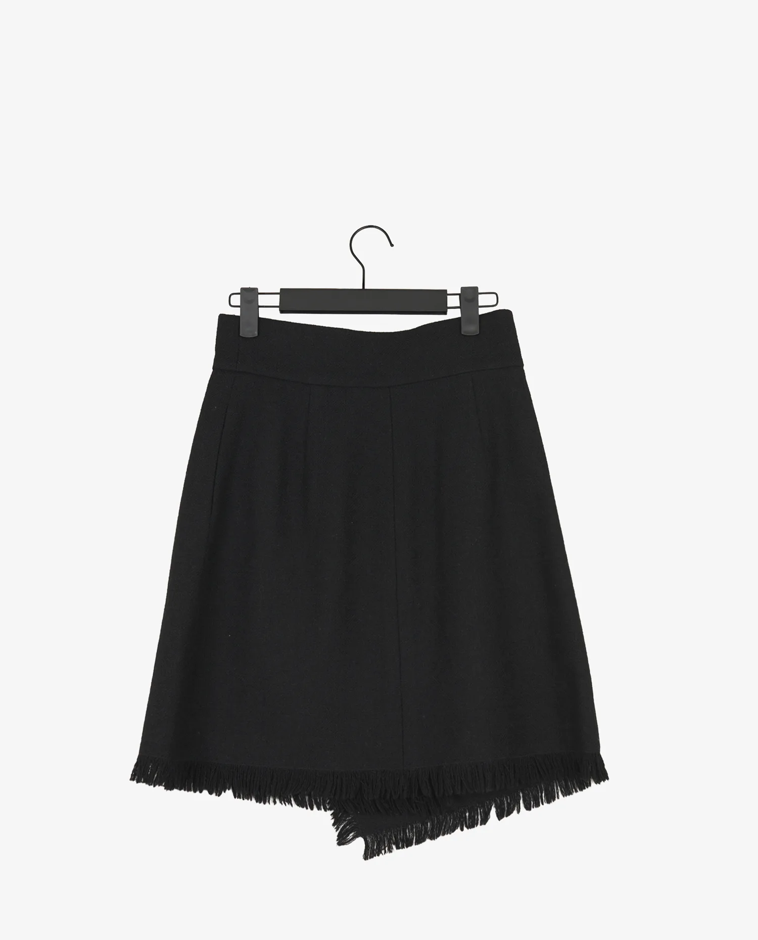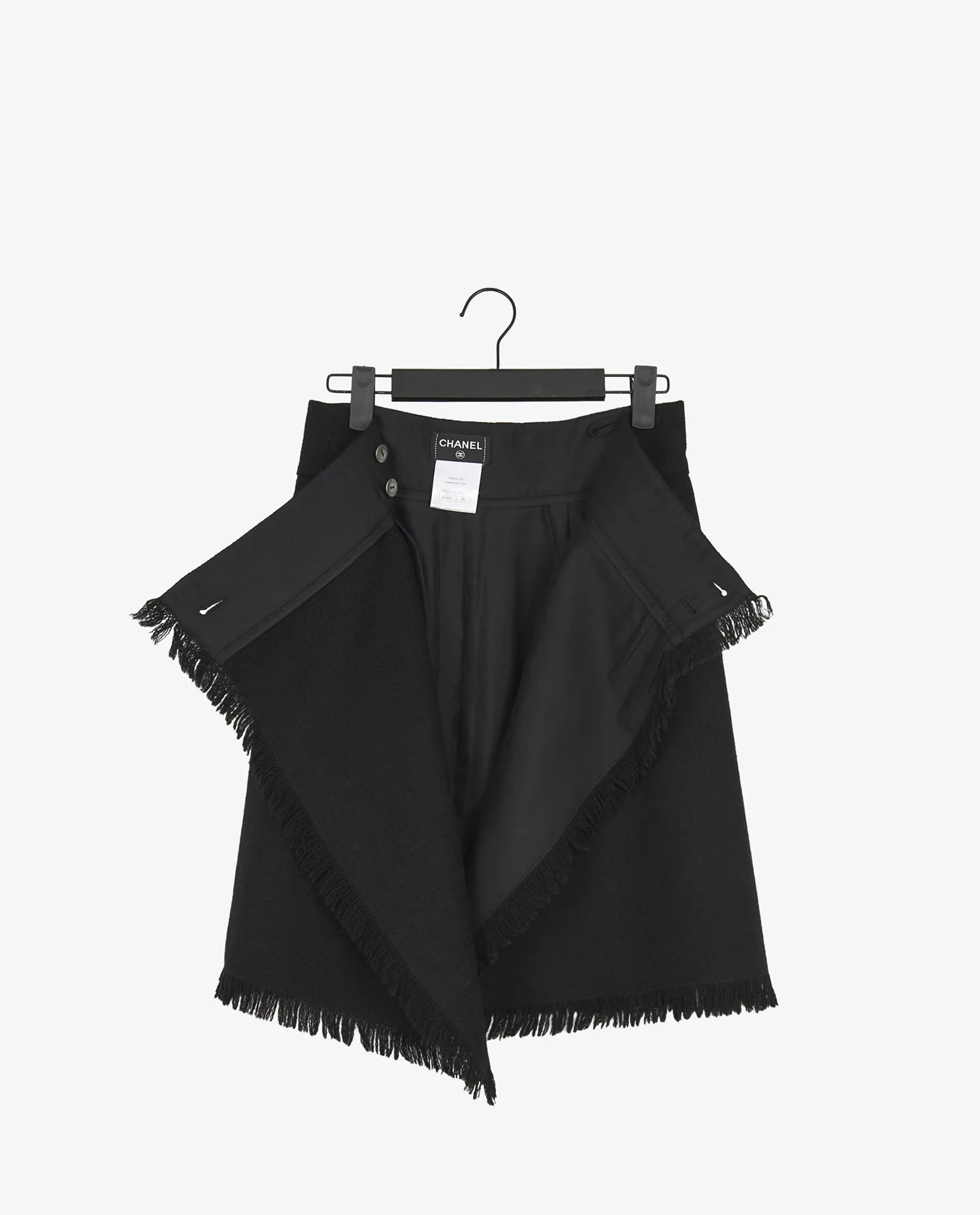 Le tweed noir présente une texture dense et régulière, offrant structure et maintien. La coupe portefeuille crée un effet croisé sur le devant, maintenu par un bouton siglé Chanel en métal, orné du double C. Les finitions frangées soulignent les lignes du pan croisé ainsi que l’ourlet inférieur, apportant un contraste subtil entre rigueur de la coupe et souplesse du textile. La taille est marquée par une ceinture structurée, assurant un bon maintien. La longueur courte et la forme légèrement trapèze permettent un porté ajusté tout en conservant une aisance de mouvement.