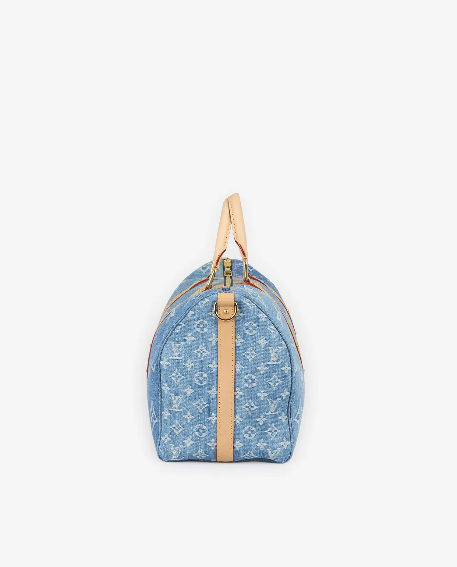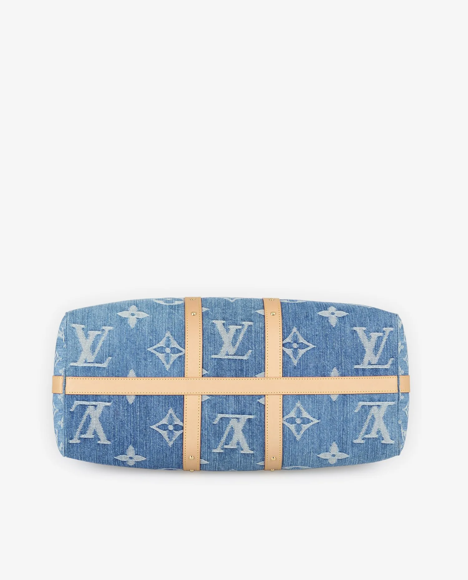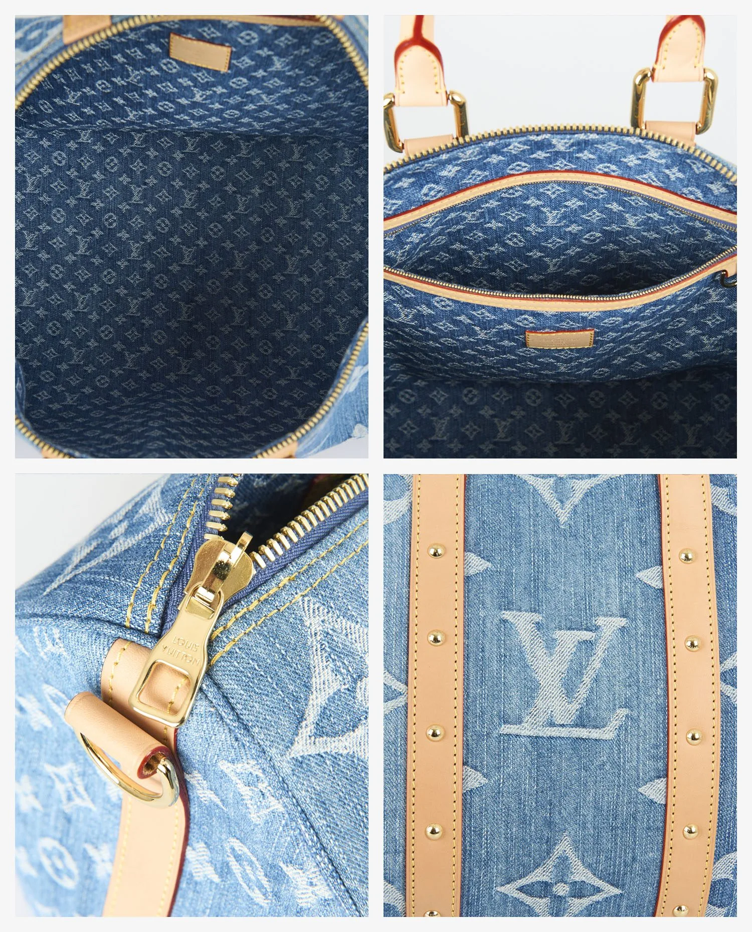 La toile de denim affiche un Monogram oversize sur les deux faces principales ainsi que sur le dessous, créant un impact visuel fort. Les côtés du sac arborent un Monogram plus fin, resserré, qui apporte une variation discrète et raffinée. Deux larges bandes verticales en cuir de vache naturel, encore clair car non patiné, parcourent les extrémités du sac. Chaque bande est ponctuée d’une série de rivets dorés parfaitement alignés, qui se prolongent sur les faces et accentuent la structure du sac sans alourdir la ligne. Les poignées roulées, la bandoulière amovible avec épaulière, et l’étiquette de bagage sont également en cuir naturel. Les pièces métalliques — fermetures éclair, mousquetons, cadenas gravé — sont en laiton doré poli, sans trace d’oxydation ni rayure. L’ensemble est intégralement neuf.