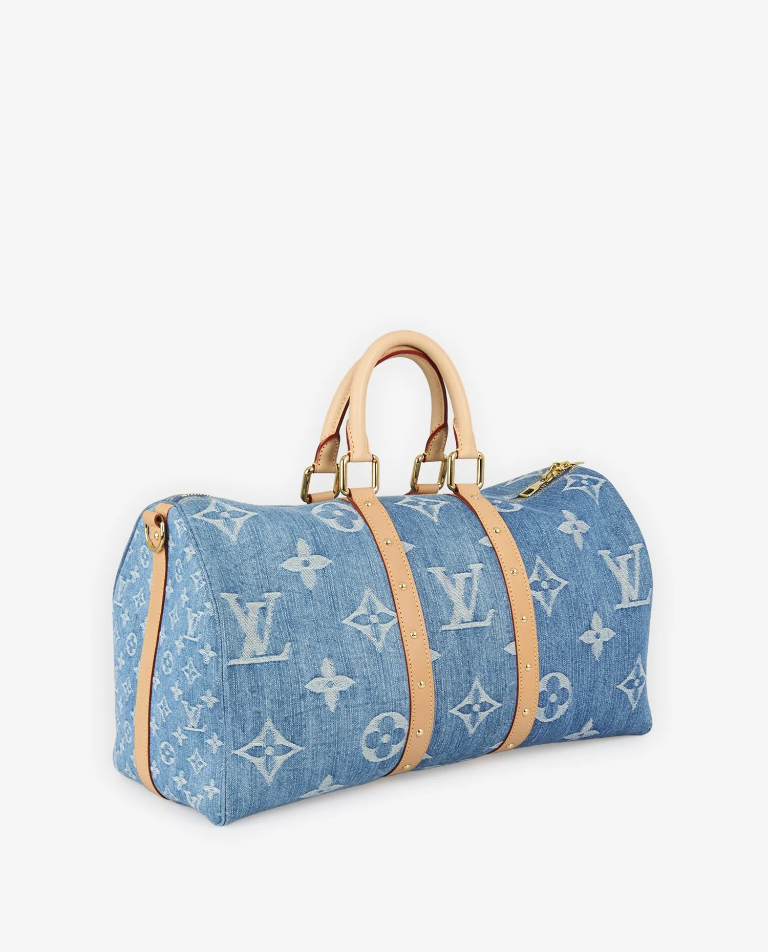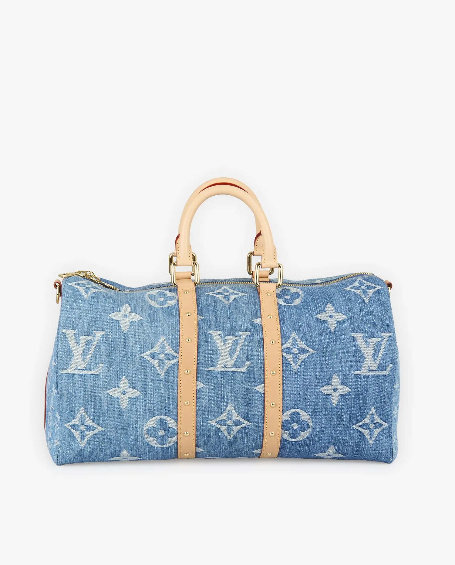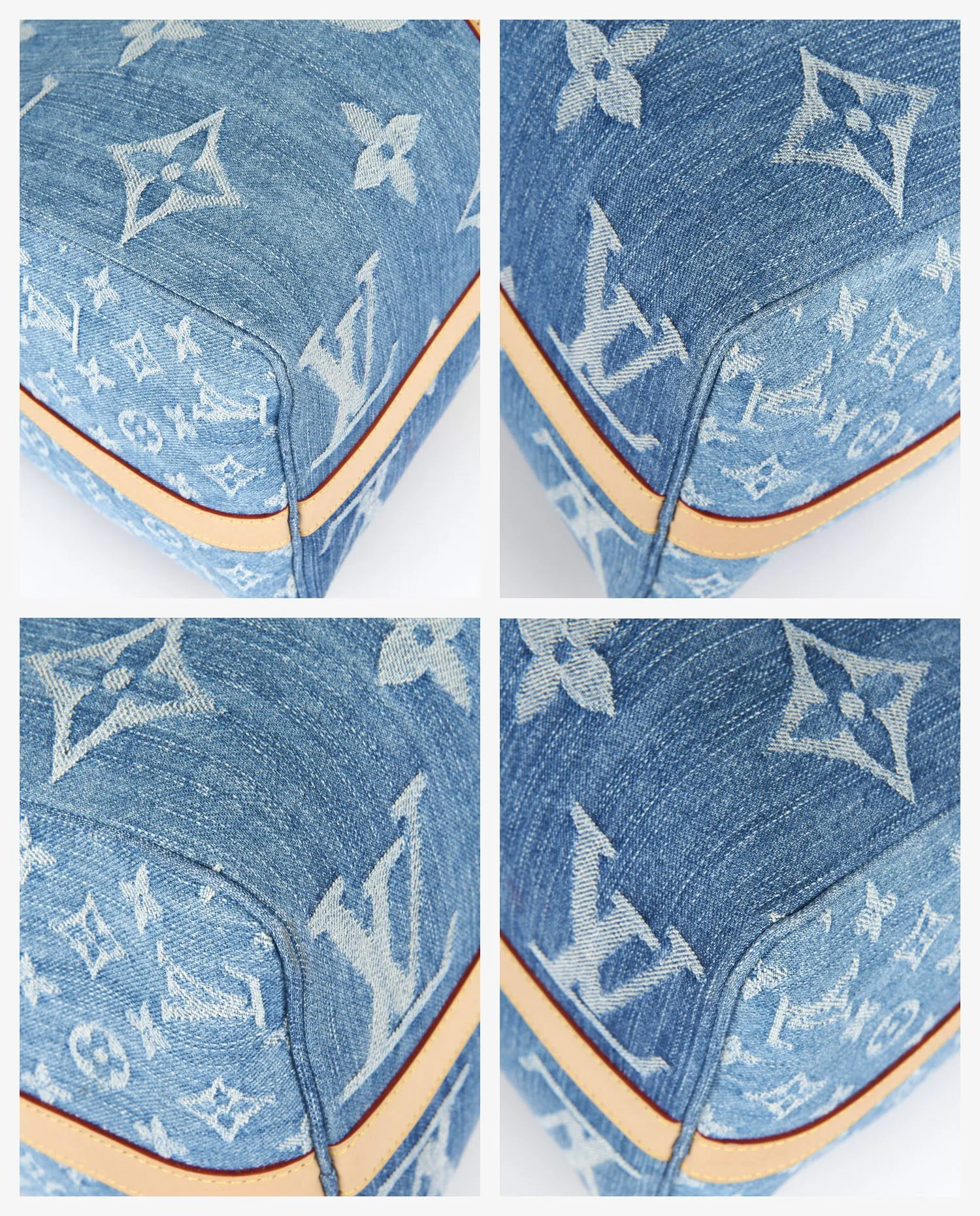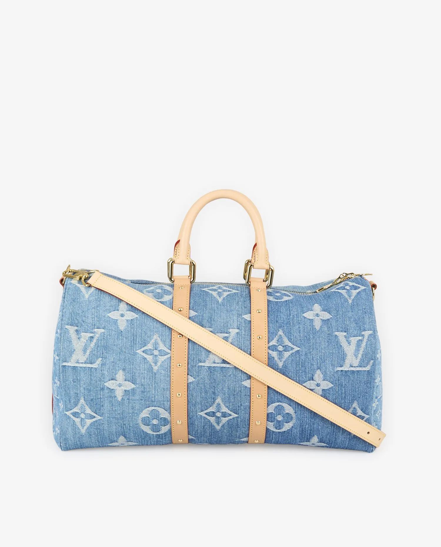 La toile de denim affiche un Monogram oversize sur les deux faces principales ainsi que sur le dessous, créant un impact visuel fort. Les côtés du sac arborent un Monogram plus fin, resserré, qui apporte une variation discrète et raffinée. Deux larges bandes verticales en cuir de vache naturel, encore clair car non patiné, parcourent les extrémités du sac. Chaque bande est ponctuée d’une série de rivets dorés parfaitement alignés, qui se prolongent sur les faces et accentuent la structure du sac sans alourdir la ligne. Les poignées roulées, la bandoulière amovible avec épaulière, et l’étiquette de bagage sont également en cuir naturel. Les pièces métalliques — fermetures éclair, mousquetons, cadenas gravé — sont en laiton doré poli, sans trace d’oxydation ni rayure. L’ensemble est intégralement neuf.