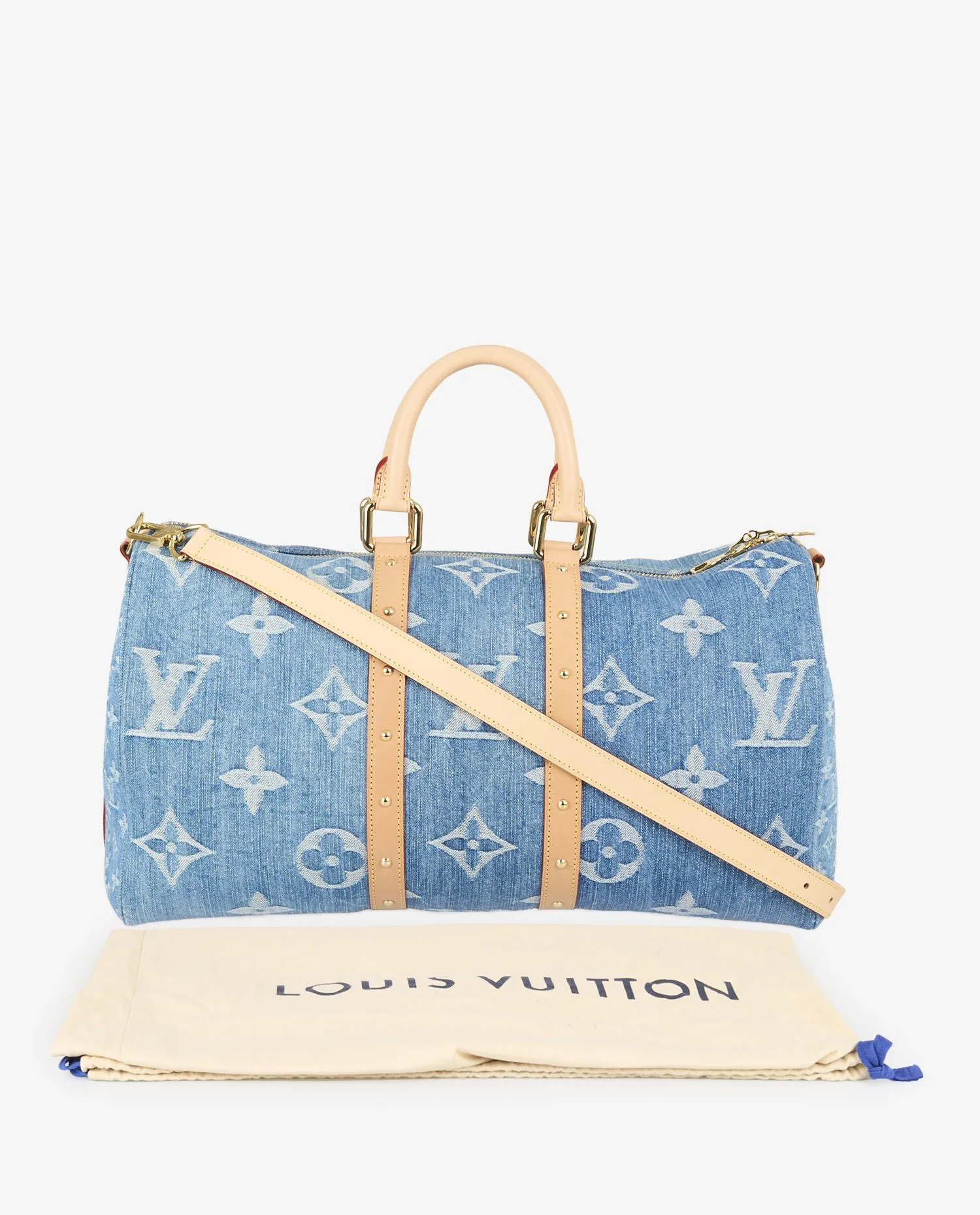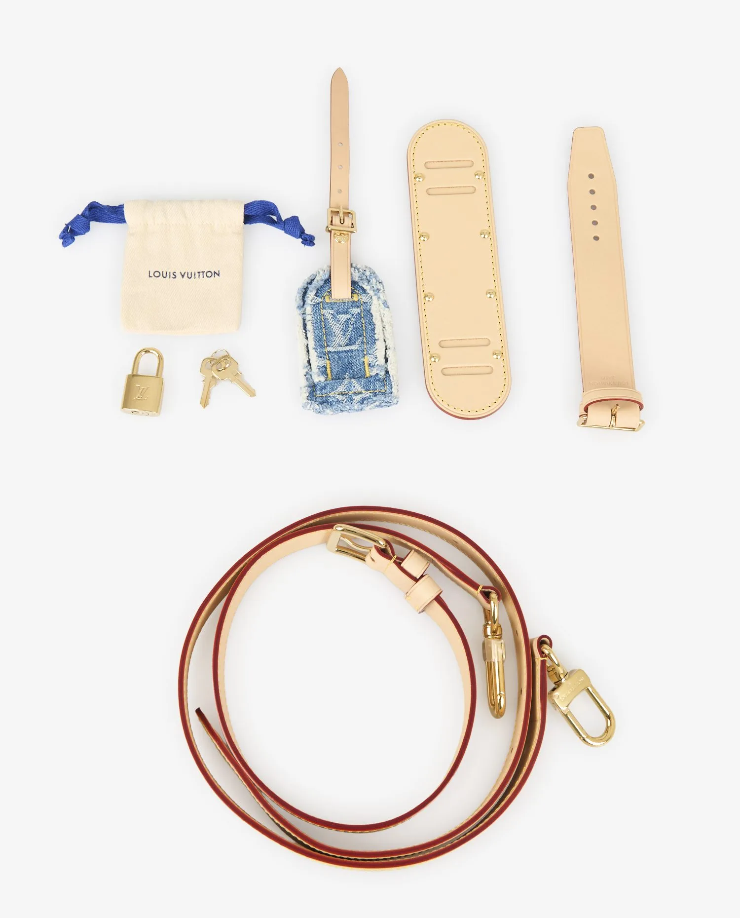Ce Keepall est en état strictement neuf, jamais porté. La toile denim conserve son aspect d’origine, sans décoloration ni trace de manipulation. Le cuir naturel est clair, non marqué, sans début de patine. Les pièces métalliques sont intactes et brillantes. Tous les accessoires d’origine sont inclus : bandoulière ajustable, épaulière, cadenas avec clés, étiquette de bagage assortie en denim et dustbag Louis Vuitton.