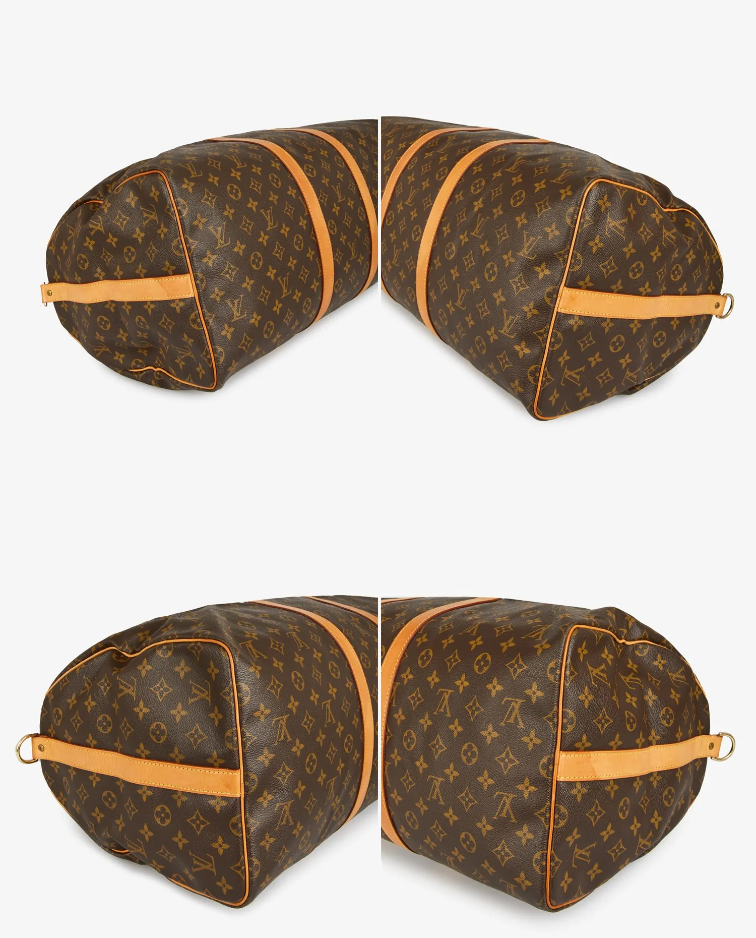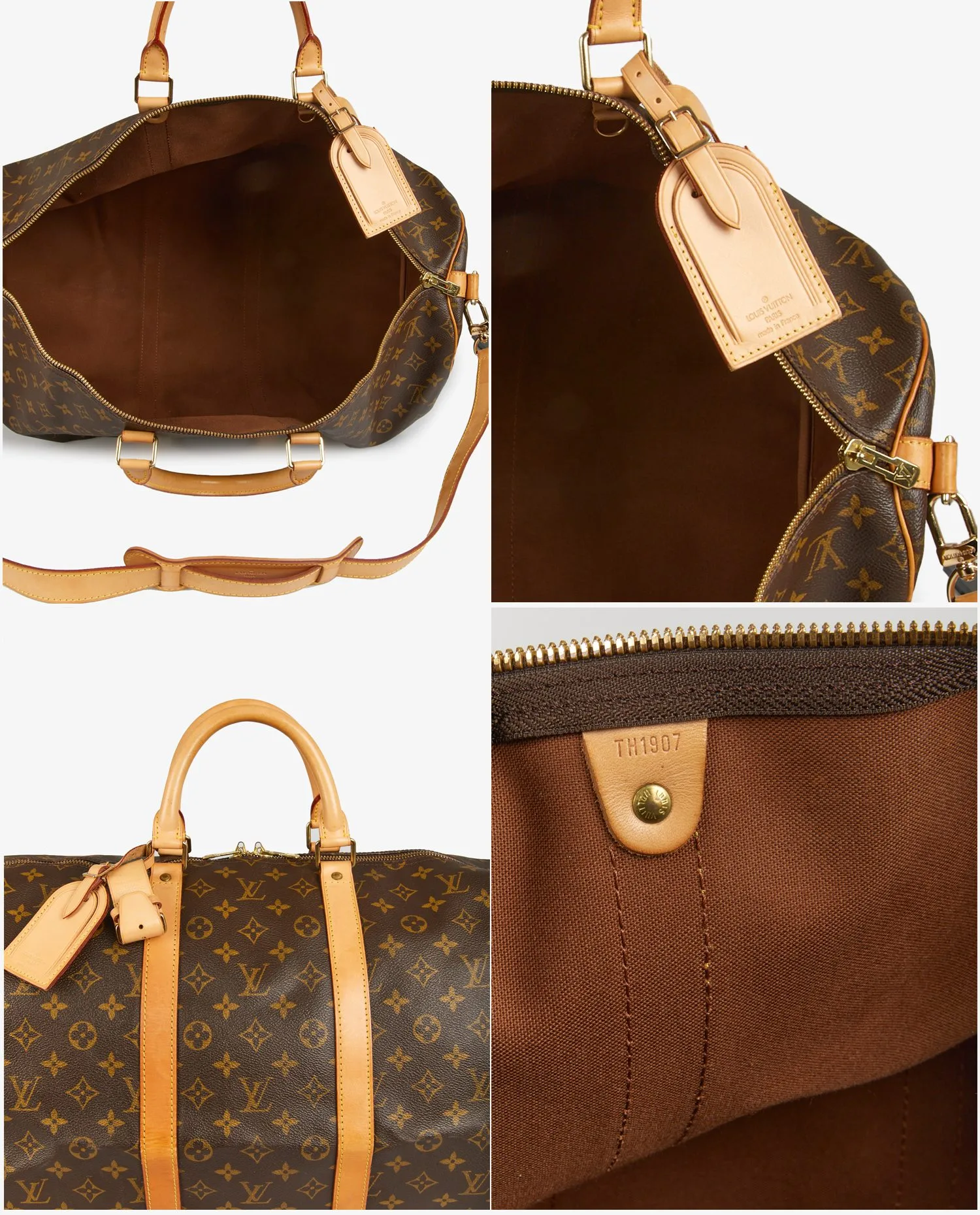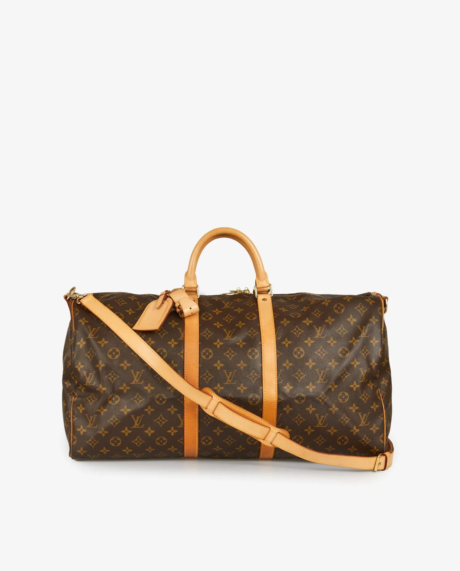 Sac Keepall 55 bandoulière Louis Vuitton en toile monogramme et finitions en cuir de vache naturel. Idéal pour prendre l’avion et pour glisser vos essentiels. En très bon état.