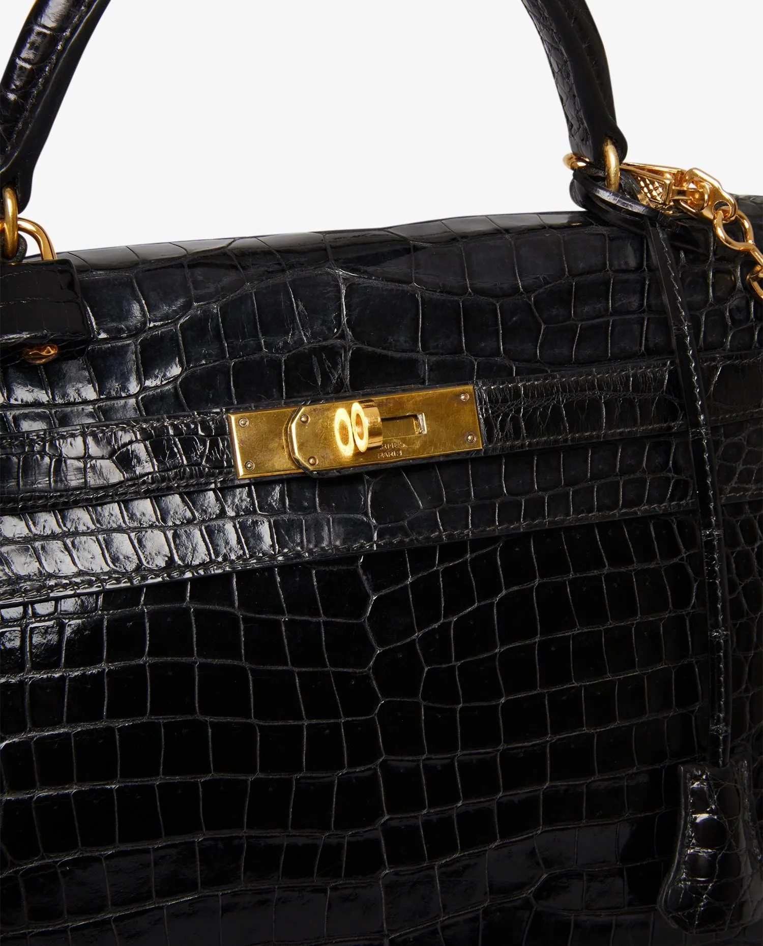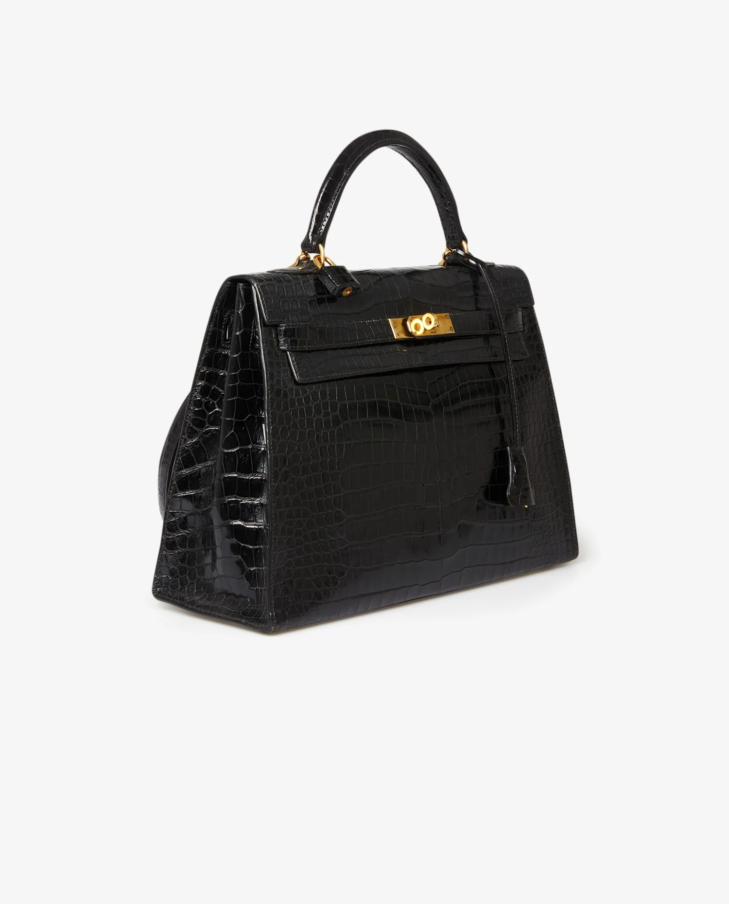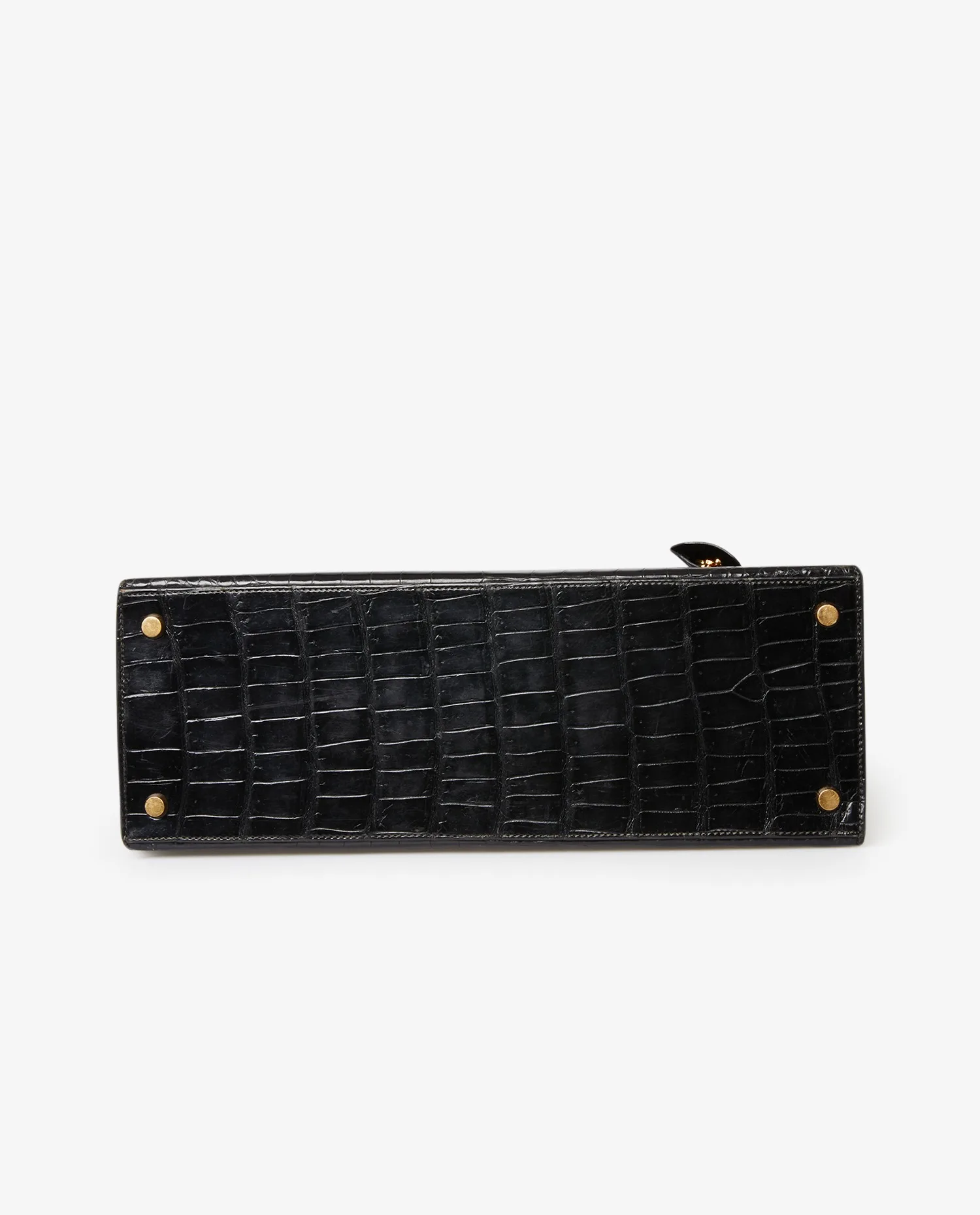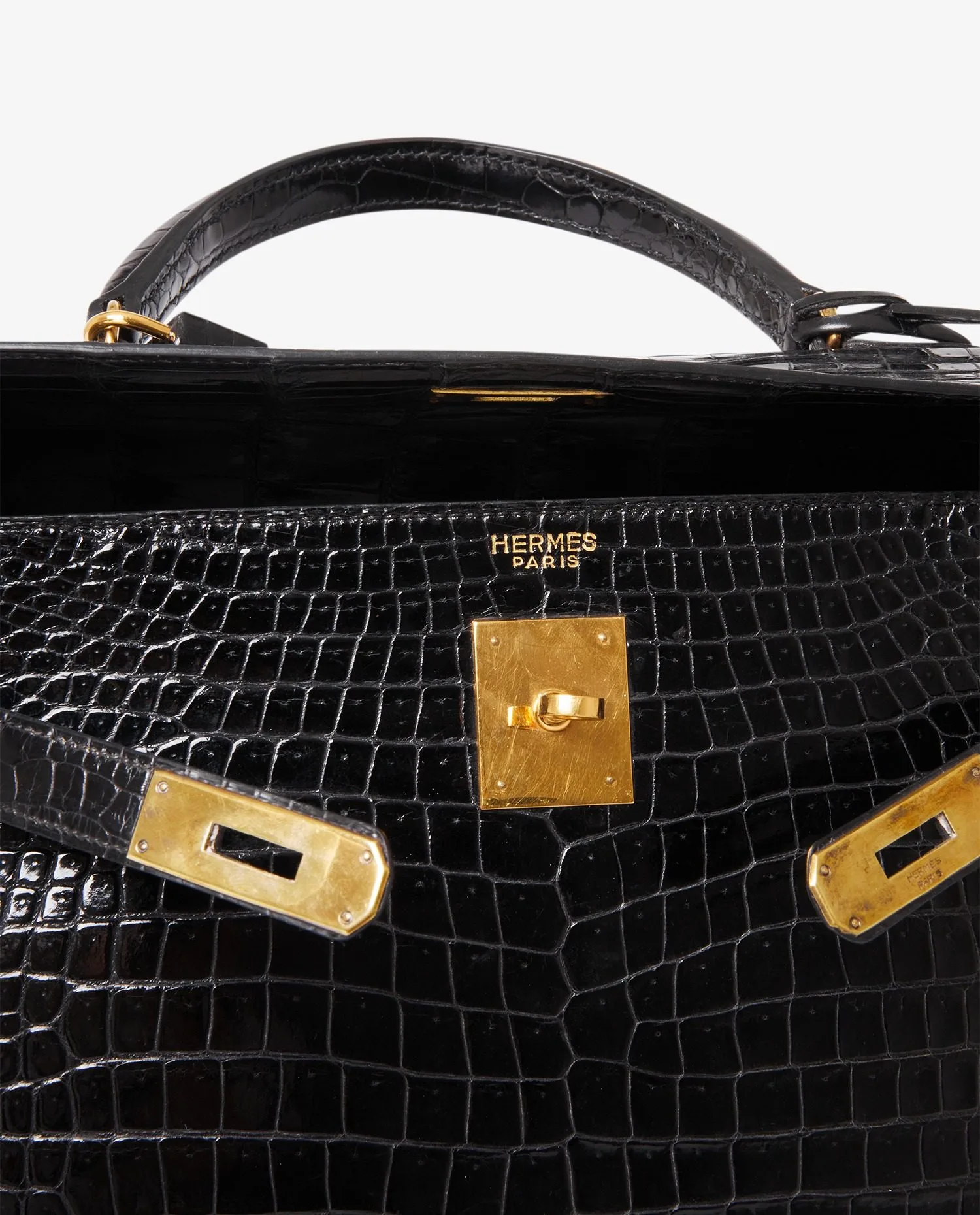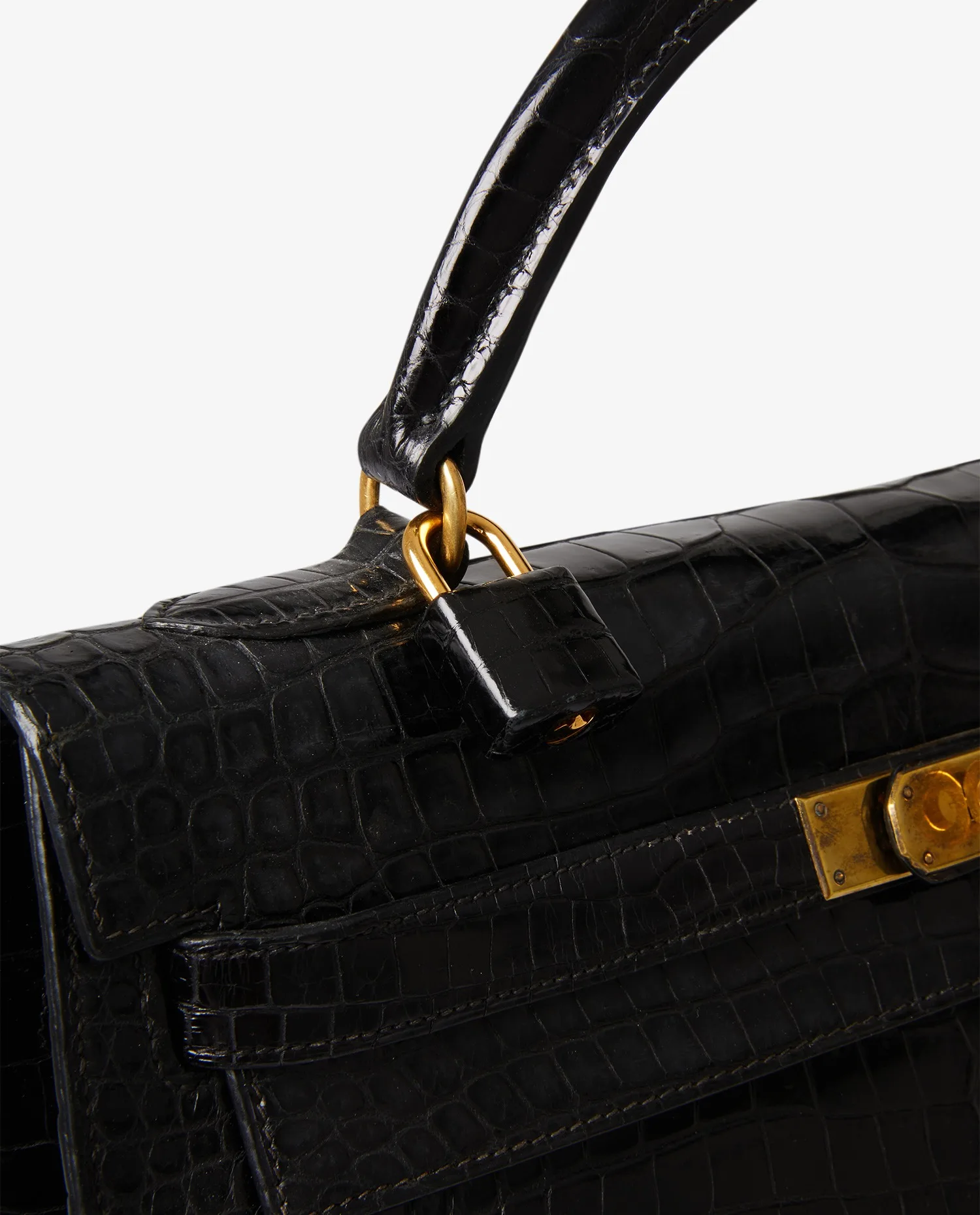 Sac Kelly 32 de la Maison Hermès en crocodile porosus noir. La lettre est absente sur la languette car il date de circa 1945. Il peut se porter à la main ou à l’épaule à l’aide d’une bandoulière amovible qui mesure 95cm. Tirette, clochette, clefs et cadenas. Il est en très bon état. Deux petites griffures sont visibles au dessus du fermoir. Très légère usure des coins sous le sac.