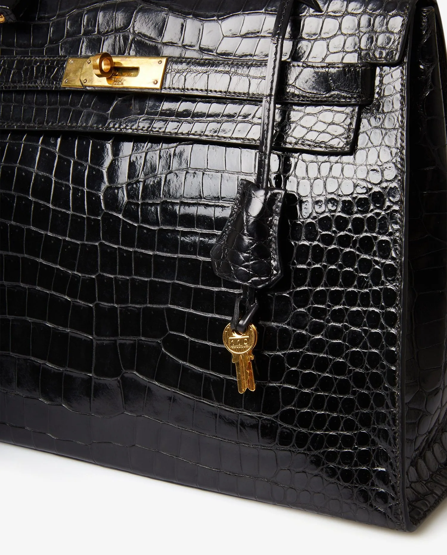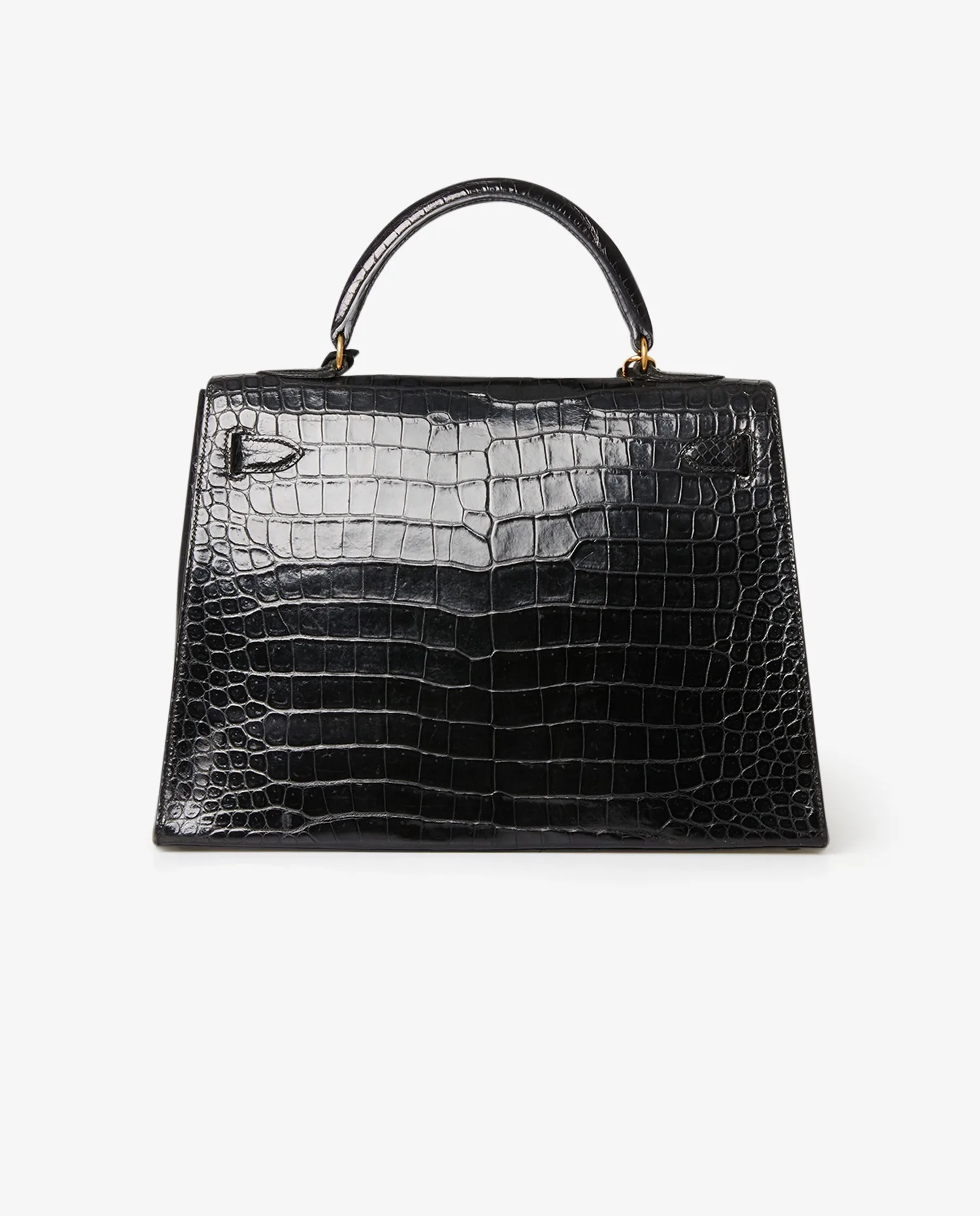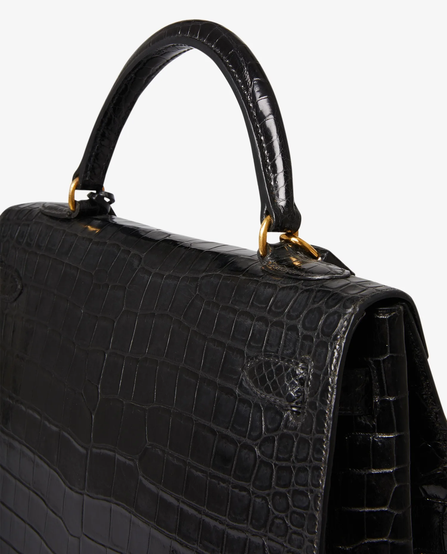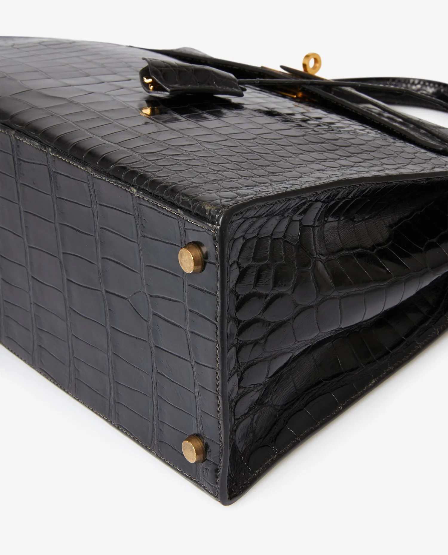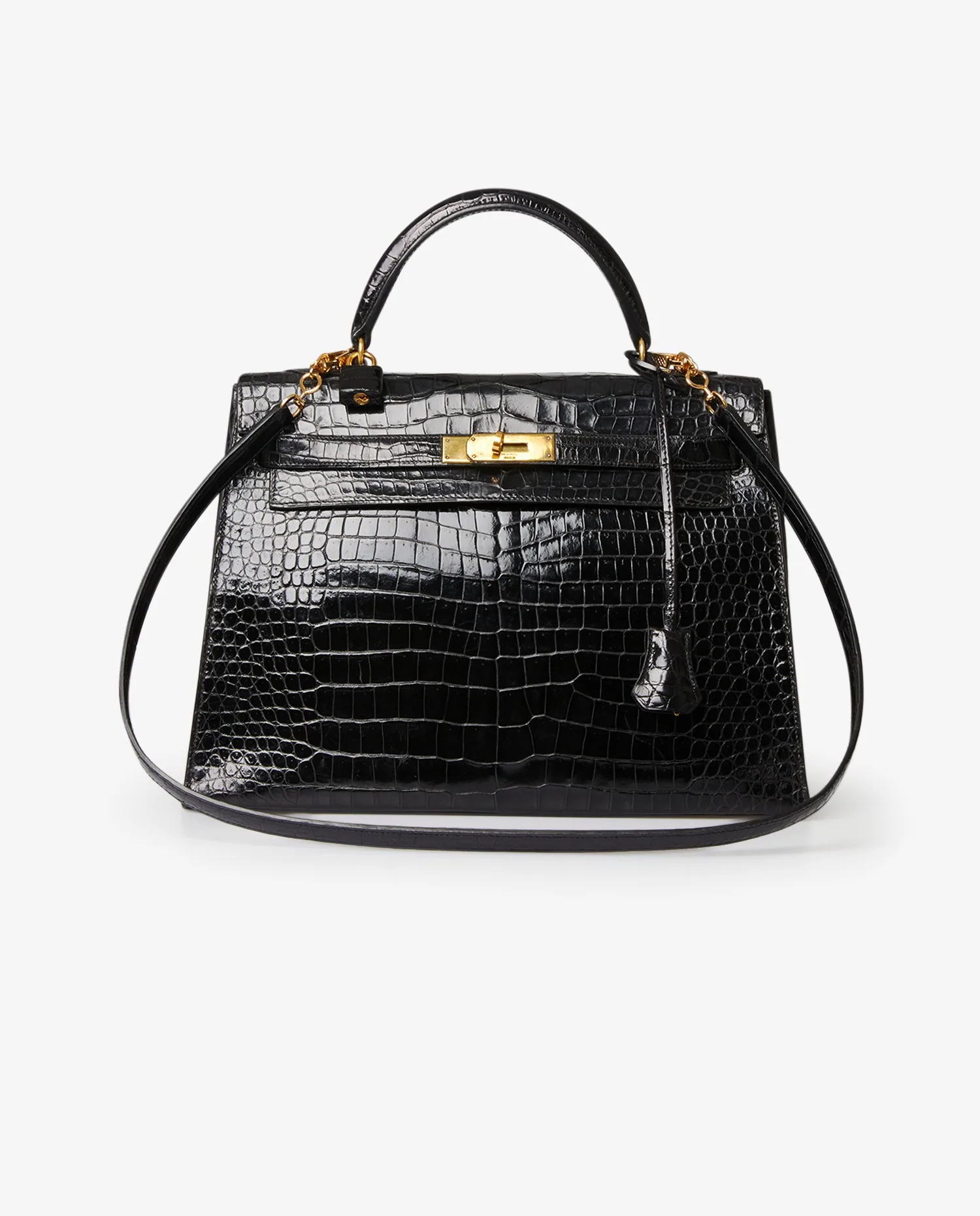 Sac Kelly 32 de la Maison Hermès en crocodile porosus noir. La lettre est absente sur la languette car il date de circa 1945. Il peut se porter à la main ou à l’épaule à l’aide d’une bandoulière amovible qui mesure 95cm. Tirette, clochette, clefs et cadenas. Il est en très bon état. Deux petites griffures sont visibles au dessus du fermoir. Très légère usure des coins sous le sac.