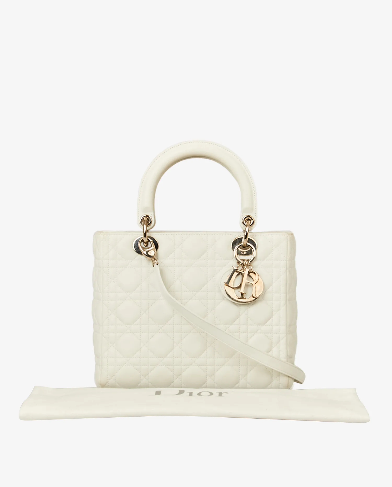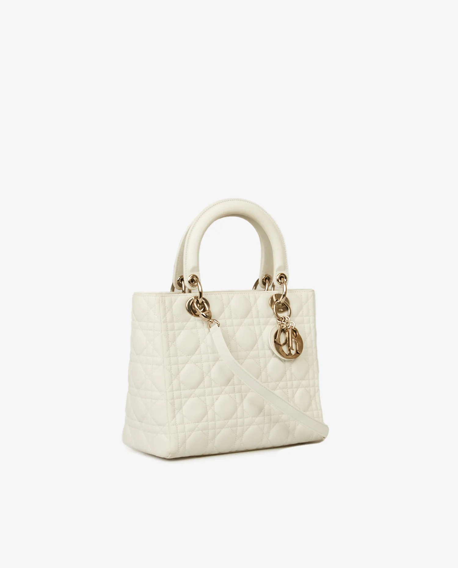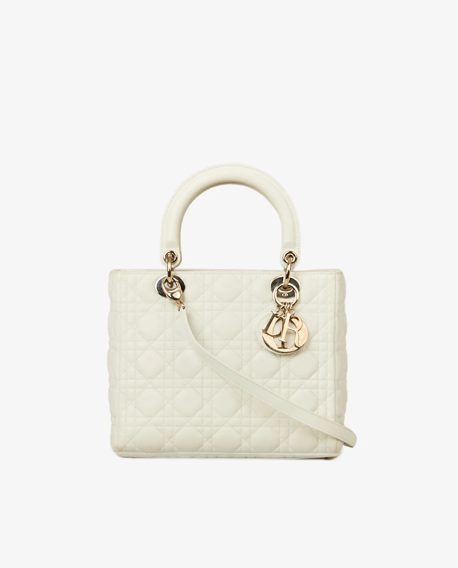 Sac Lady Dior vintage cannage blanc. Taille médium. Porté à la main ainsi qu’à l’épaule à l’aide d’une bandoulière amovible (90cm). En très bon état.