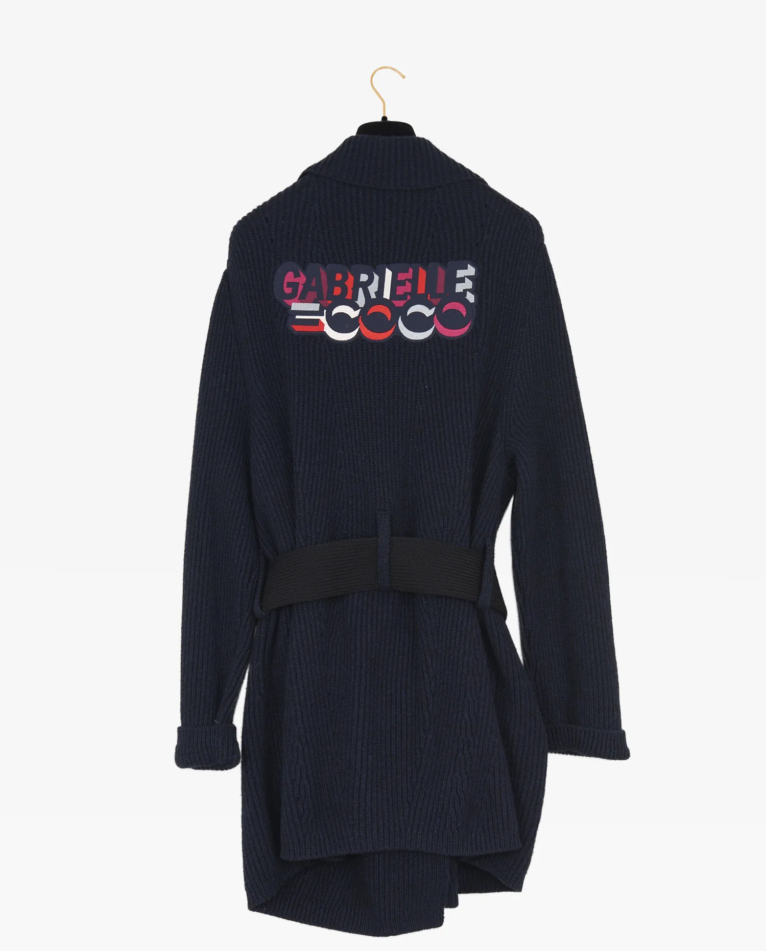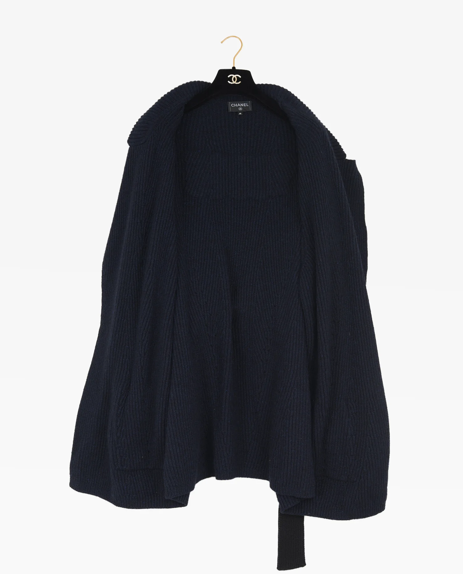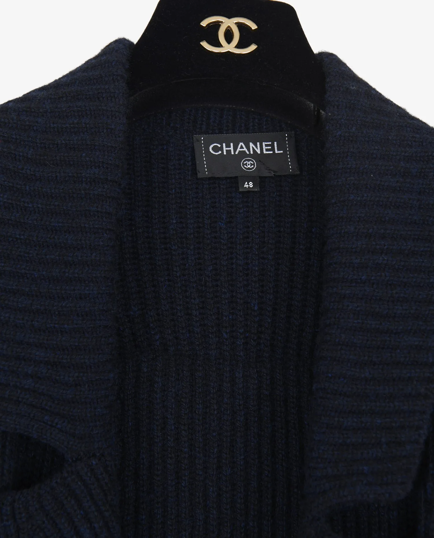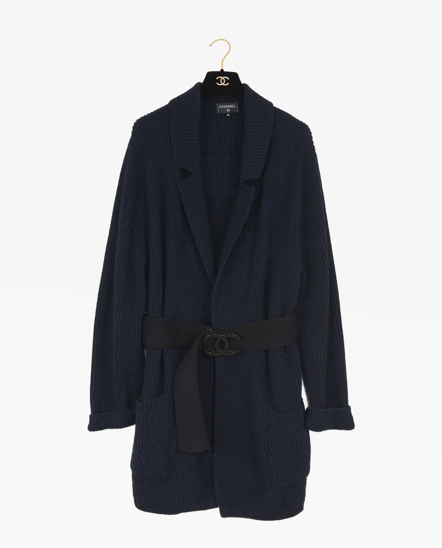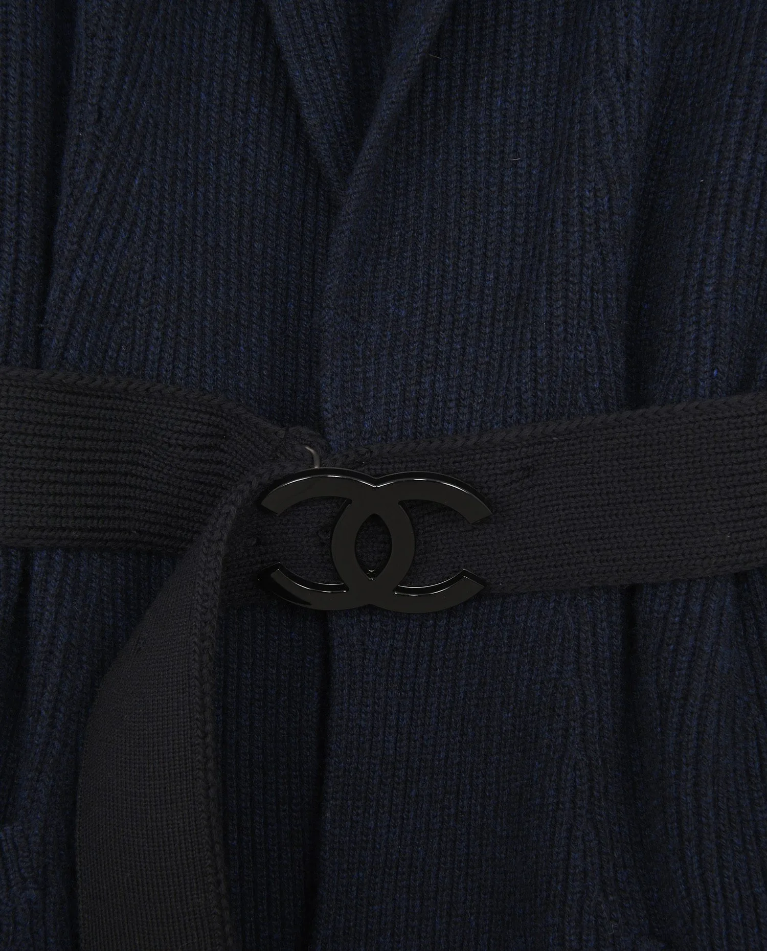 Le gilet présente une couleur bleu marine profonde, obtenue par une densité de fil serrée qui donne une texture confortable et isolante. La coupe est droite, prolongée par une ceinture d’aspect plus lisse, contrastant légèrement avec la maille. La boucle noire aux doubles « C » est un élément de reconnaissance visuelle direct de Chanel, sans être ostentatoire. Les manches sont longues et les épaules tombantes, ce qui renforce l’effet décontracté du vêtement. Les poches plaquées en bas du gilet s’intègrent visuellement à la maille sans interrompre les lignes.